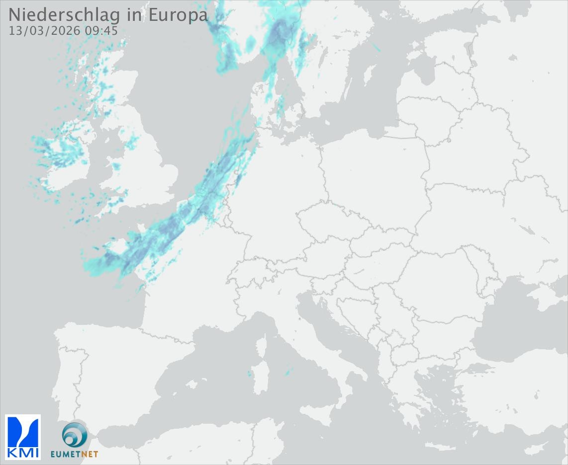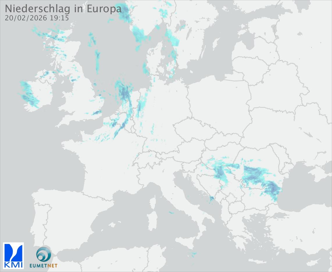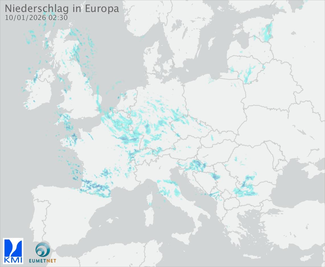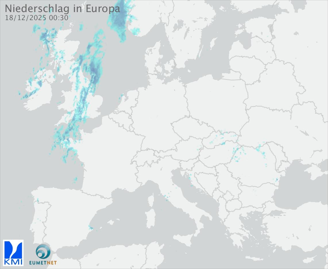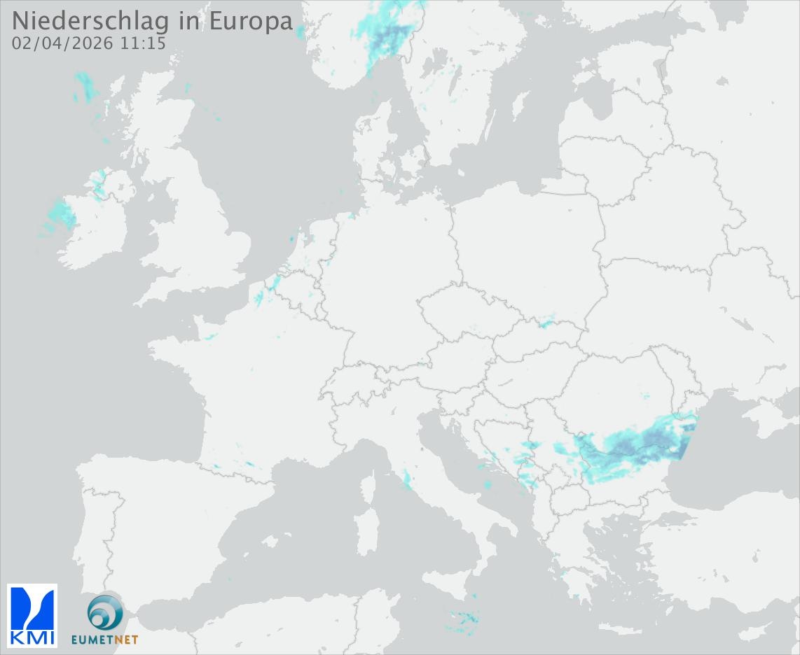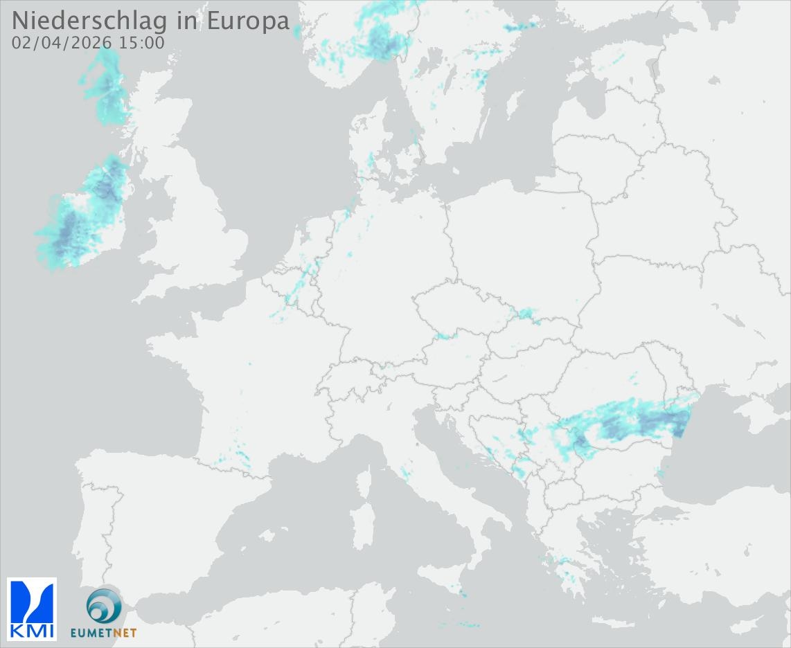 Diese Animation zeigt den gefallenen Niederschlag, gemessen durch die Regenradargeräte der europäischen Teilnehmer des Eumetnet-Programms OPERA (in 15-Minuten-Intervallen).
