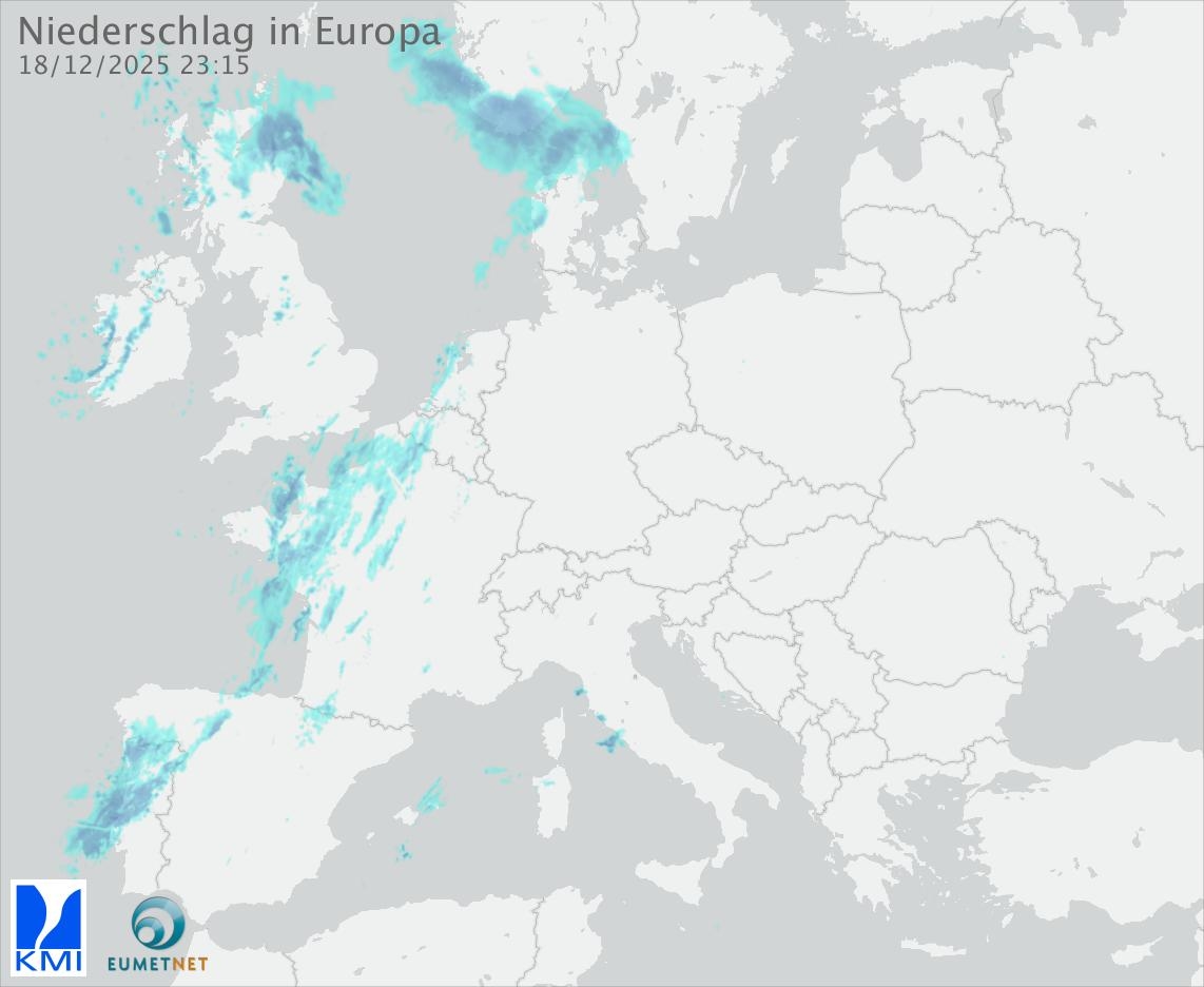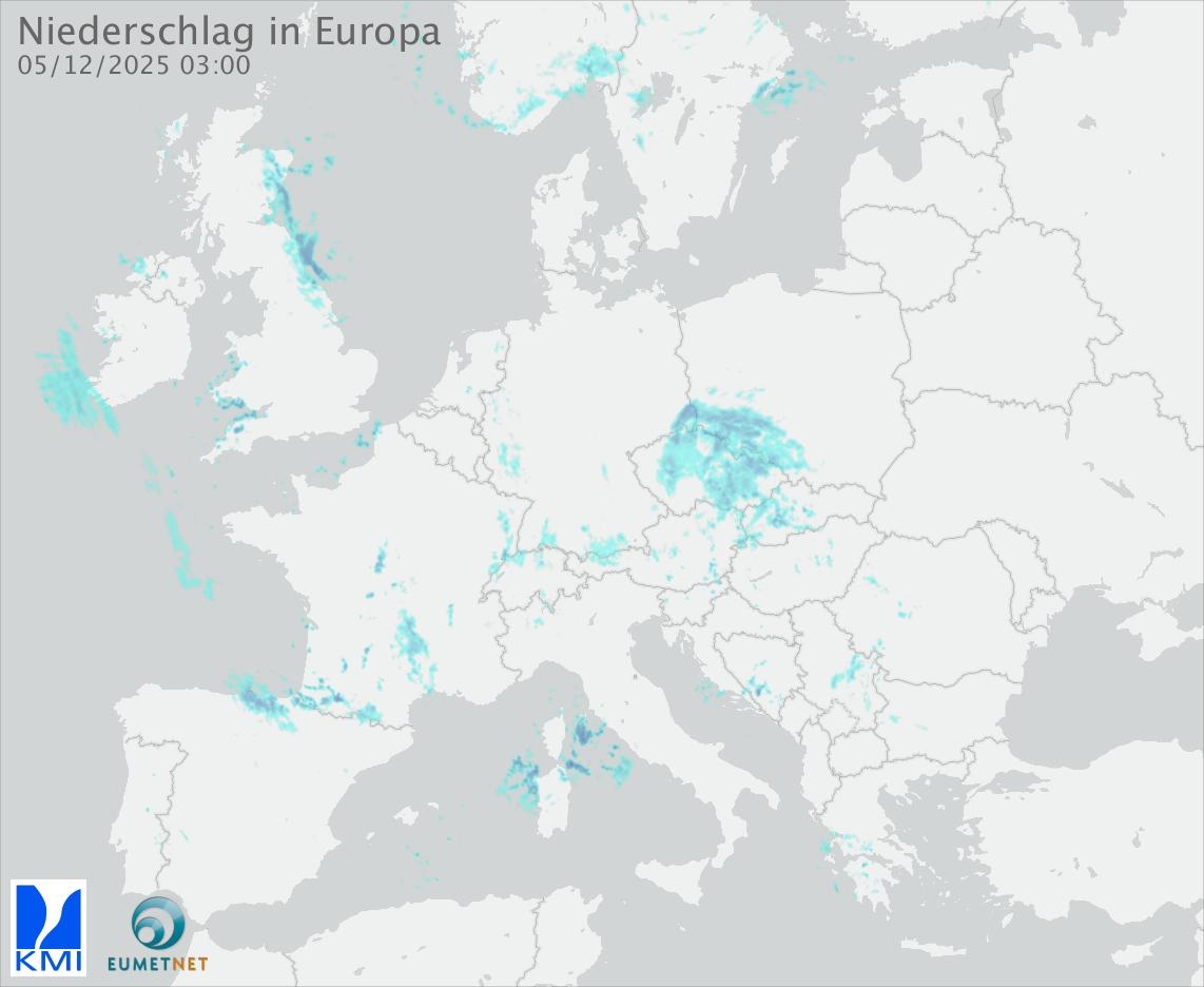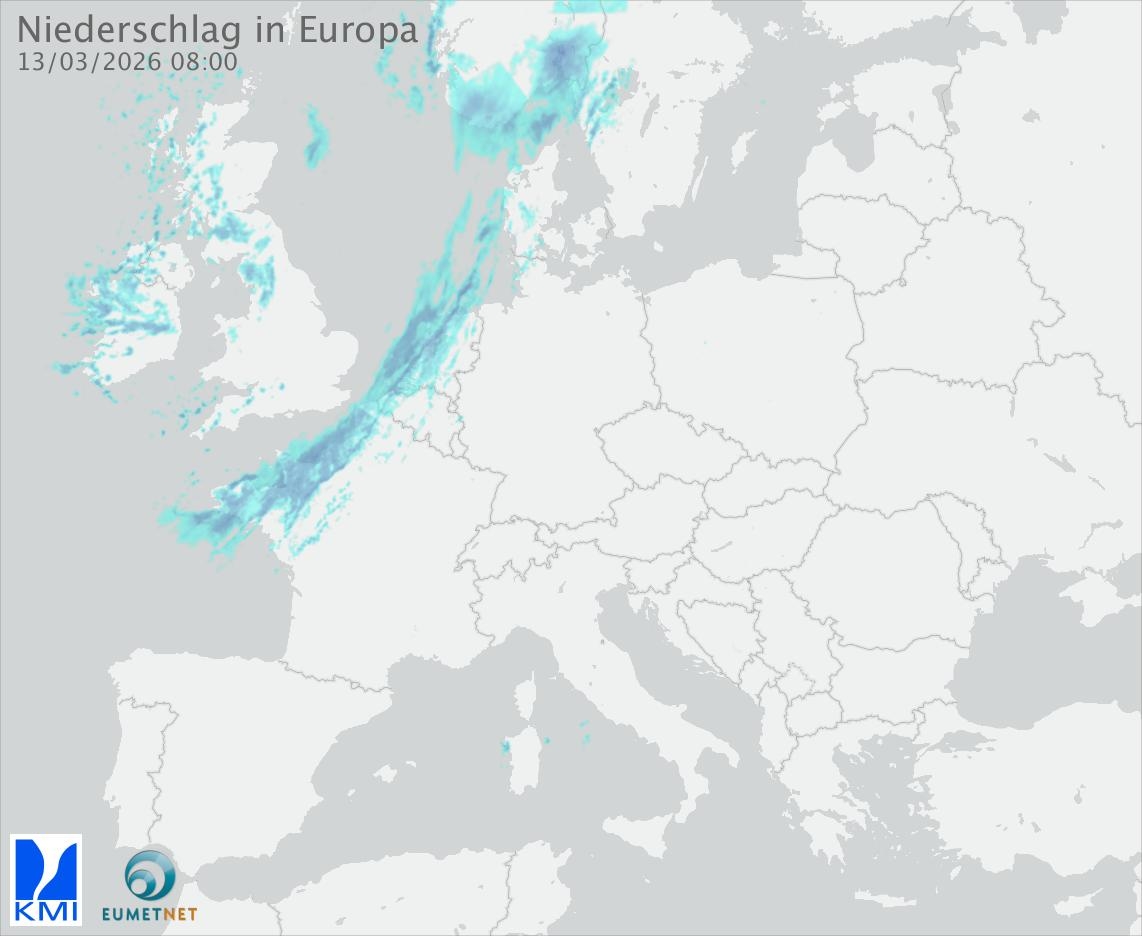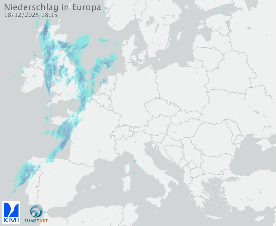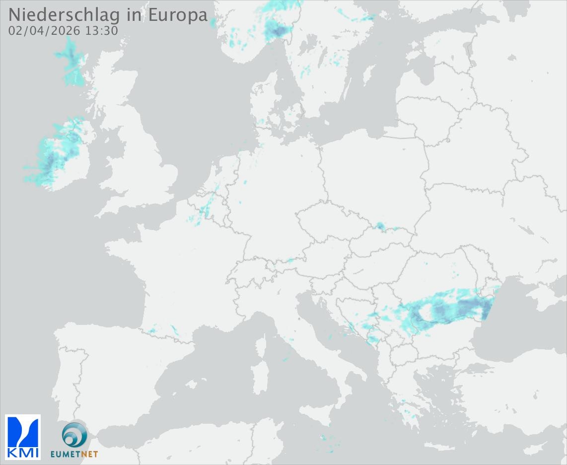 Diese Animation zeigt den gefallenen Niederschlag, gemessen durch die Regenradargeräte der europäischen Teilnehmer des Eumetnet-Programms OPERA (in 15-Minuten-Intervallen).