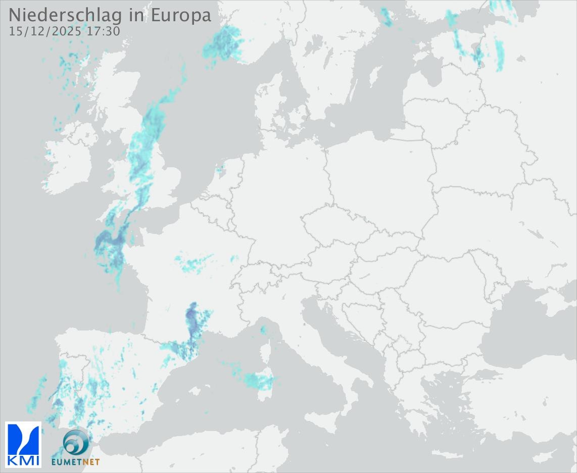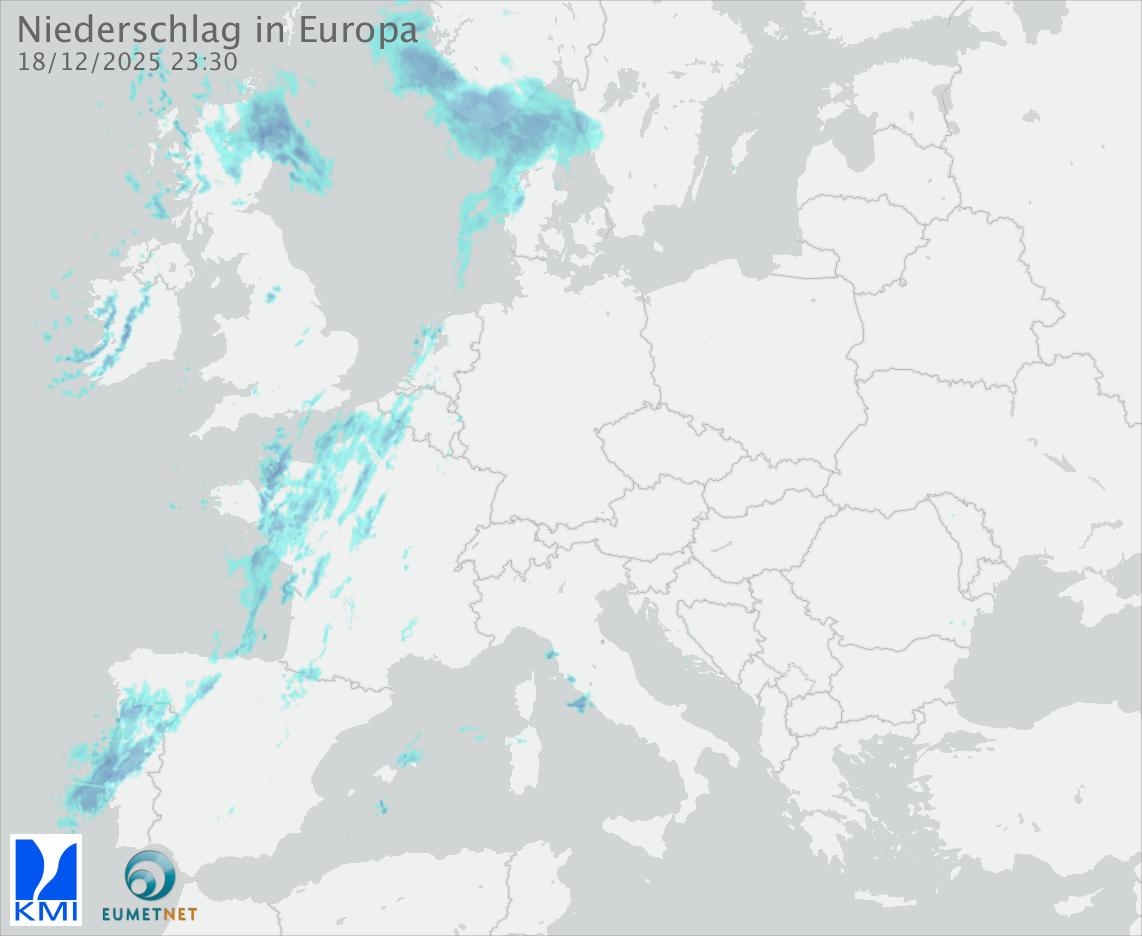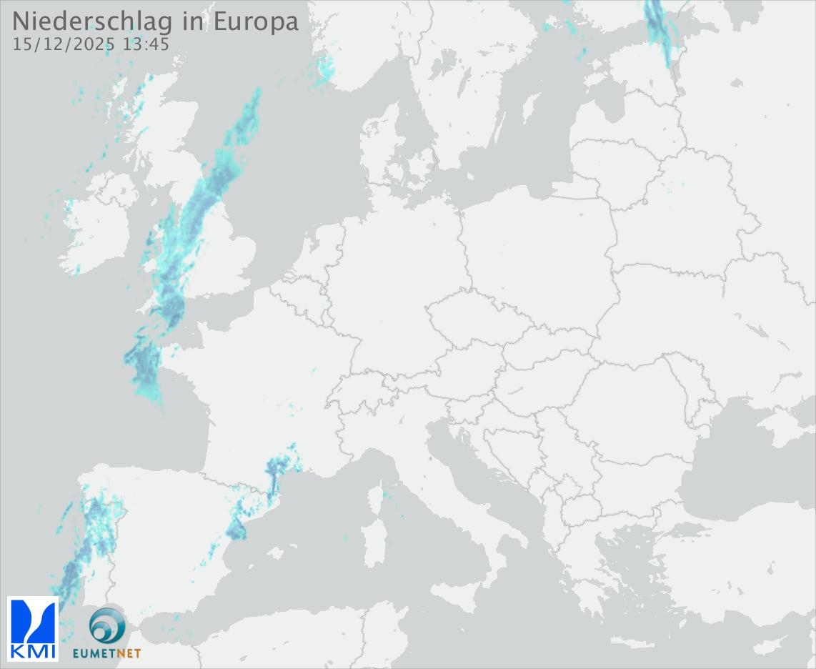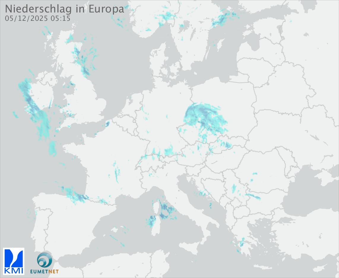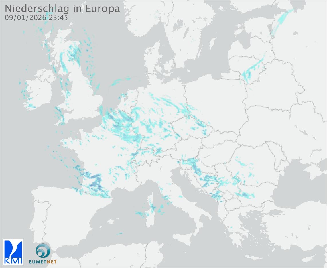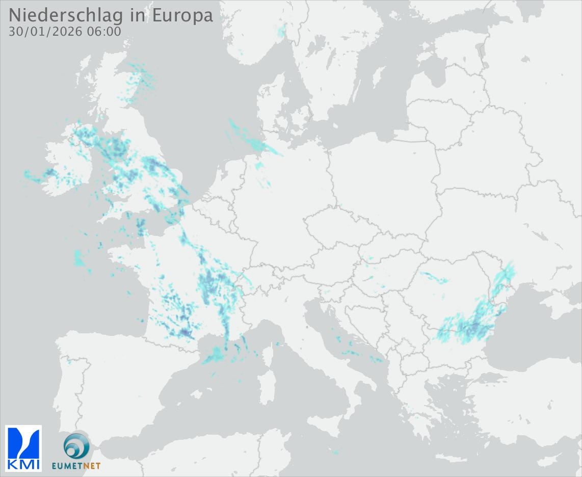 Diese Animation zeigt den gefallenen Niederschlag, gemessen durch die Regenradargeräte der europäischen Teilnehmer des Eumetnet-Programms OPERA (in 15-Minuten-Intervallen).