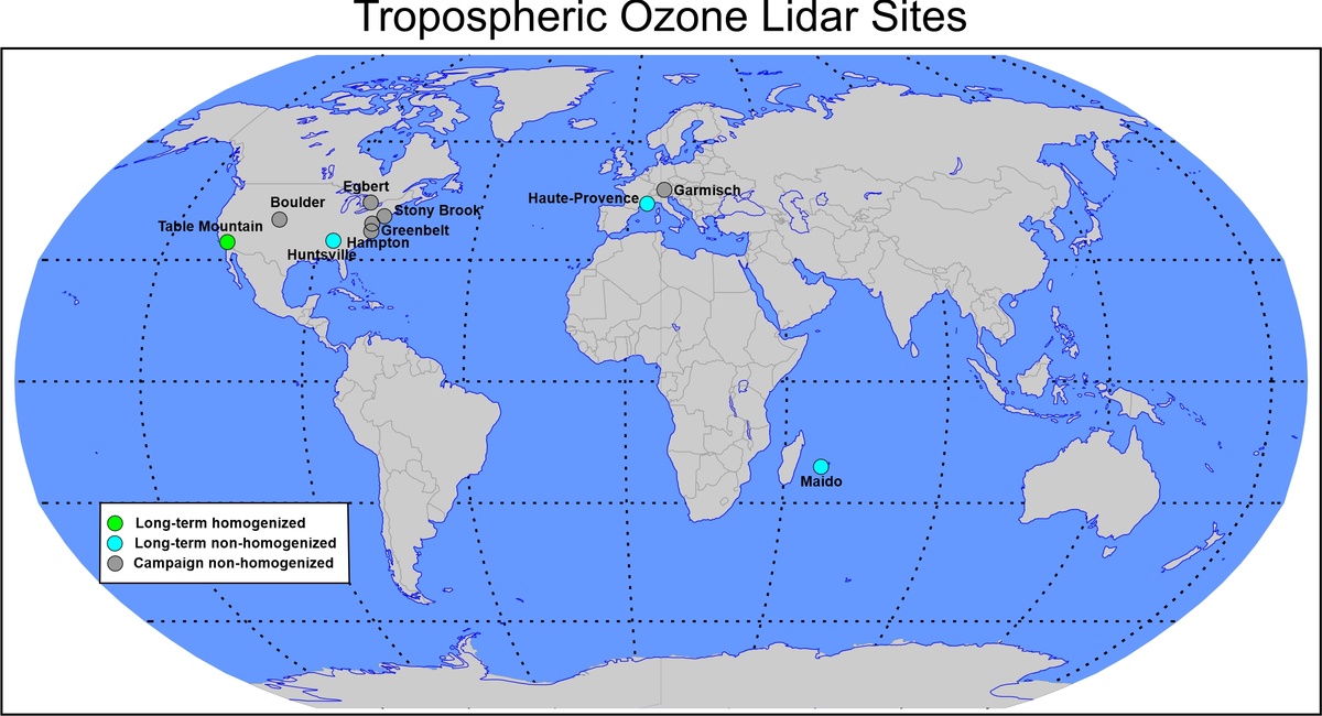 Map showing the location of Lidars measuring tropospheric ozone.