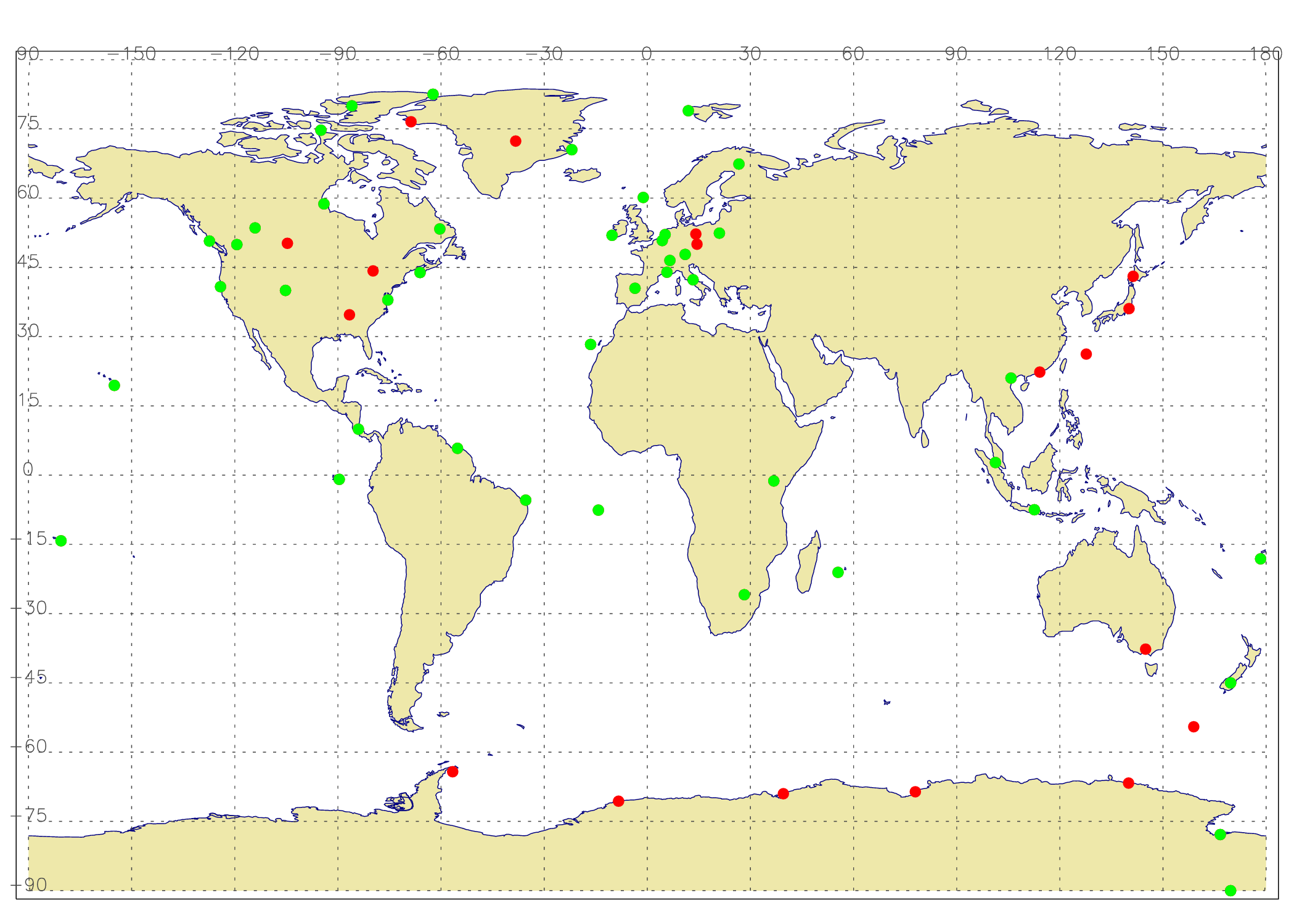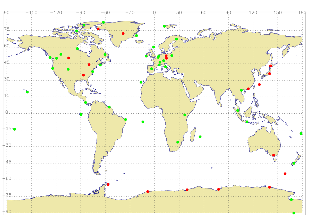 Global map of around 60 active ozonesonde sites. Green dots mark the stations with homogenized data available at the HEGIFTOM ftp-server.