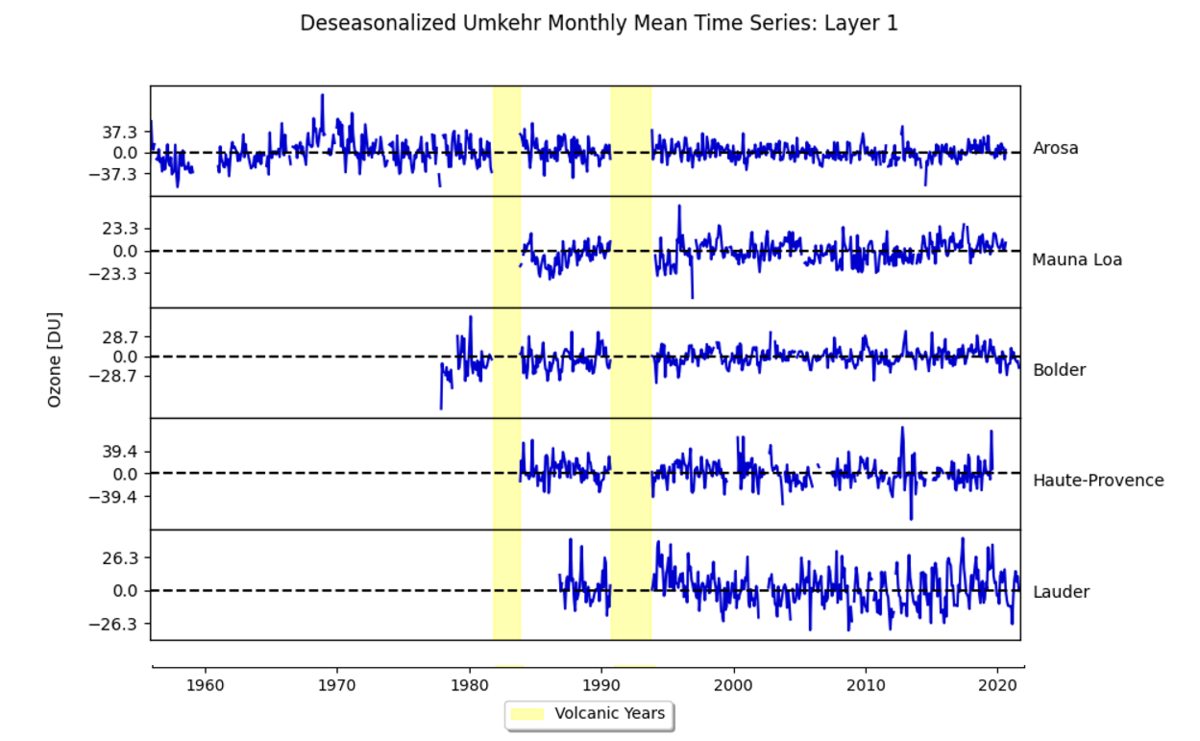 Deseasonalized monthly mean ozone amounts [DU] in the first Umkehr layer (between 1000 and 250hPa) of a selection of Dobson/Brewer sites.