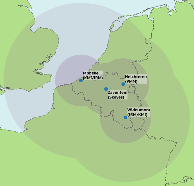 The map below shows the locations of the Belgian radars. The dark grey areas indicate the 100-km ranges at which the radars can generally provide quantitative precipitation measurements. The light grey areas show the full radar coverage.