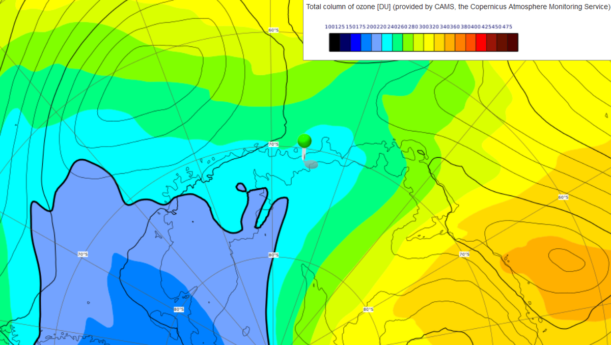 Meanwhile we have already been busy with the instruments. Yesterday we checked the Brewer spectrophotometer, to observe the total ozone column (Fig. 2-1). We could see that we are pretty close now from the ozone hole, according the the CAMS forecast (Fig. 2-2). Observations from the Brewer show that this is indeed the case.