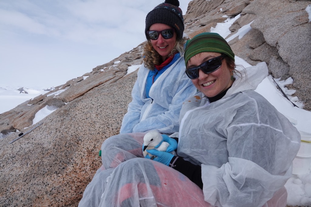 Two such researchers taking part in the BELARE 2021-22 expedition are Eleanor Maedhbh Honan, an Irish PhD researcher from Durham University and Stephanie Prince from the Royal Society for the Protection of Birds in the UK. Eleanor and Stephanie are working for the ANTSIE project, studying the behavioural ecology of the snow petrels and how climate change may affect the colonies present in the Sør Rondane Mountains. For their work they focus on pairs breeding on Utsteinen Nunatak, just 800 metres from the Princess Elisabeth Station. Here they deploy tracking devices on the petrels to better understand how the petrels use the sea ice environment, alongside collecting diet samples from the petrels. The focus of their research is the Antarctic ‘mumiyo’ deposits – large blocks of solidified snow petrel stomach oil which build up outside the petrel nests and record the occupation of the site over thousands of years. By analysing the geochemistry of these deposits, snow petrel diet can be tracked through time, and the species response to changing sea-ice conditions can be examined. The ANTSIE project represents the first project of its kind in the region, and despite the inclement weather this season has already provided some fascinating data.