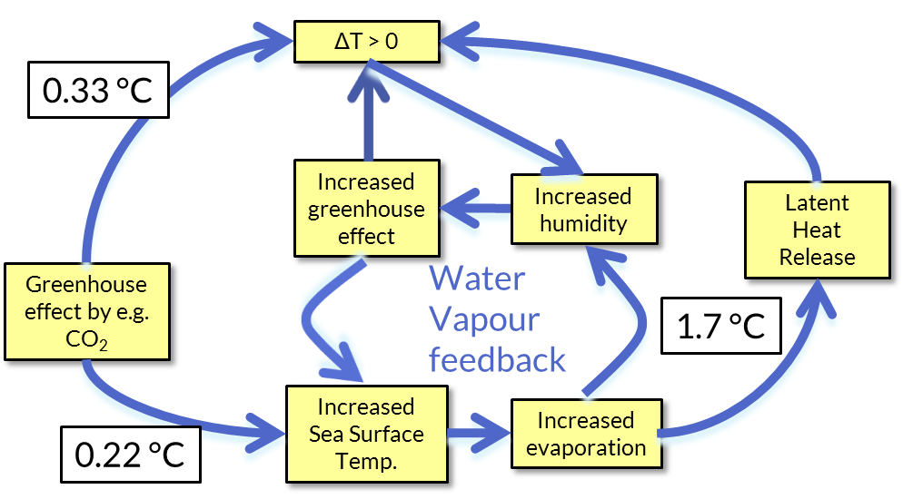 Although the actual amount of water vapour in the atmosphere is relatively low (~1%), water vapour is one of the most crucial greenhouse gases, and numerous scientific studies have determined that around 60-70% of atmospheric warming can be attributed to the atmospheric water vapour greenhouse effect. Moreover, warmer air can contain also more water vapour than cold air (this is the Clausius-Clapeyron equation, stating that the water holding capacity increases at about 7% per degree Celsius increment in temperature). In addition, evaporation will increase for higher temperatures where water is available (from oceans, lakes, plants, soils, etc.). Combining these effects leads to a positive water vapour feedback mechanism, by which an initial surface warming due to increasing levels of greenhouse gases like CO2 and methane, is amplified by 2 to 3 times! It should be clear that water vapour plays a vital role in the global climate system and climate model predictions. And we have not yet mentioned the role of water vapour in the climate models for the amount of cloud formation, precipitation, reflection of sunlight from cloud tops, etc. Despite the large role of water vapour, the water vapour feedback mechanism and this cloud feedback mechanism remain the largest sources of uncertainty in climate sensitivity estimates.