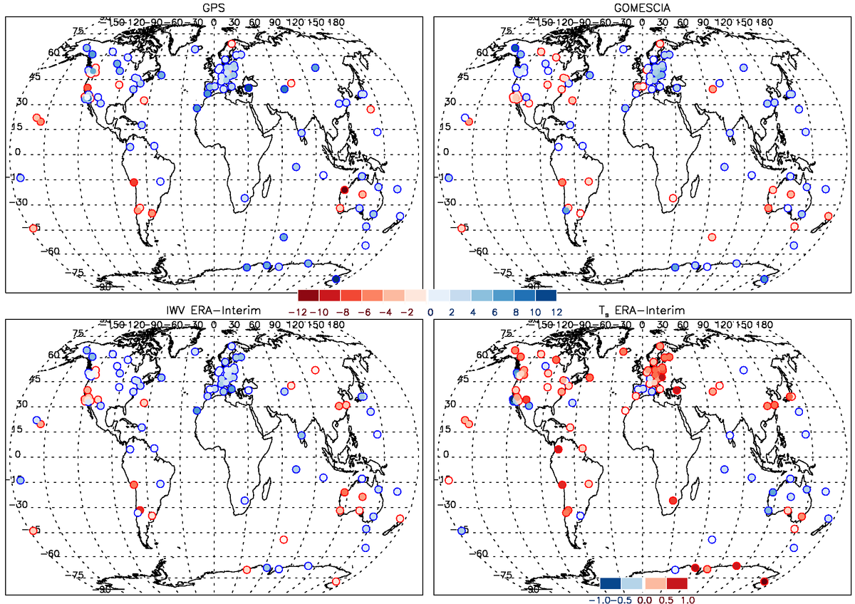 We also calculated the IWV trends for the same datasets, but now for a the global International GNSS Service (IGS) network. These trends, again with the surface temperature trends, are shown in Fig. 3 below. We can again conclude that the IWV trends follow the surface temperature trends globally, with IWV trend differences between different datasets. In this case, the GPS and ERA-Interim trends are the most similar, with GOMESCIA deviating most from the other two.