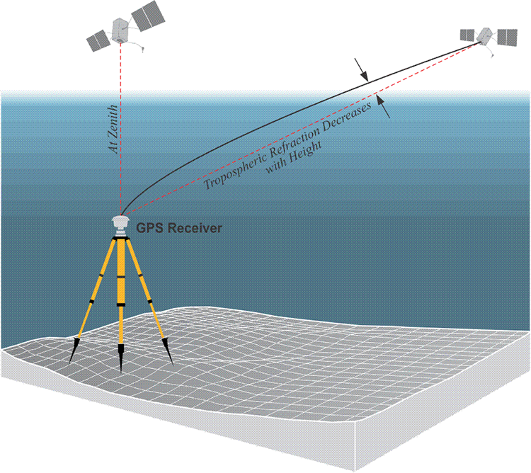 A signal between between a Global Navigation Satellite System (GNSS) satellite (of which the American Global Positioning System or GPS satellites were the pioneers) and a ground-based receiver is delayed along its path through the Earth's atmosphere by the ionosphere (a series of regions between 50 and 500 km that have a relatively large number of electrically charged atoms and molecules) and other "neutral" atmospheric layers. The ionospheric effects on the path delay can be eliminated using a combining of two GNSS frequencies. The remaining path delay depends on the integral effect of the densities of dry air, accounting for approximately 90% of the delay, and water vapour along the signal path. As one ground-based receiver can capture the time delays in multiple paths towards all GNSS satellites, those different "slant paths" between the receiver and the satellites are converted into the vertical direction (or zenith) by an elevation-dependent mapping function, hence resulting in a zenith total delay (ZTD) at the ground receiver site. As already noted above, also this measured zenith total delay can be reduced into two constituent parts: the zenith hydrostatic delay (ZHD, the dry part), and the zenith wet delay (ZWD, caused by the water vapour). Assuming hydrostatic equilibrium, the ZHD is easily modeled if the surface pressure is known. So, finally, the zenith wet delay is known (ZWD = ZTD - ZHD), and can then be transformed into integrated water vapour by making additional assumptions about the vertical temperature and humidity structure.