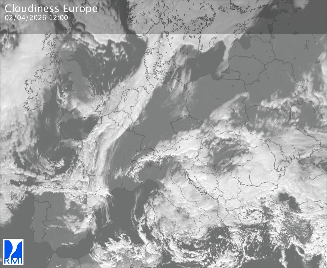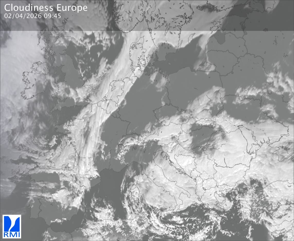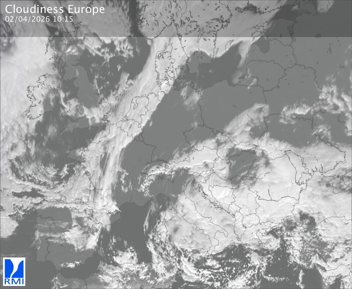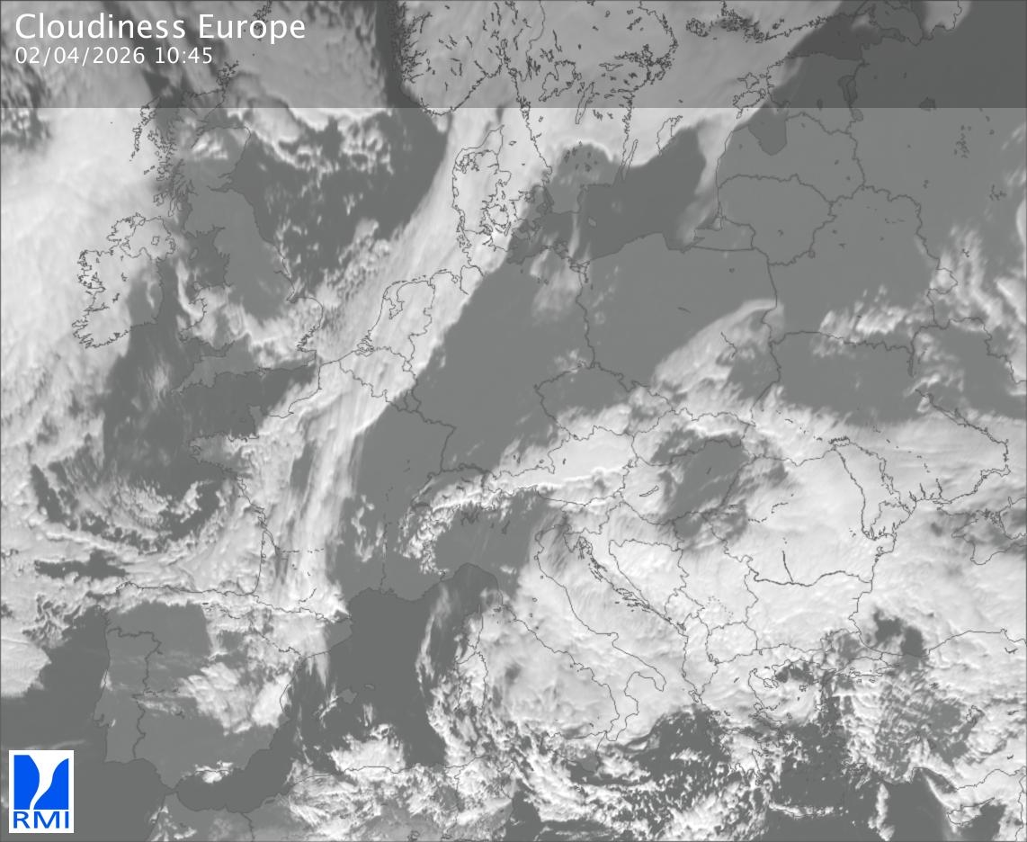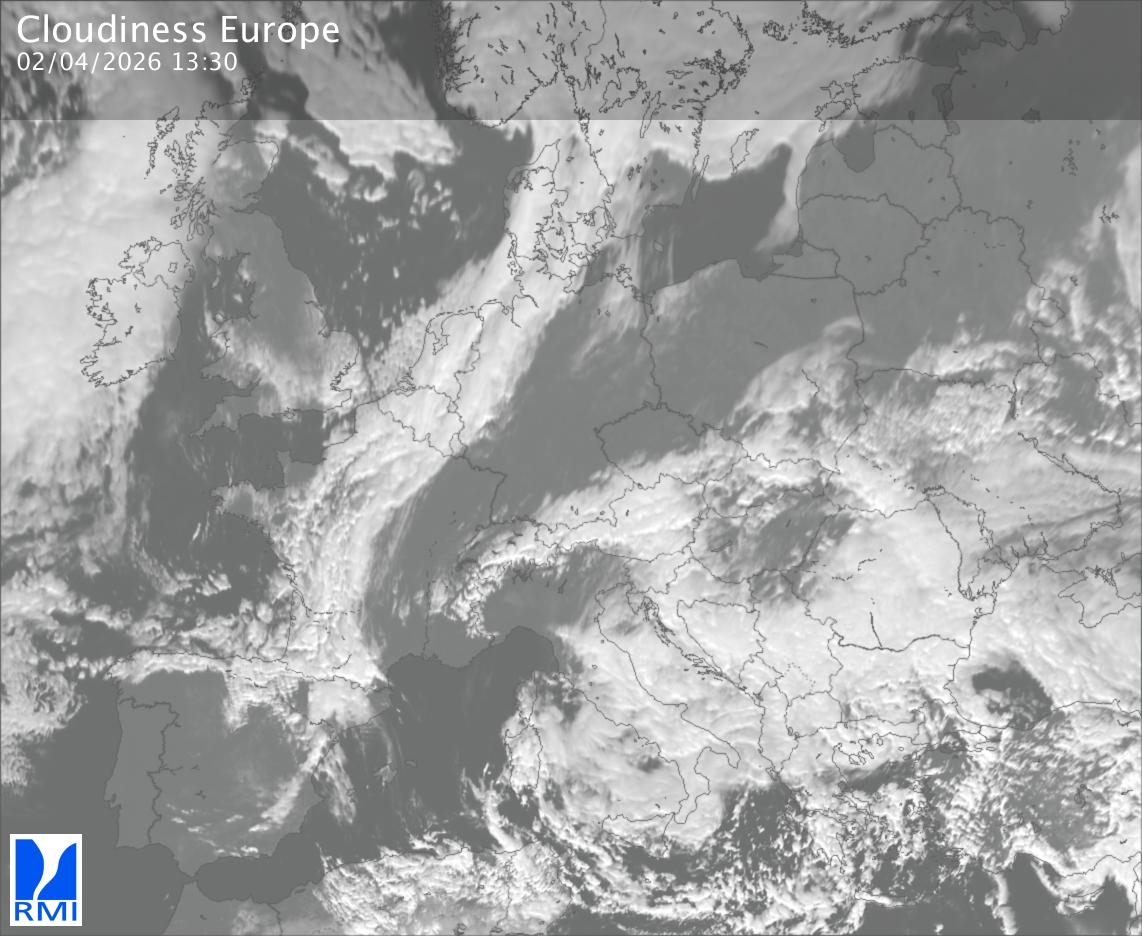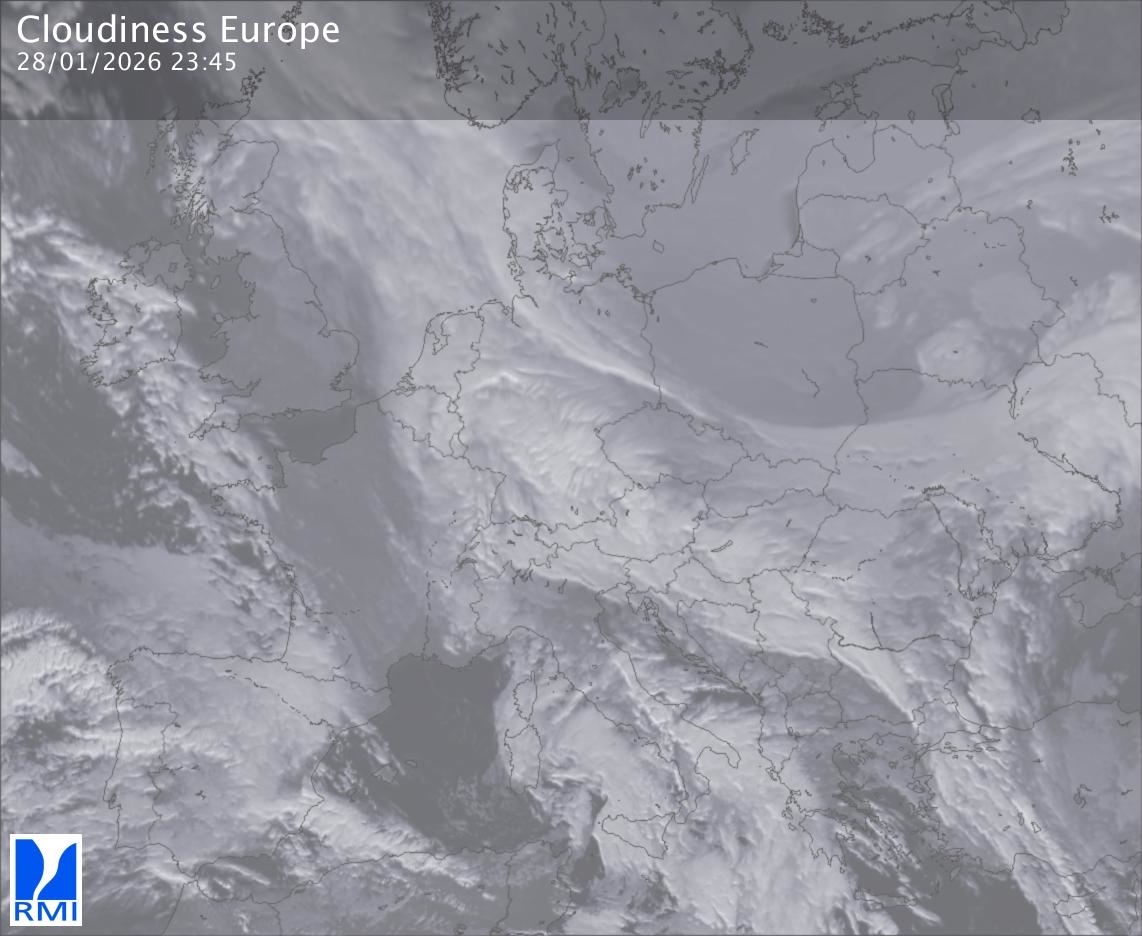 The satellite image of Europe is composed by using both the infrared and the visible light channel from the satellite. Because there are no usable visible light images during the night this composition of channels gives us an image that can be used to observe the clouds by day and by night. The pixelated artifacts are due to the lower resolution of the infrared channel.