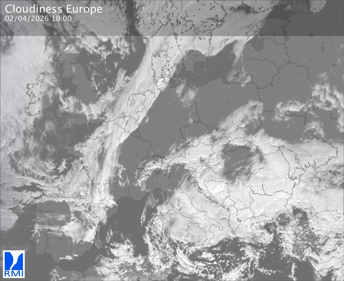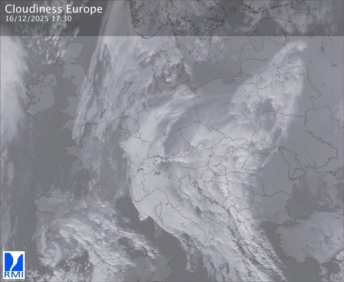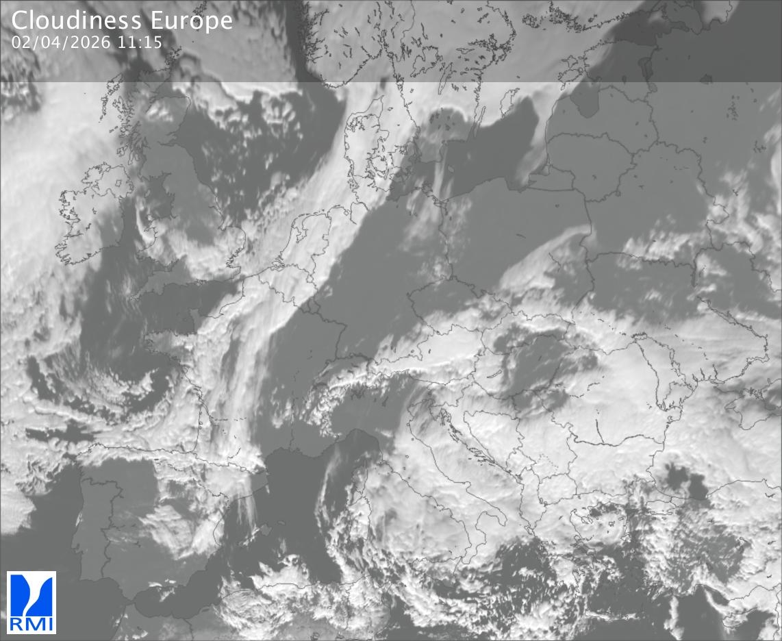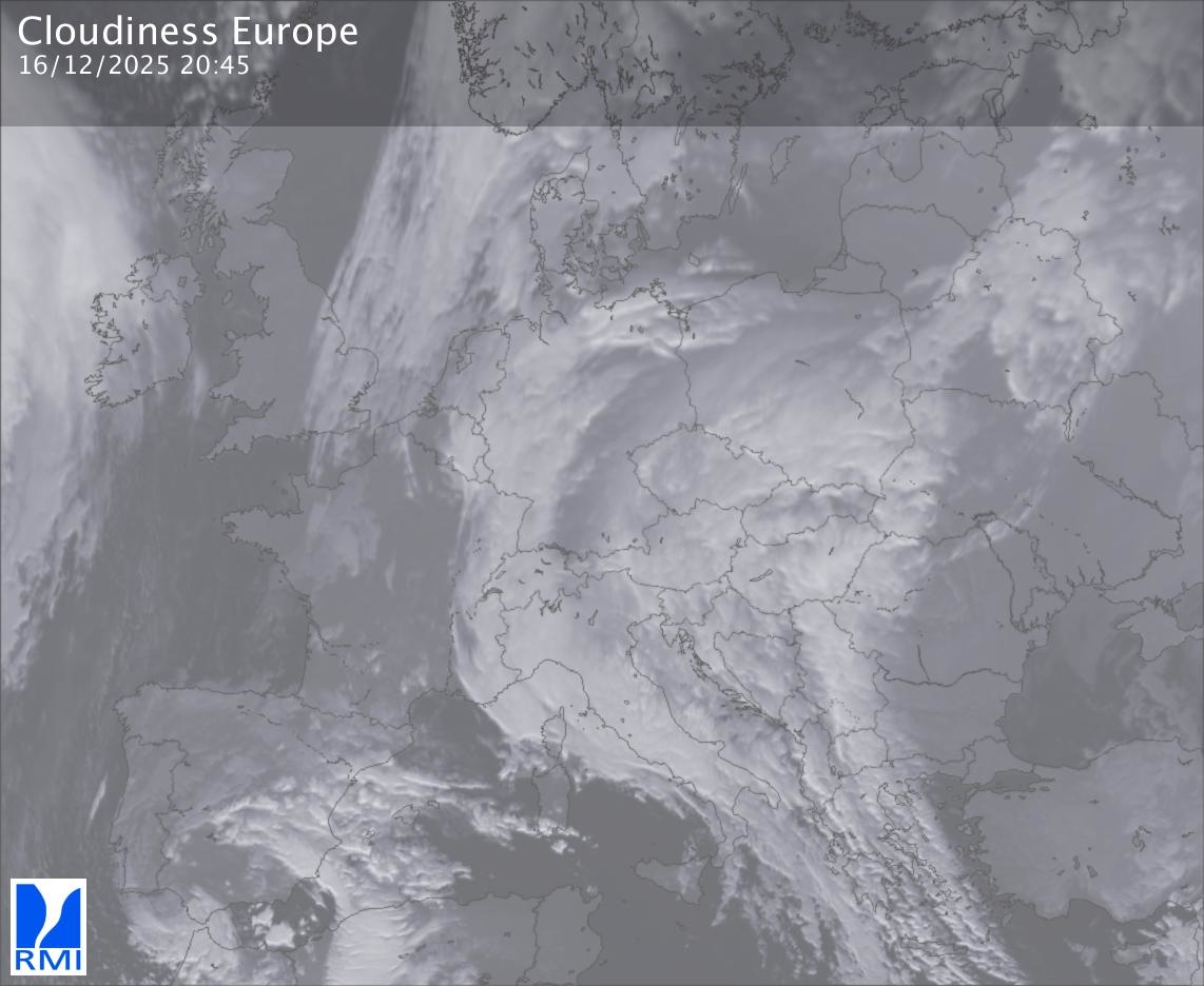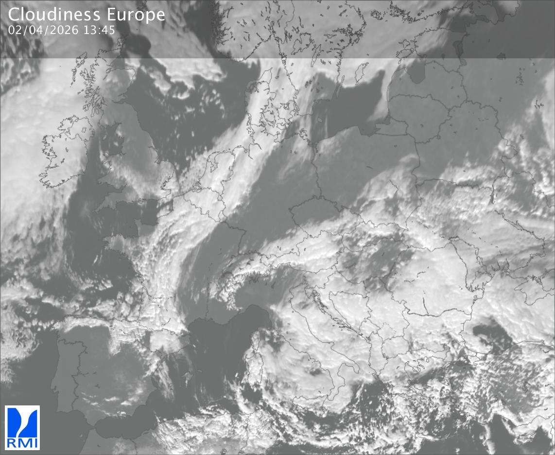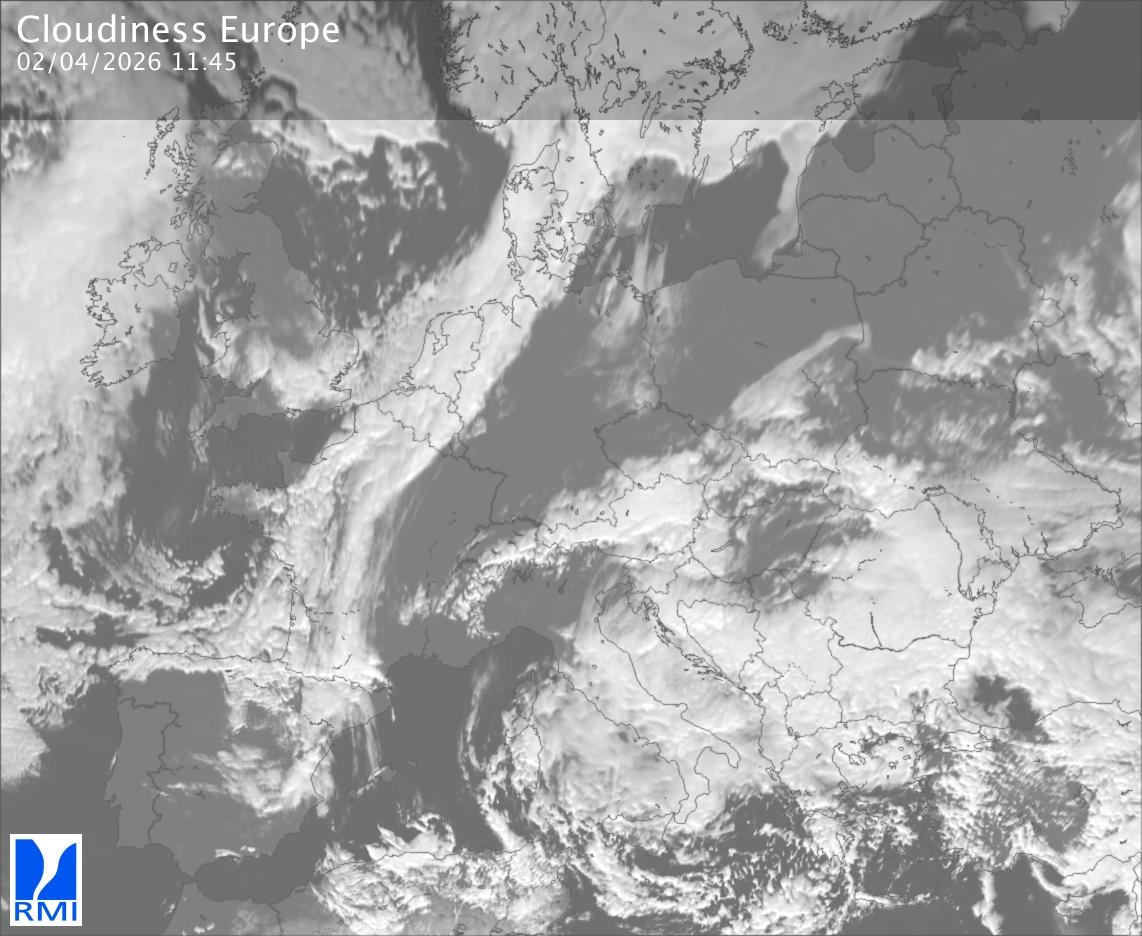 The satellite image of Europe is composed by using both the infrared and the visible light channel from the satellite. Because there are no usable visible light images during the night this composition of channels gives us an image that can be used to observe the clouds by day and by night. The pixelated artifacts are due to the lower resolution of the infrared channel.
