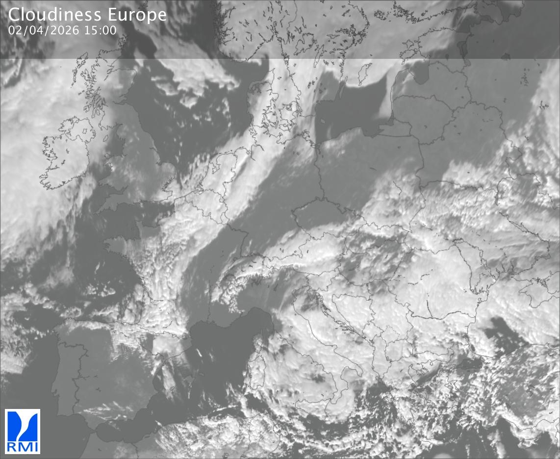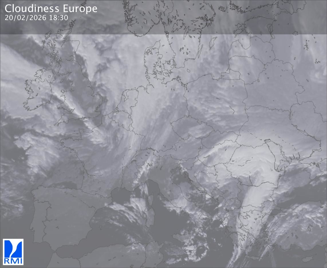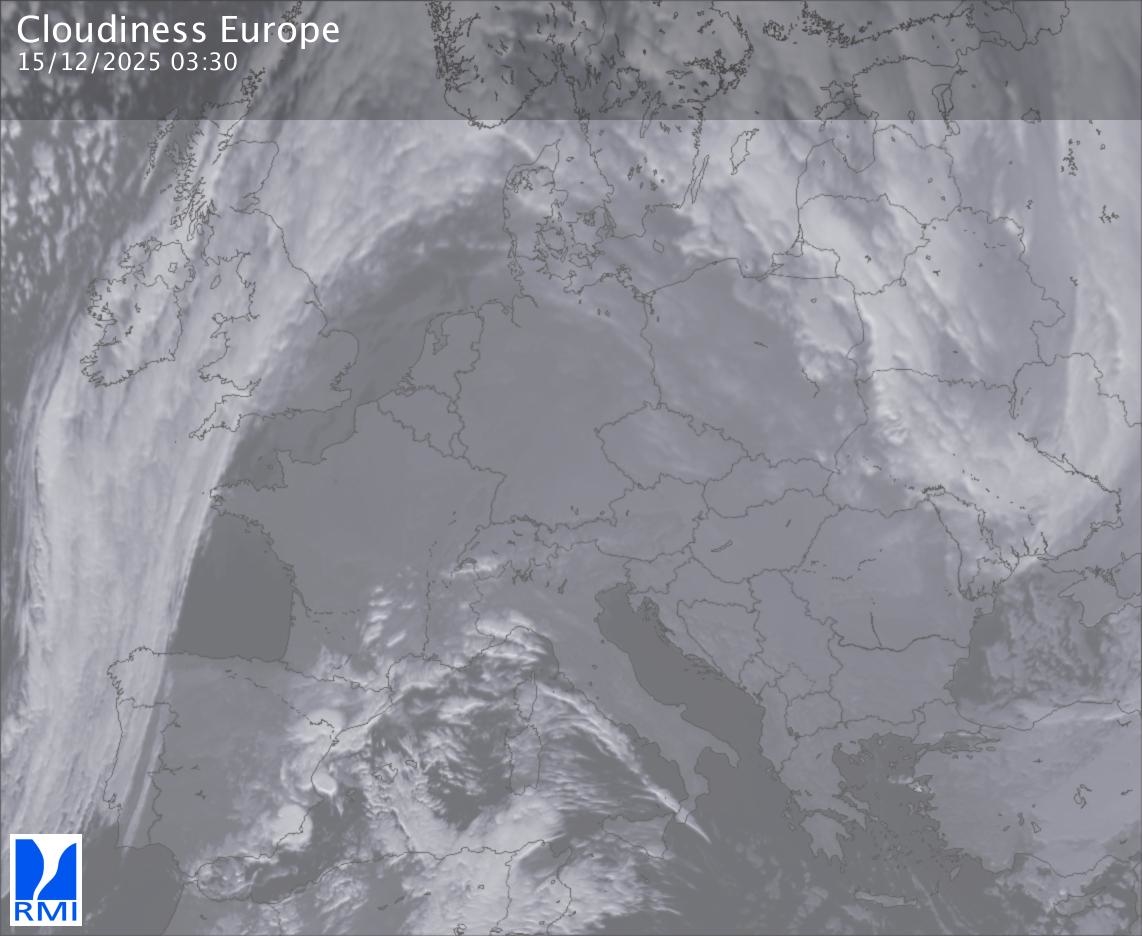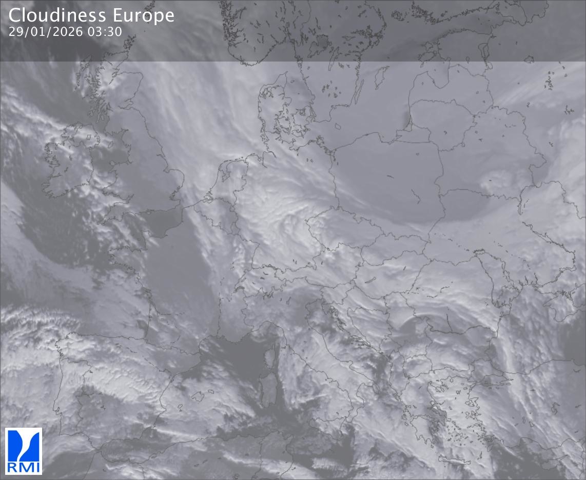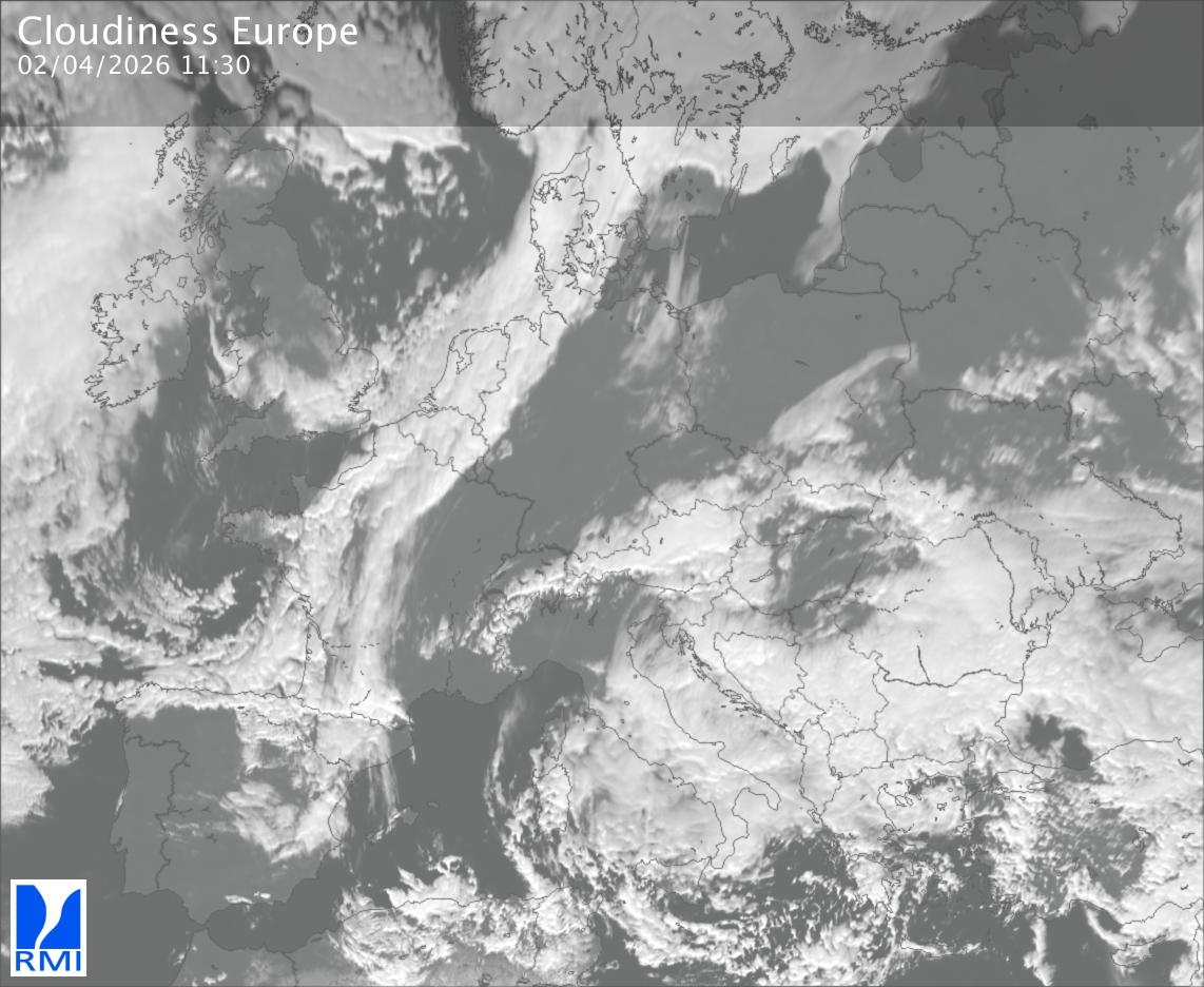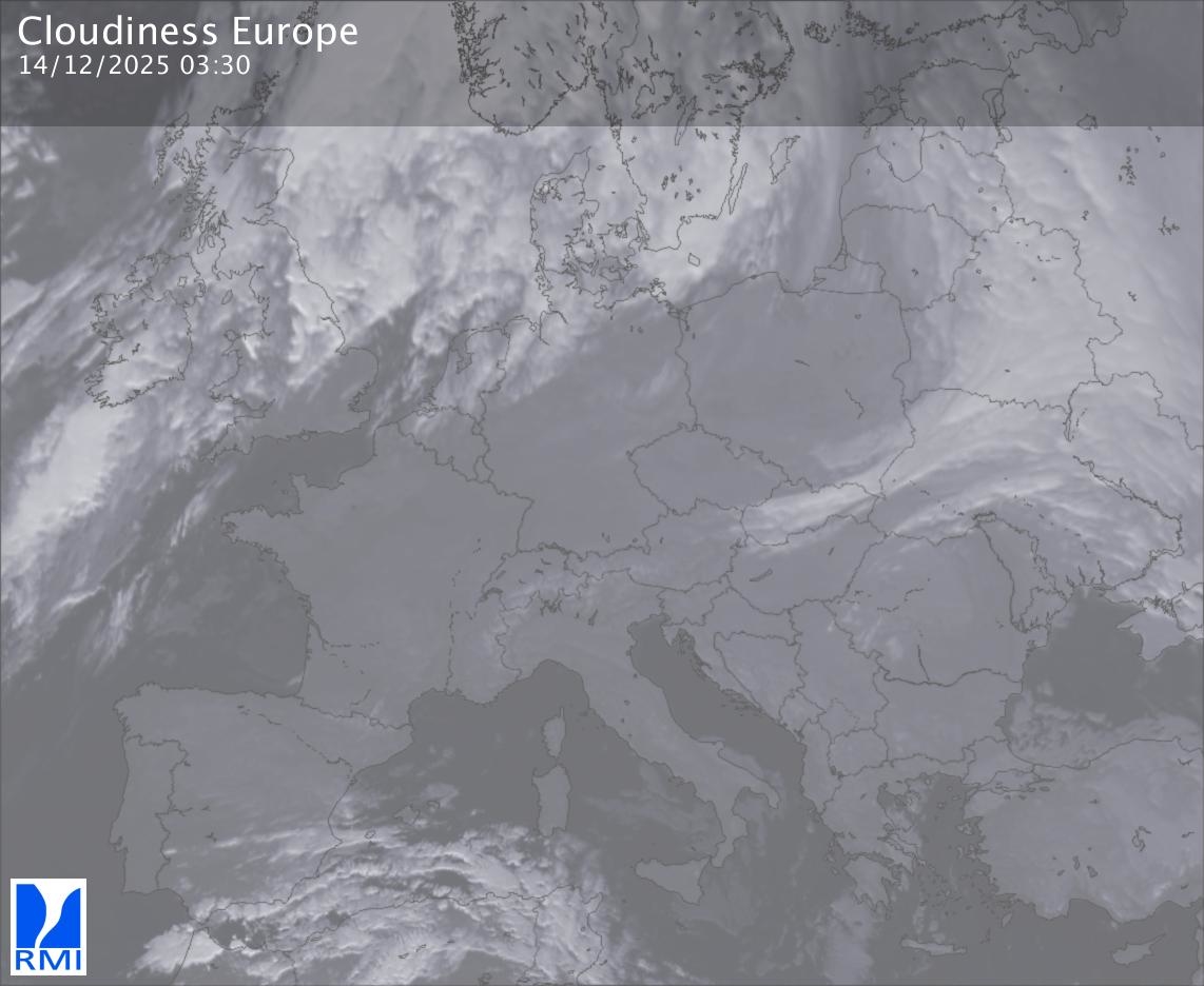 The satellite image of Europe is composed by using both the infrared and the visible light channel from the satellite. Because there are no usable visible light images during the night this composition of channels gives us an image that can be used to observe the clouds by day and by night. The pixelated artifacts are due to the lower resolution of the infrared channel.