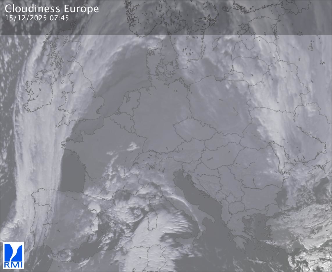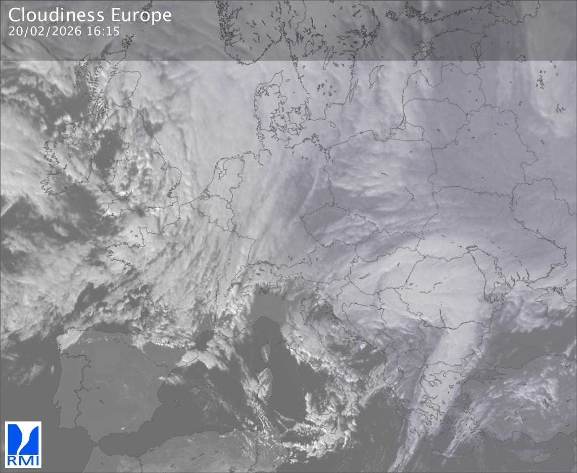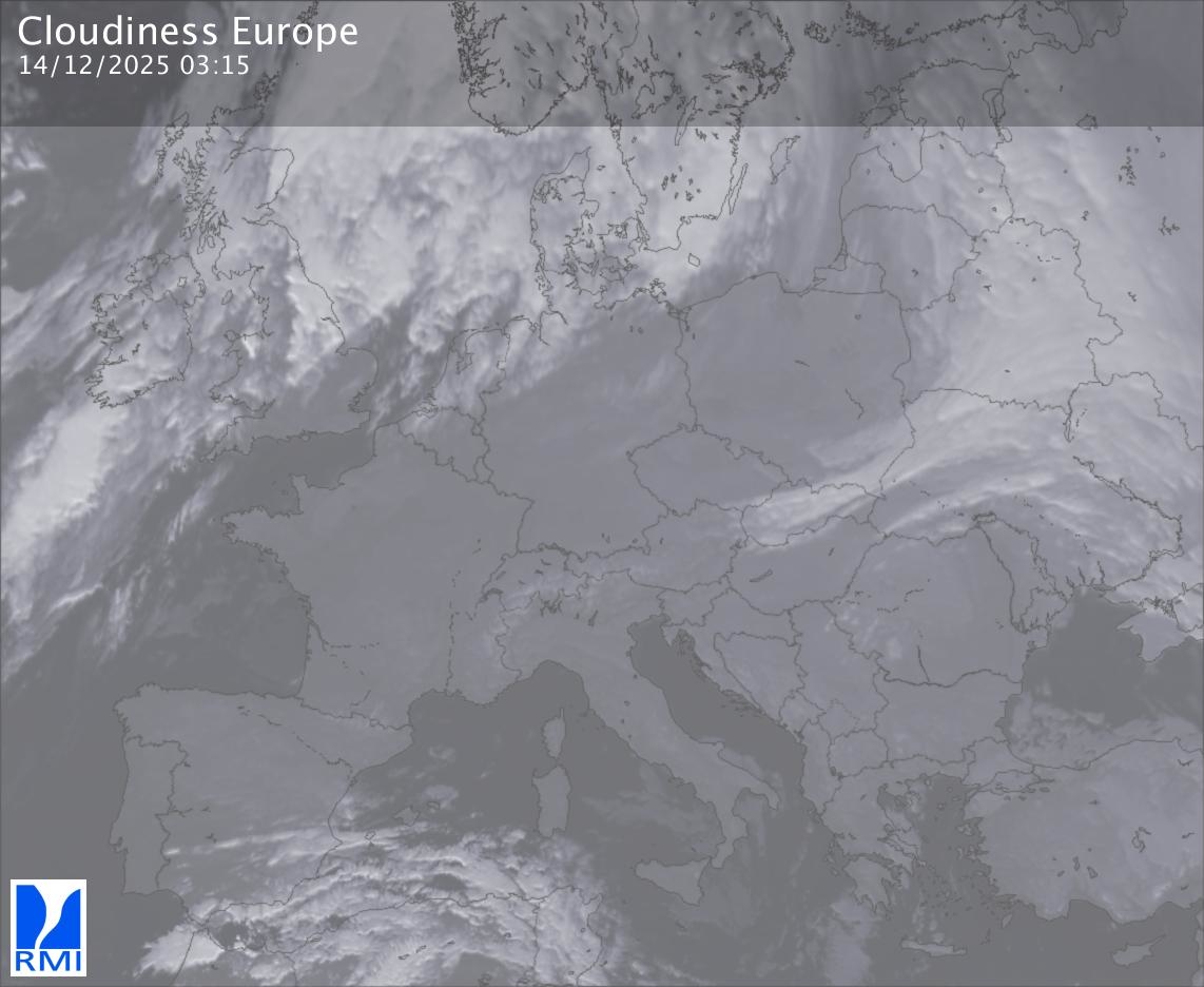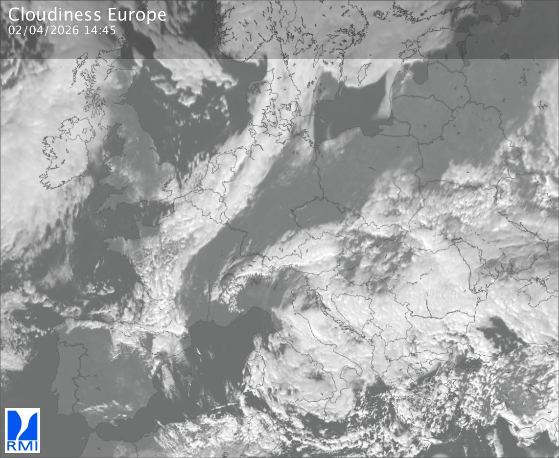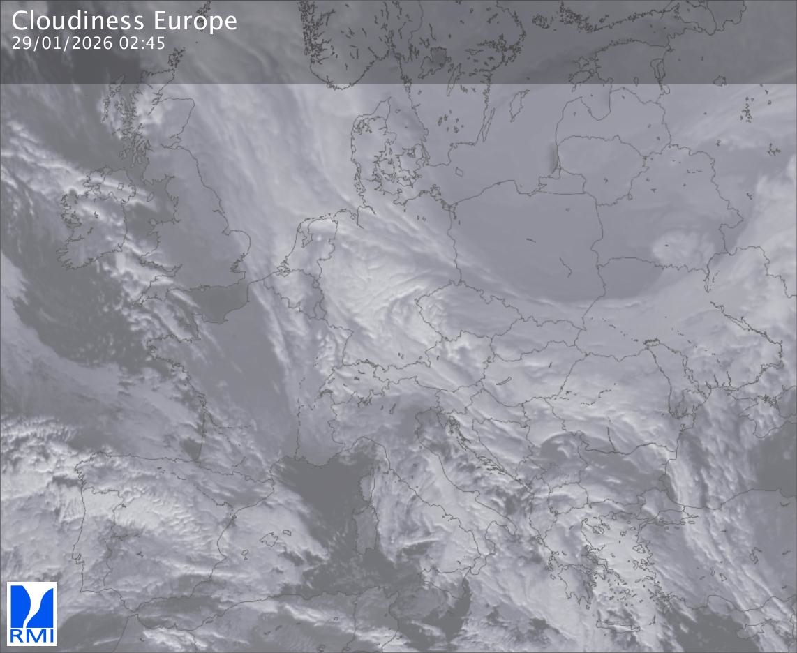 The satellite image of Europe is composed by using both the infrared and the visible light channel from the satellite. Because there are no usable visible light images during the night this composition of channels gives us an image that can be used to observe the clouds by day and by night. The pixelated artifacts are due to the lower resolution of the infrared channel.