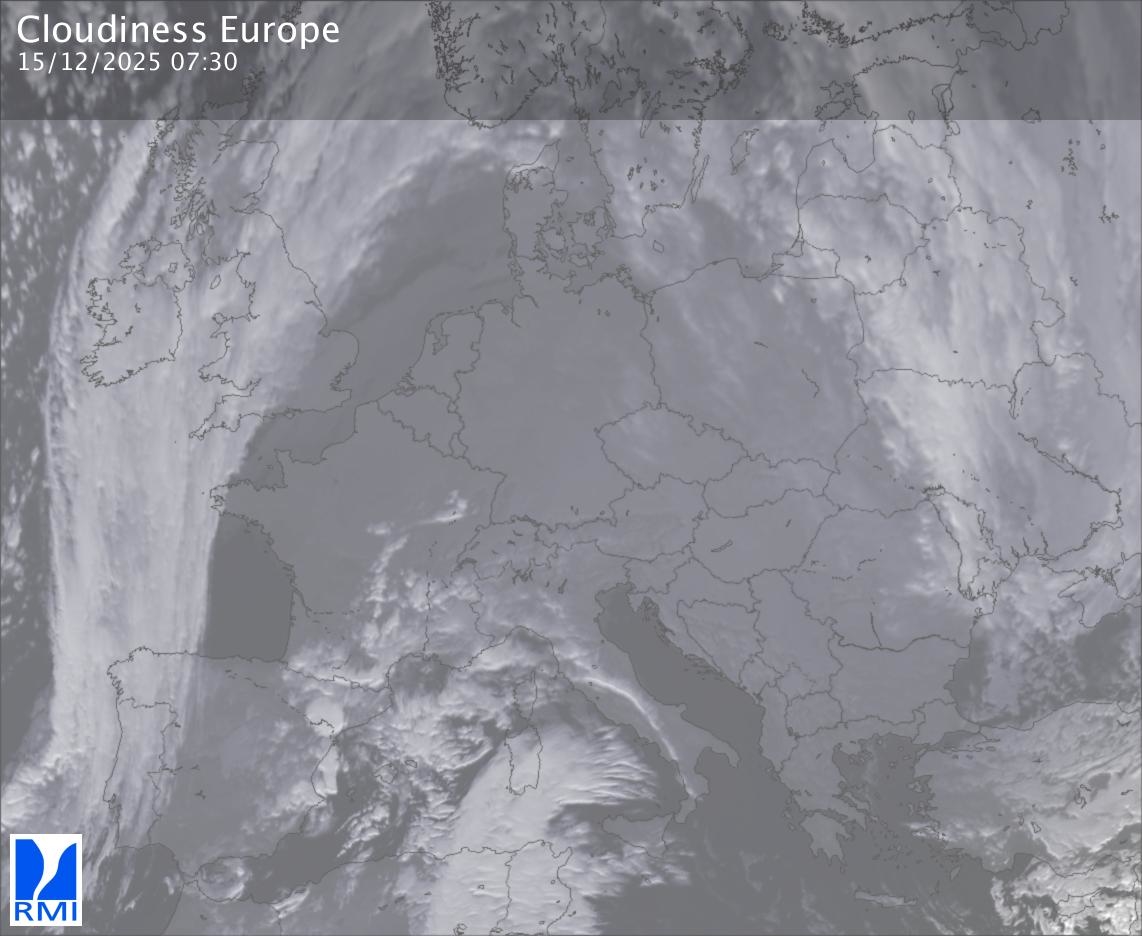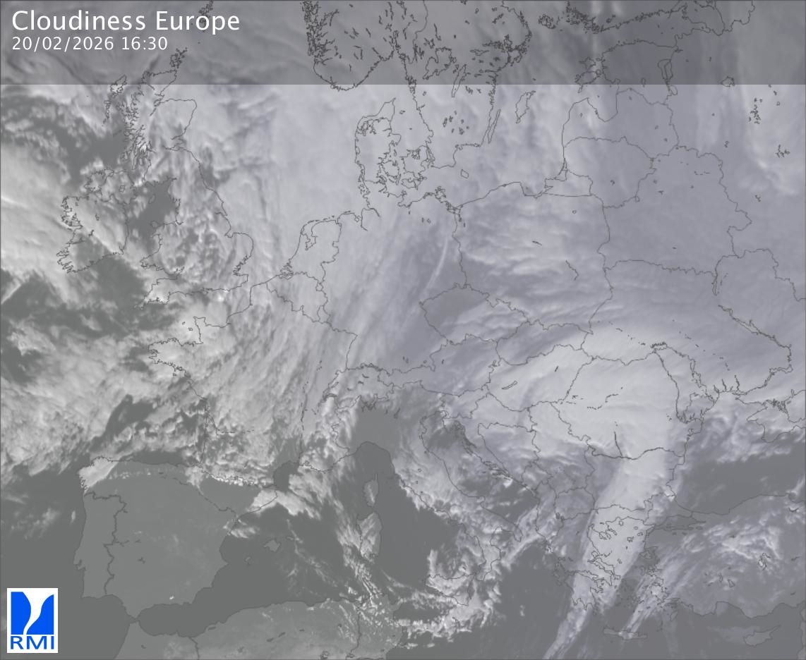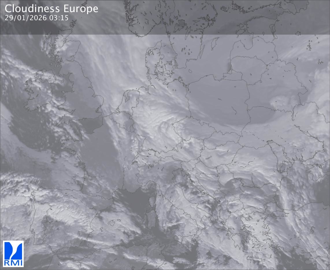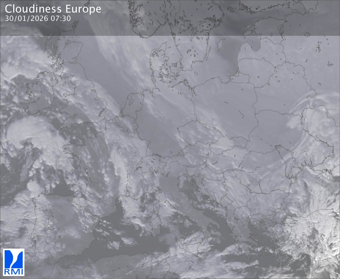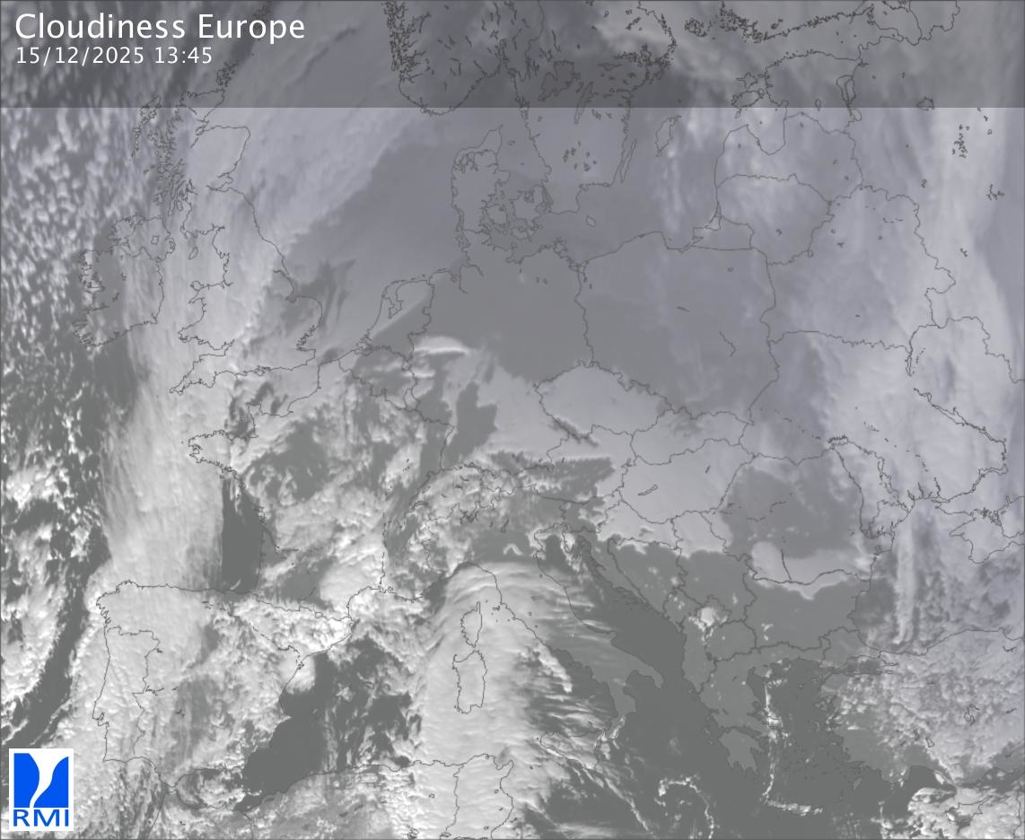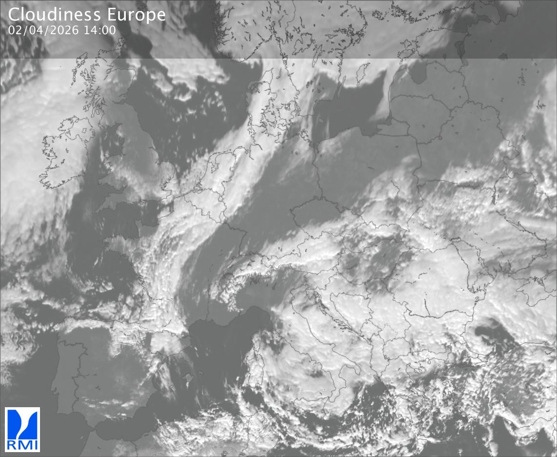 The satellite image of Europe is composed by using both the infrared and the visible light channel from the satellite. Because there are no usable visible light images during the night this composition of channels gives us an image that can be used to observe the clouds by day and by night. The pixelated artifacts are due to the lower resolution of the infrared channel.