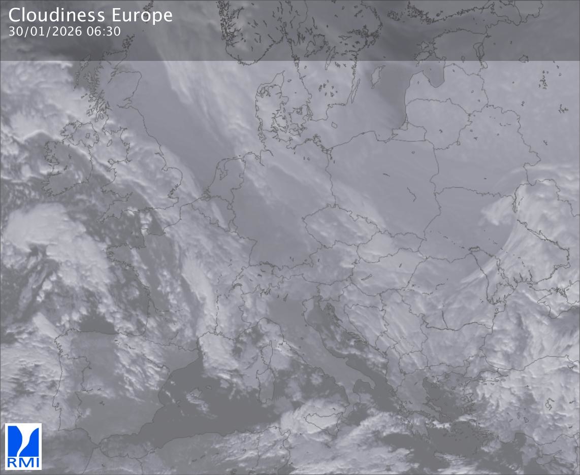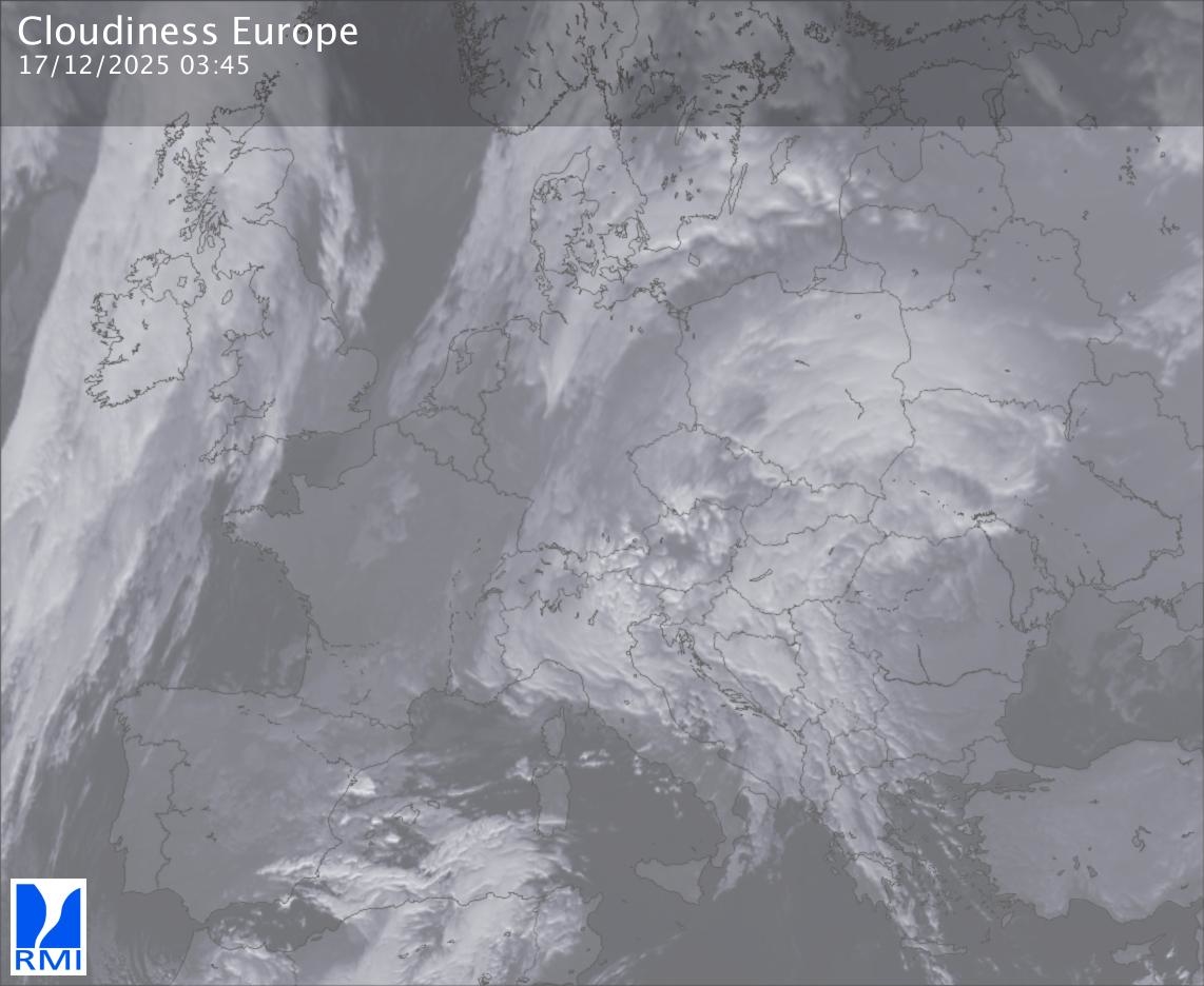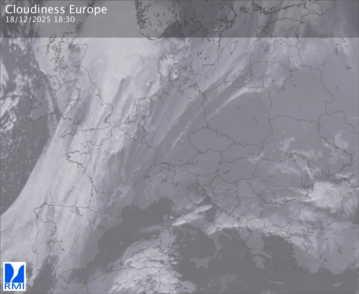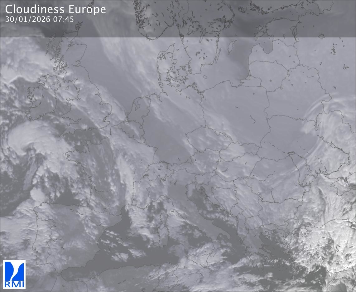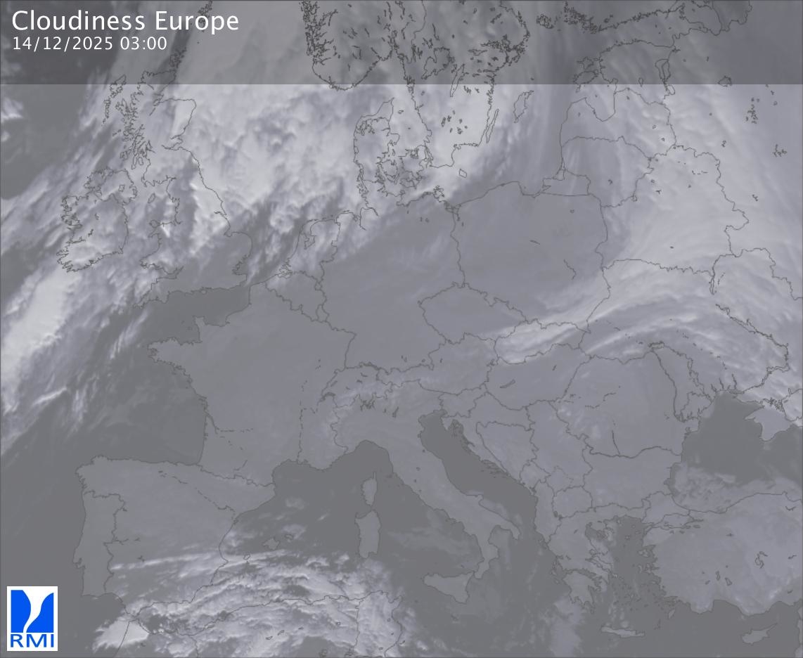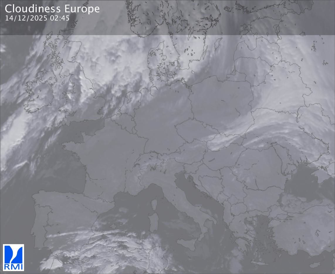 The satellite image of Europe is composed by using both the infrared and the visible light channel from the satellite. Because there are no usable visible light images during the night this composition of channels gives us an image that can be used to observe the clouds by day and by night. The pixelated artifacts are due to the lower resolution of the infrared channel.