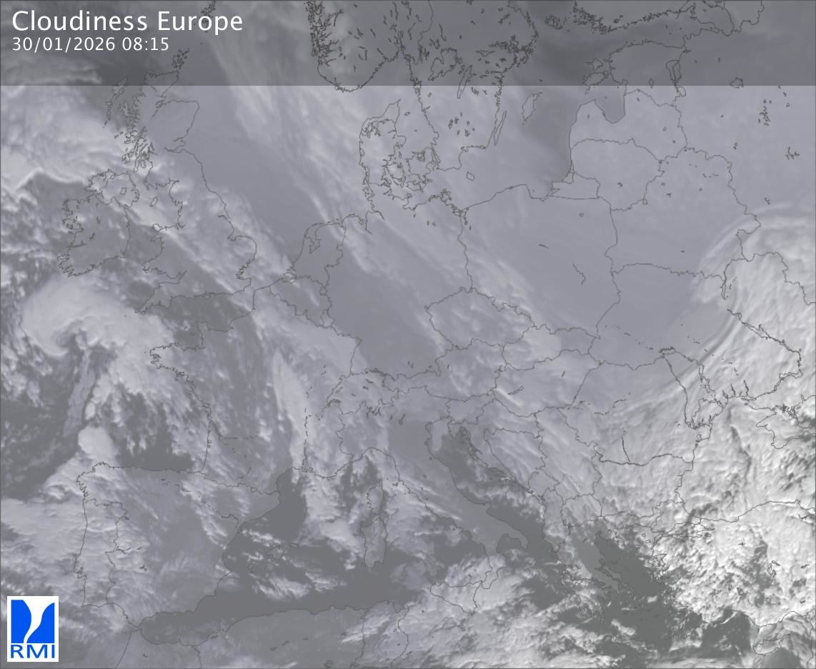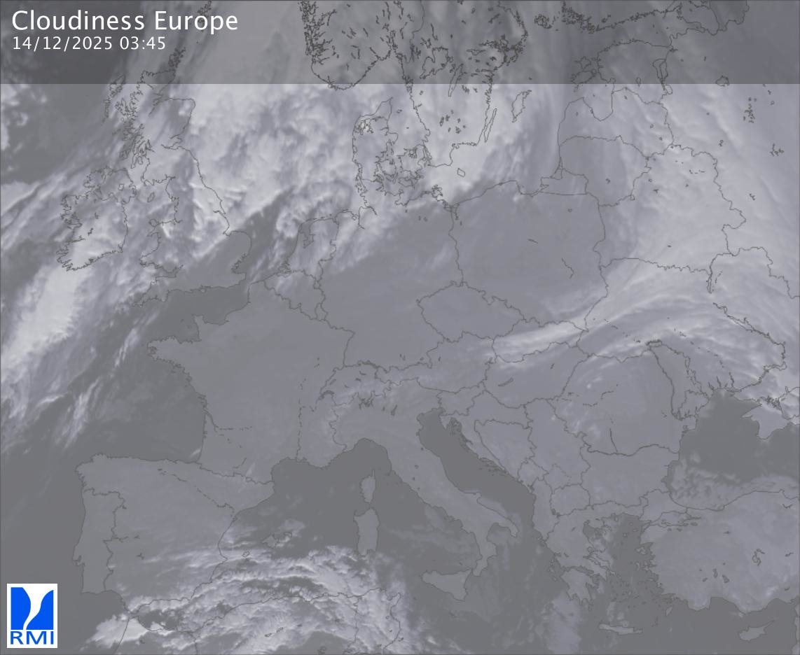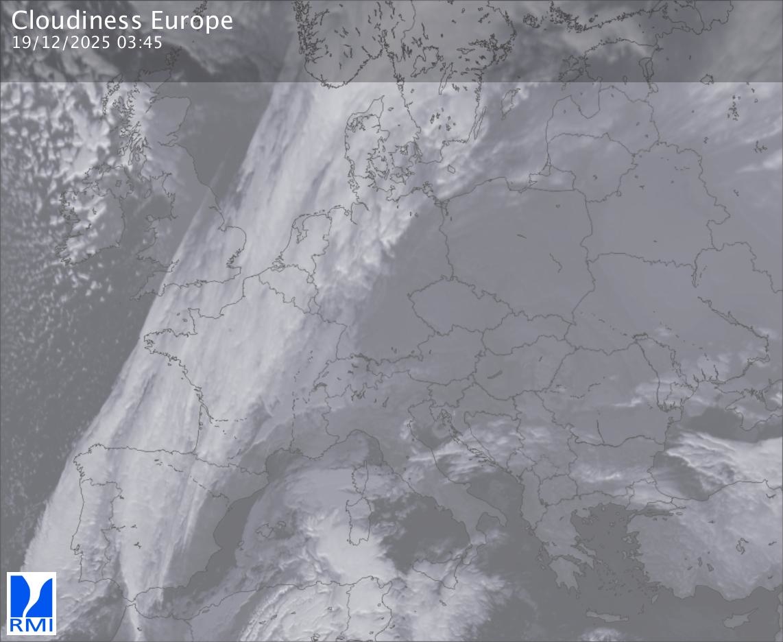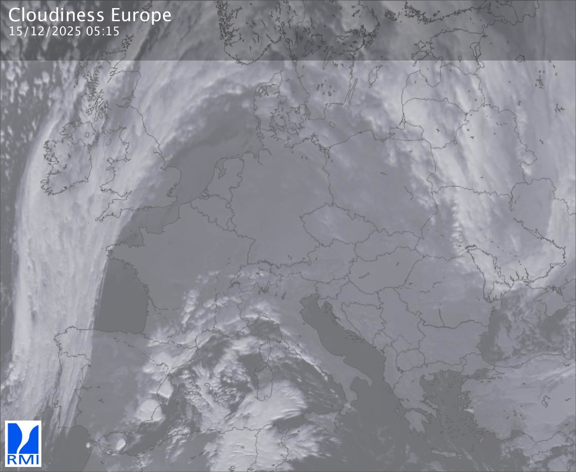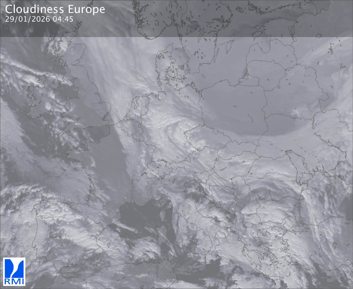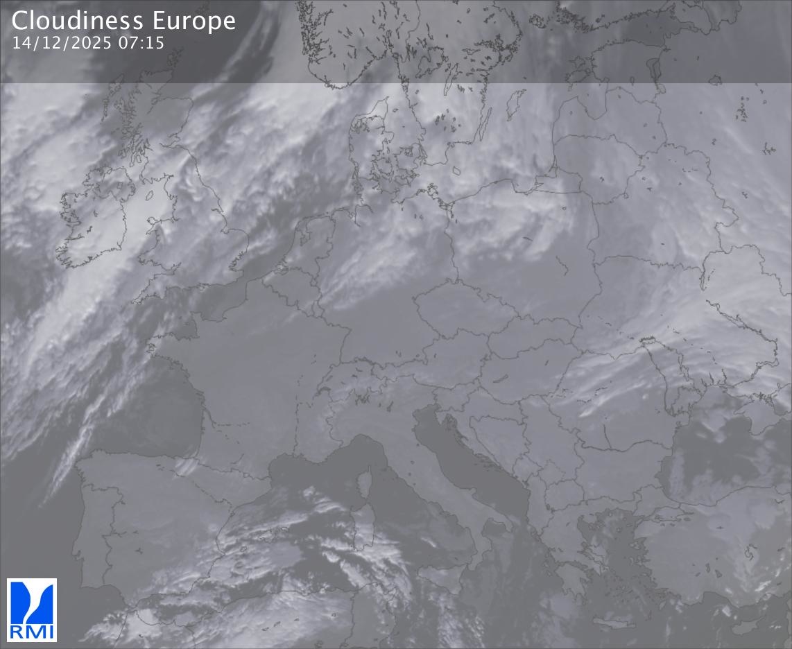 The satellite image of Europe is composed by using both the infrared and the visible light channel from the satellite. Because there are no usable visible light images during the night this composition of channels gives us an image that can be used to observe the clouds by day and by night. The pixelated artifacts are due to the lower resolution of the infrared channel.