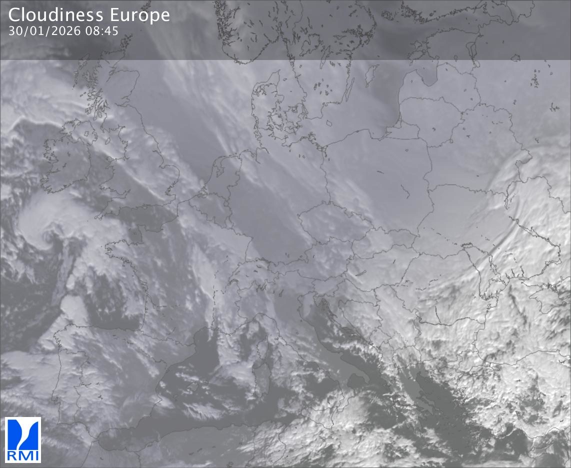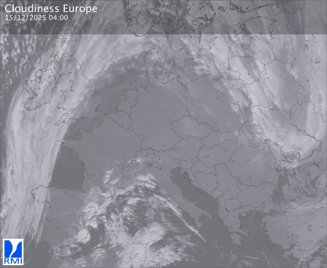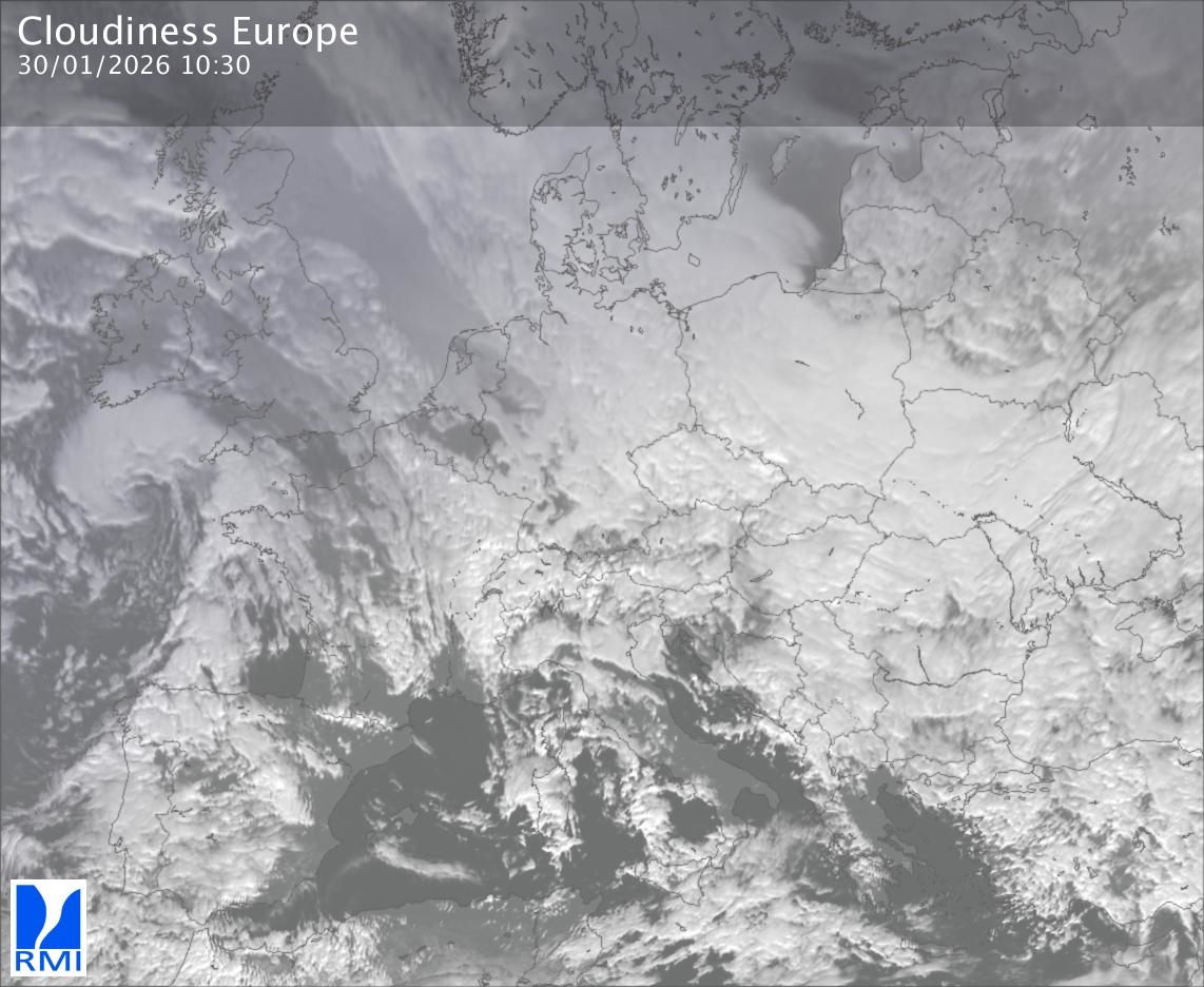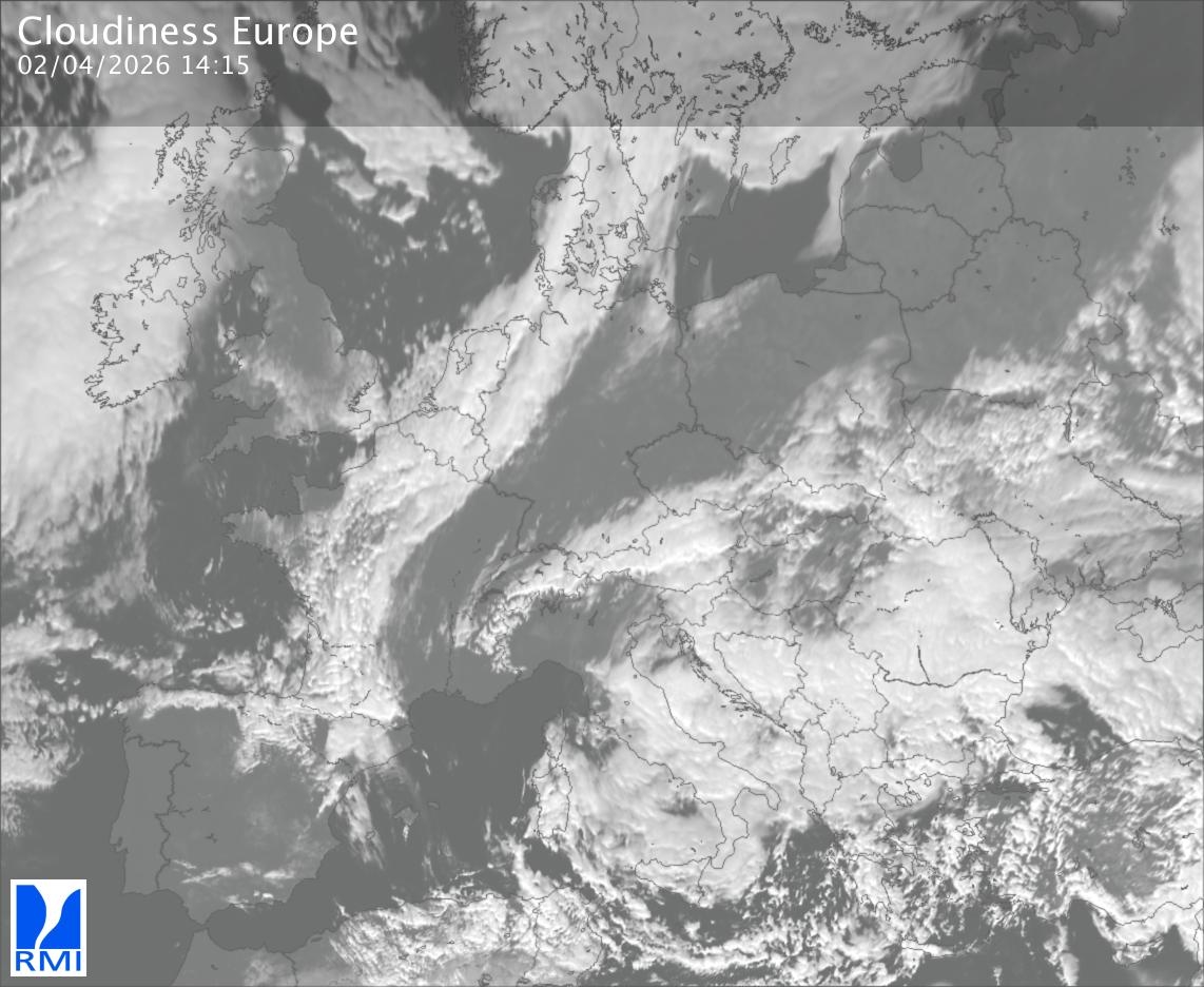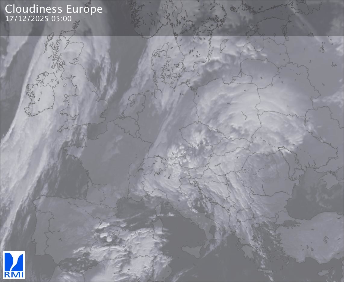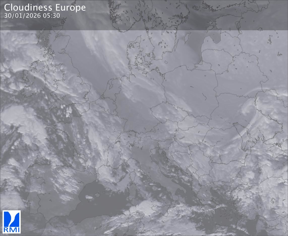 The satellite image of Europe is composed by using both the infrared and the visible light channel from the satellite. Because there are no usable visible light images during the night this composition of channels gives us an image that can be used to observe the clouds by day and by night. The pixelated artifacts are due to the lower resolution of the infrared channel.
