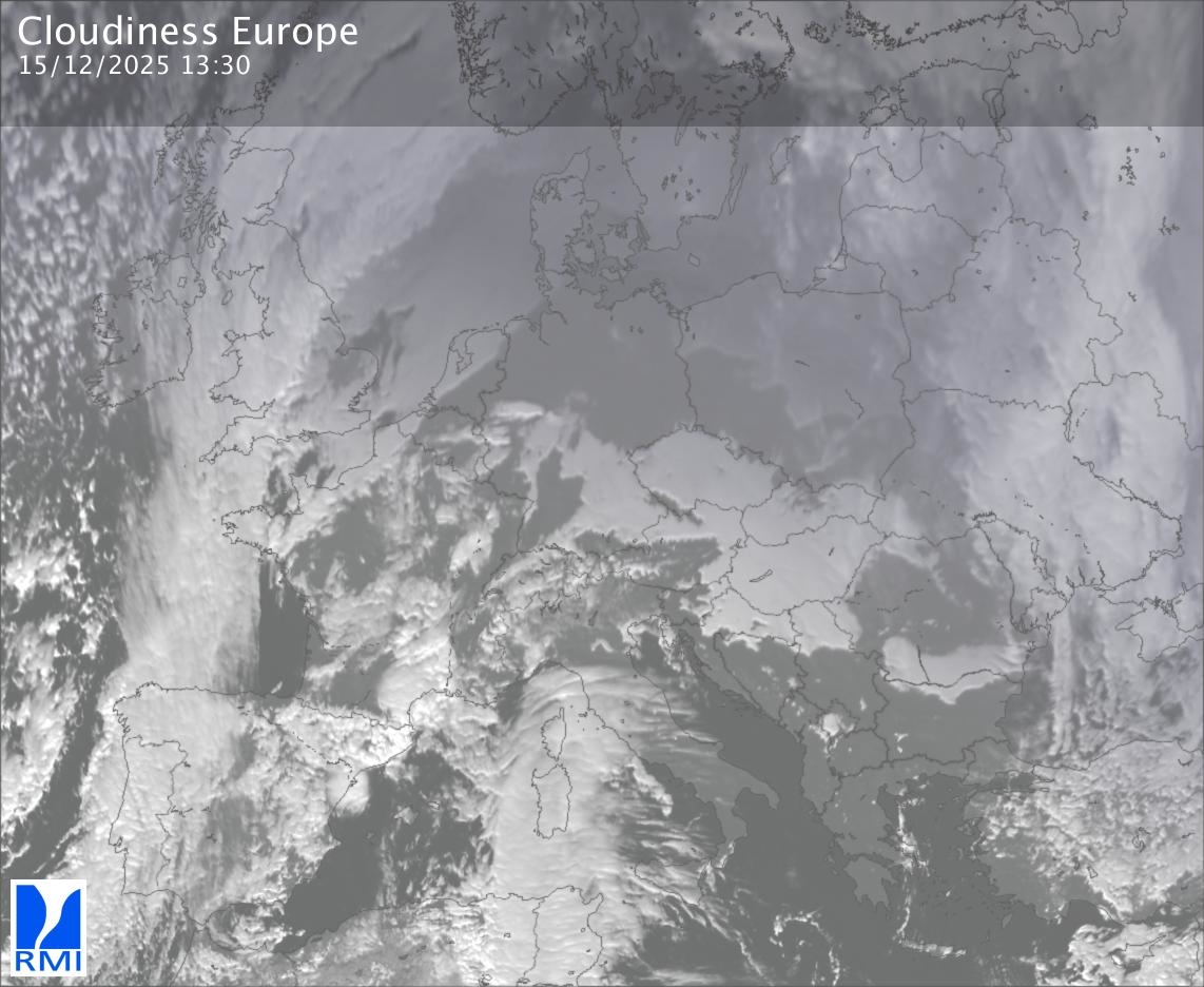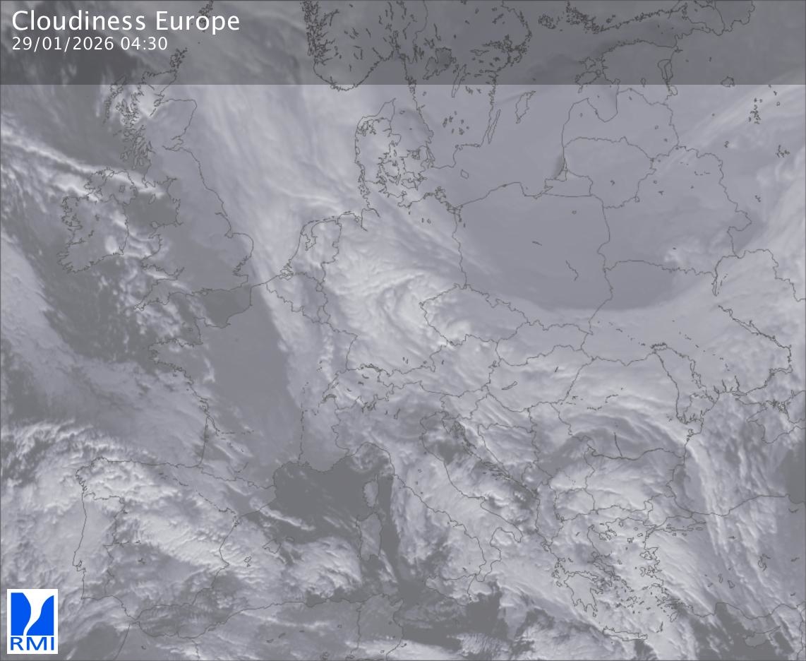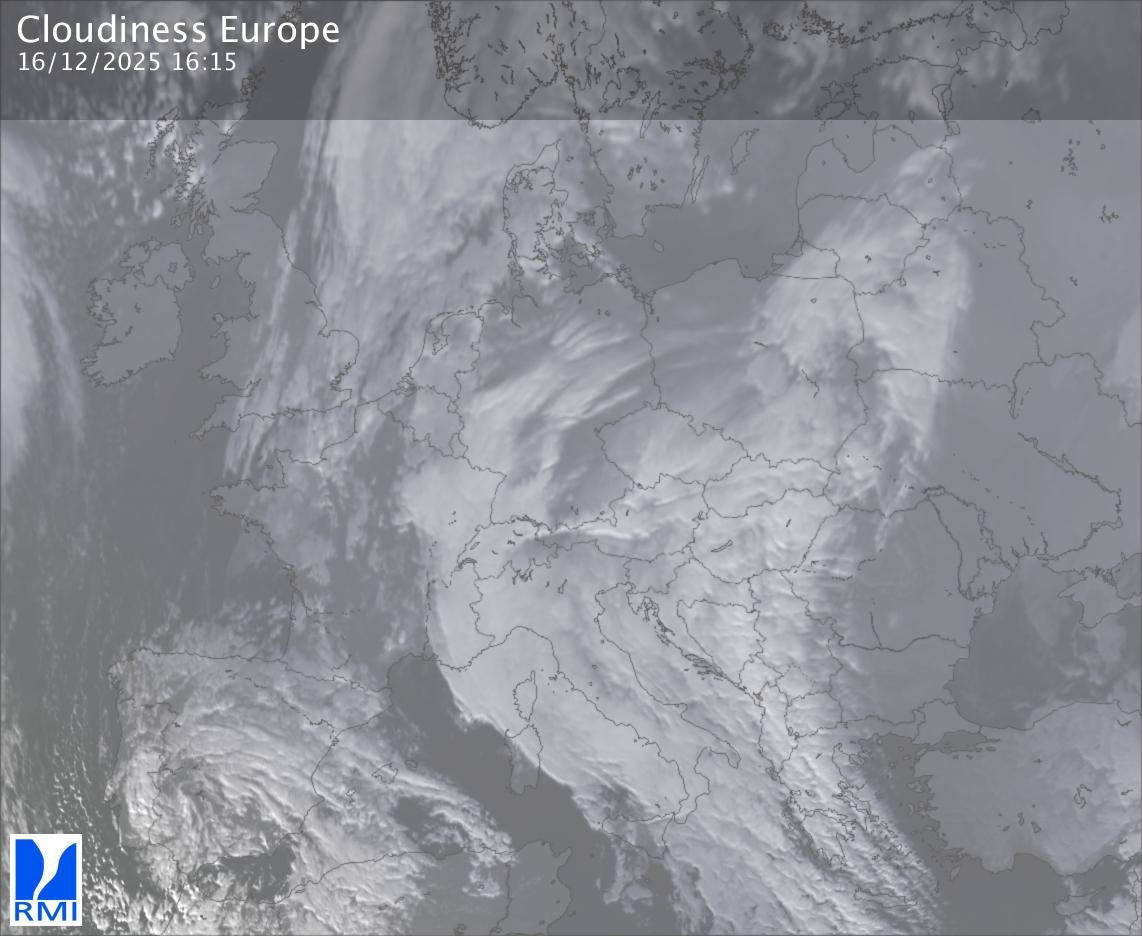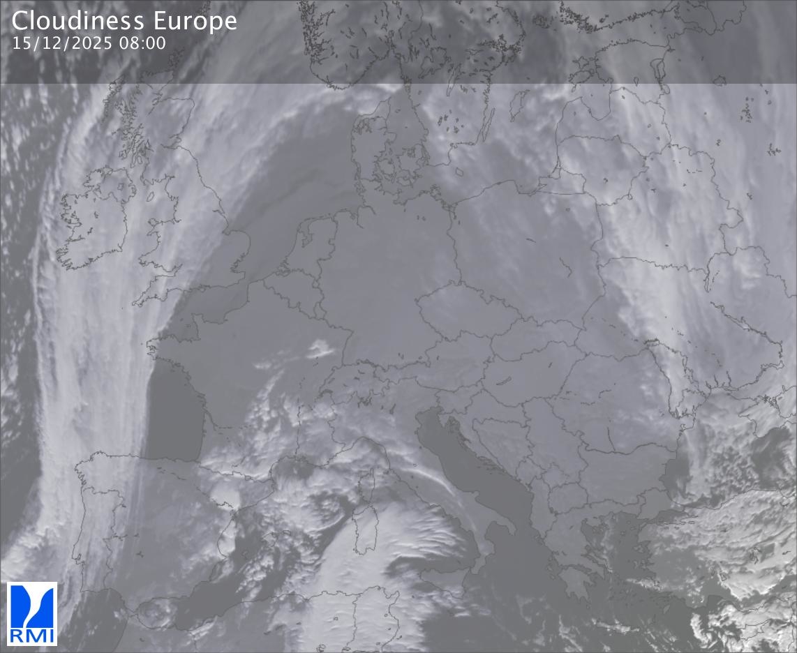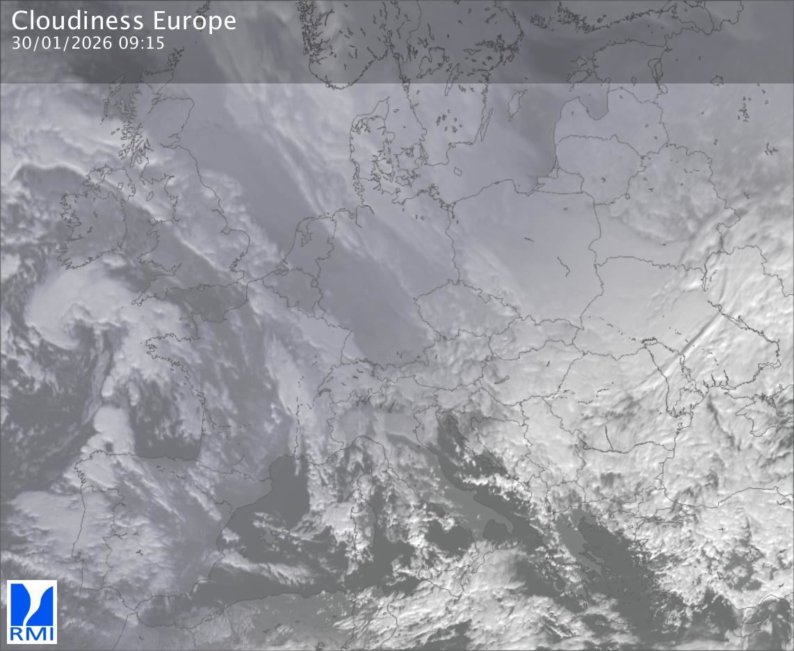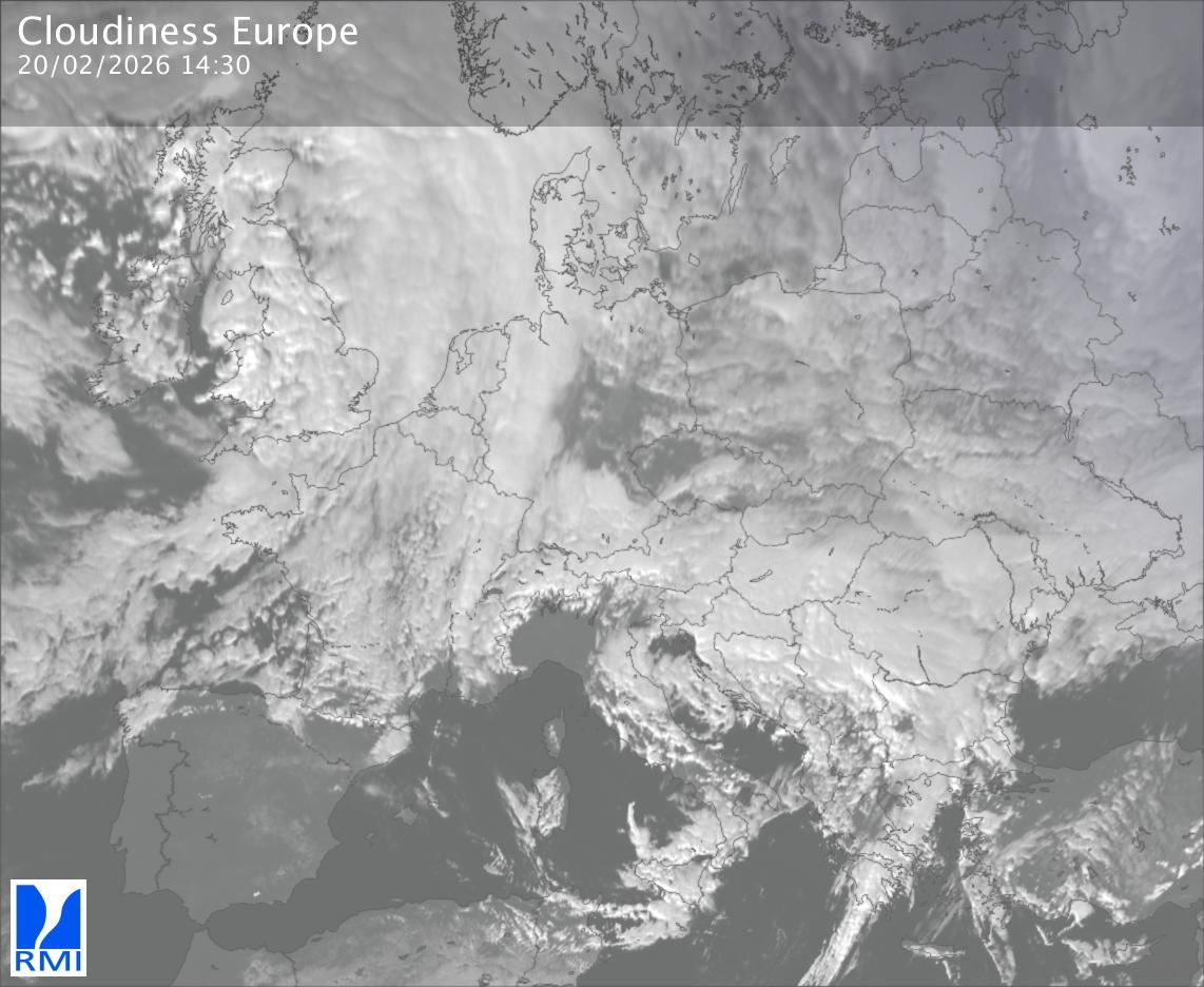 The satellite image of Europe is composed by using both the infrared and the visible light channel from the satellite. Because there are no usable visible light images during the night this composition of channels gives us an image that can be used to observe the clouds by day and by night. The pixelated artifacts are due to the lower resolution of the infrared channel.