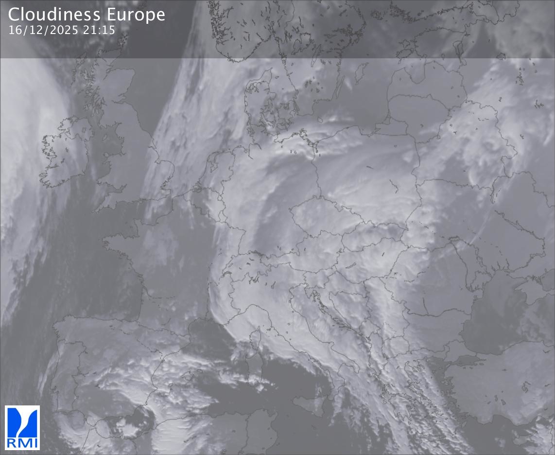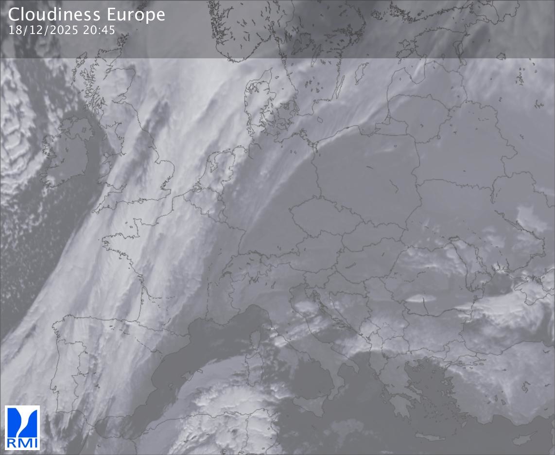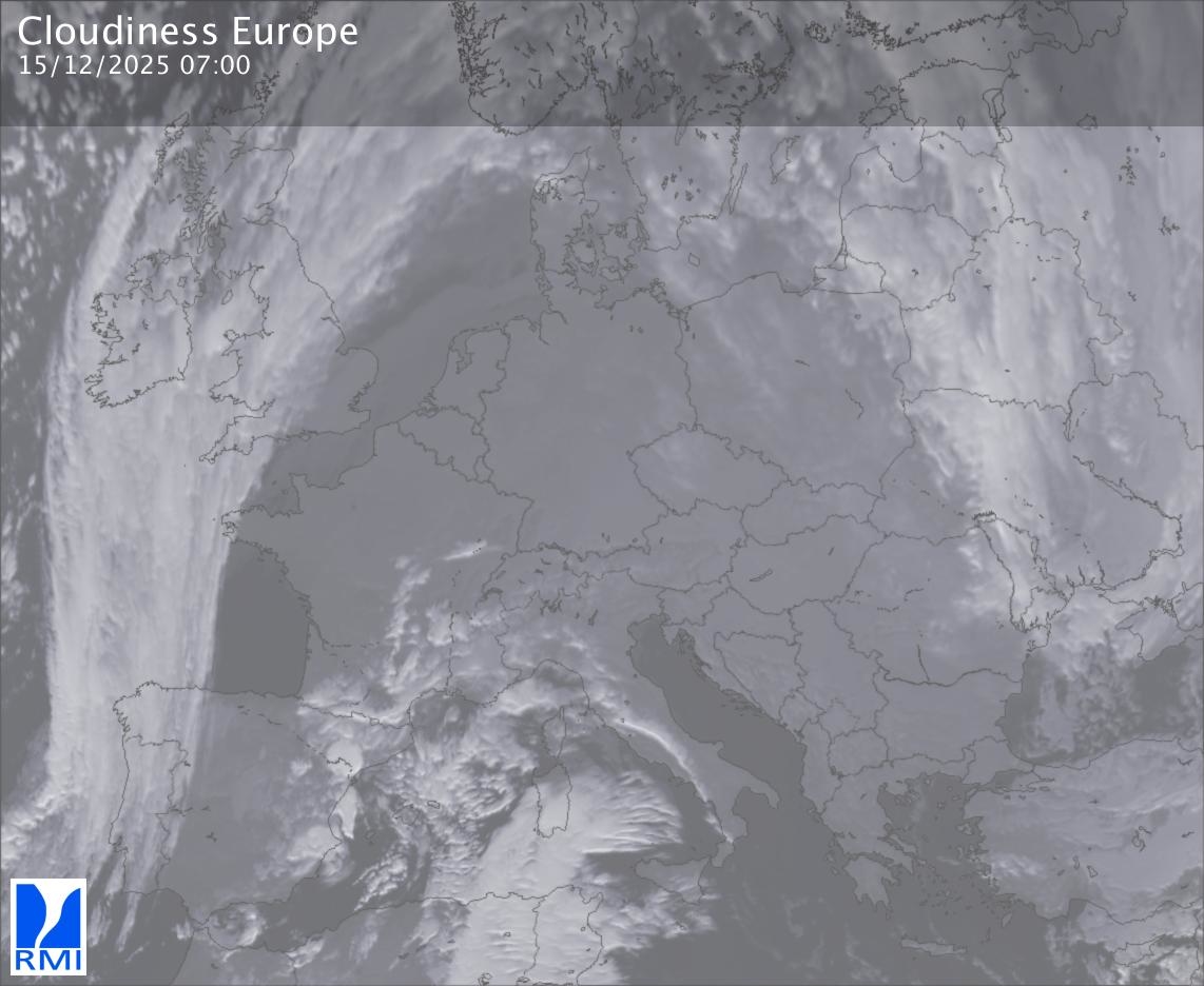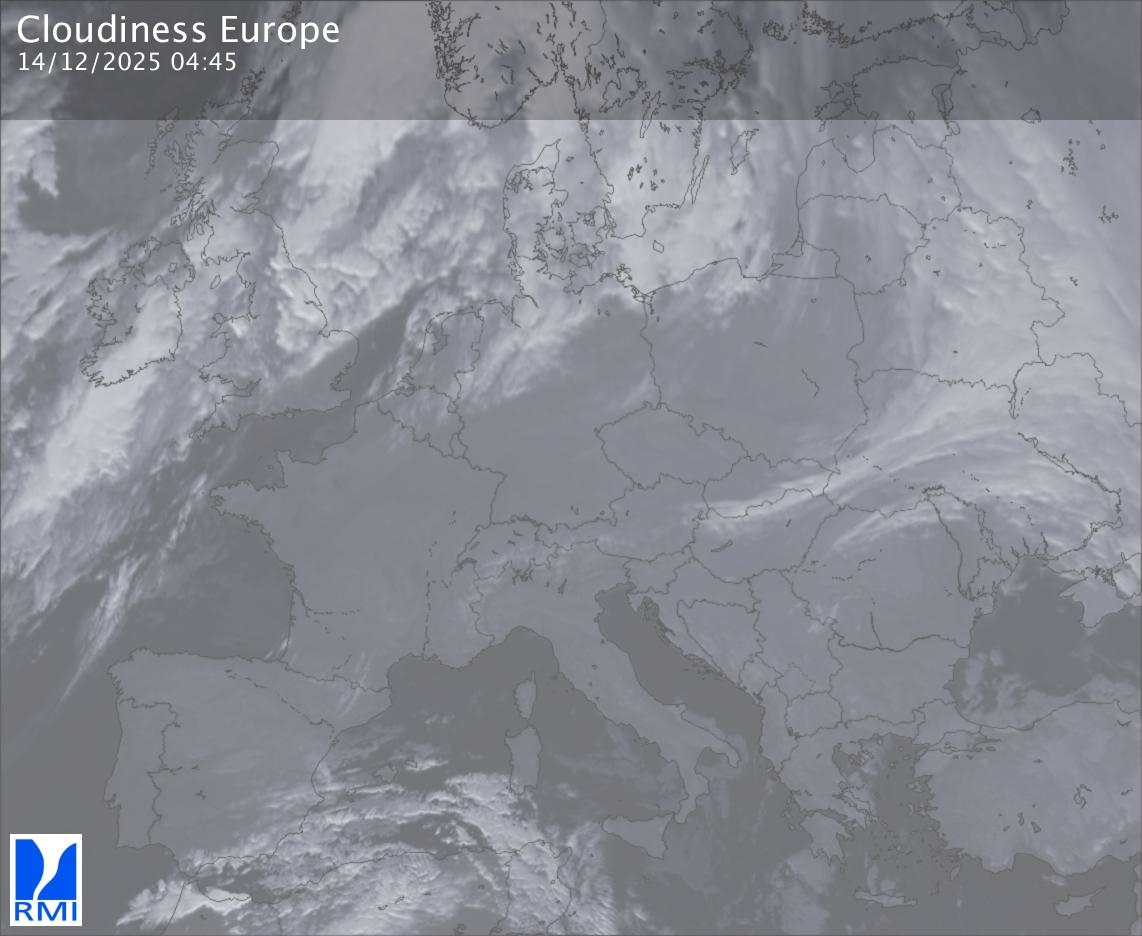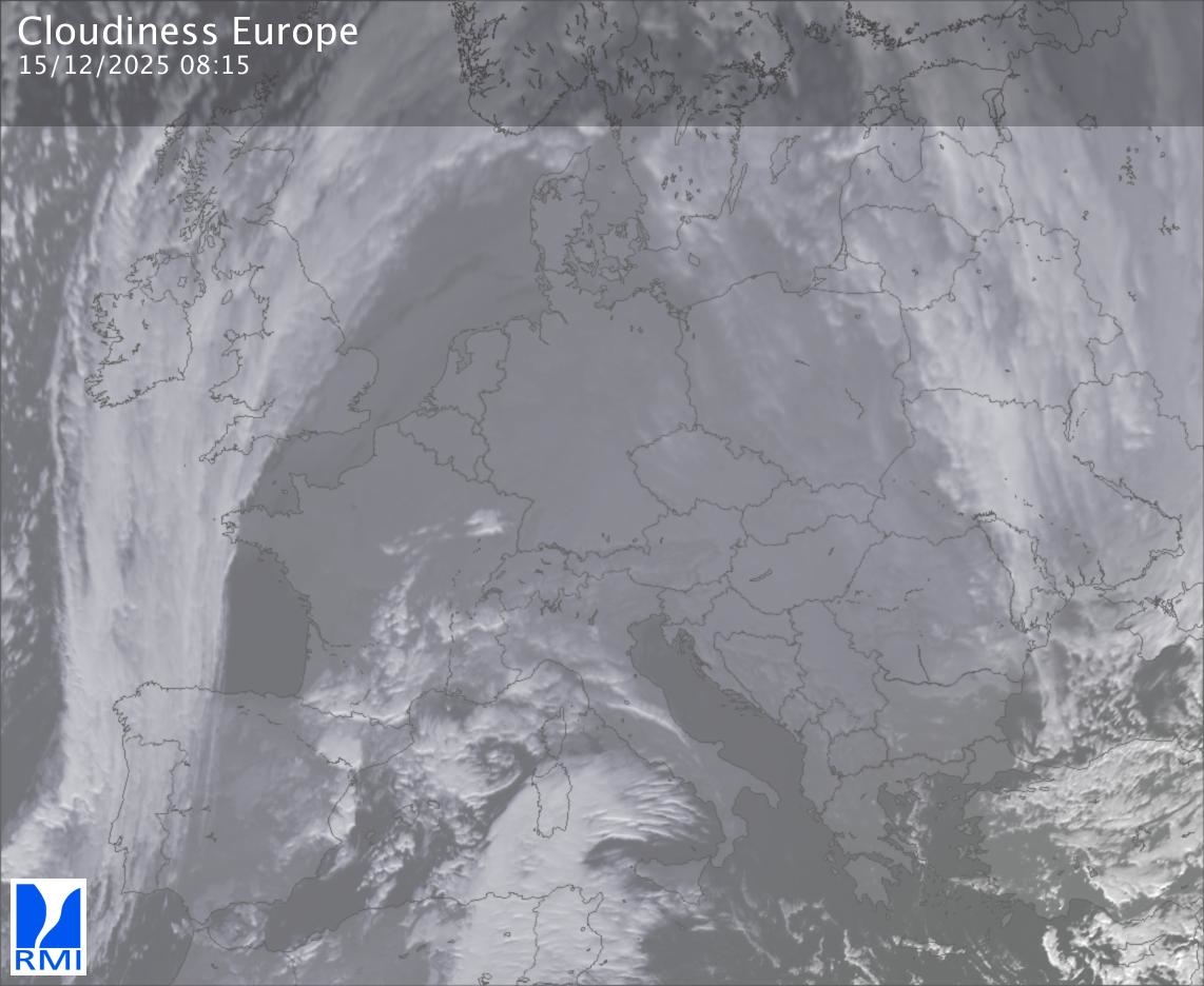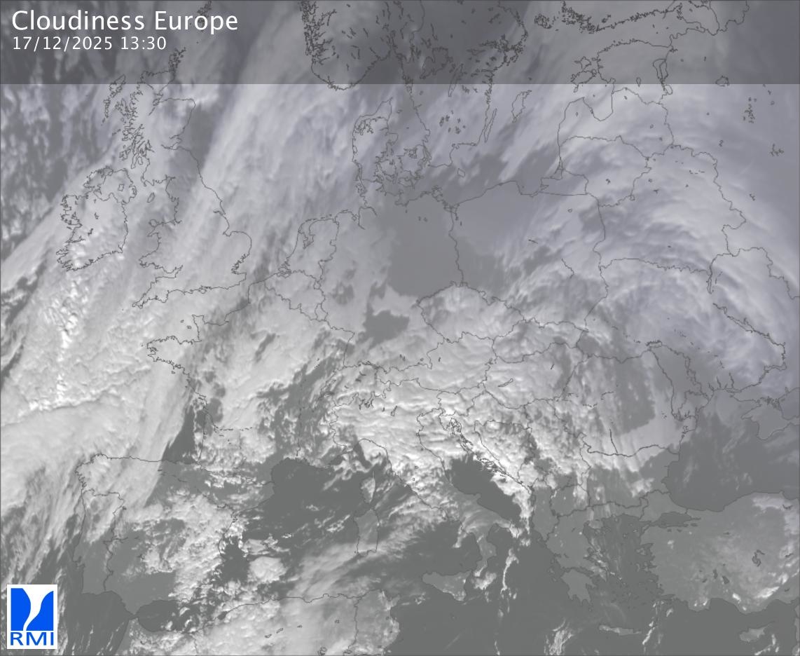 The satellite image of Europe is composed by using both the infrared and the visible light channel from the satellite. Because there are no usable visible light images during the night this composition of channels gives us an image that can be used to observe the clouds by day and by night. The pixelated artifacts are due to the lower resolution of the infrared channel.