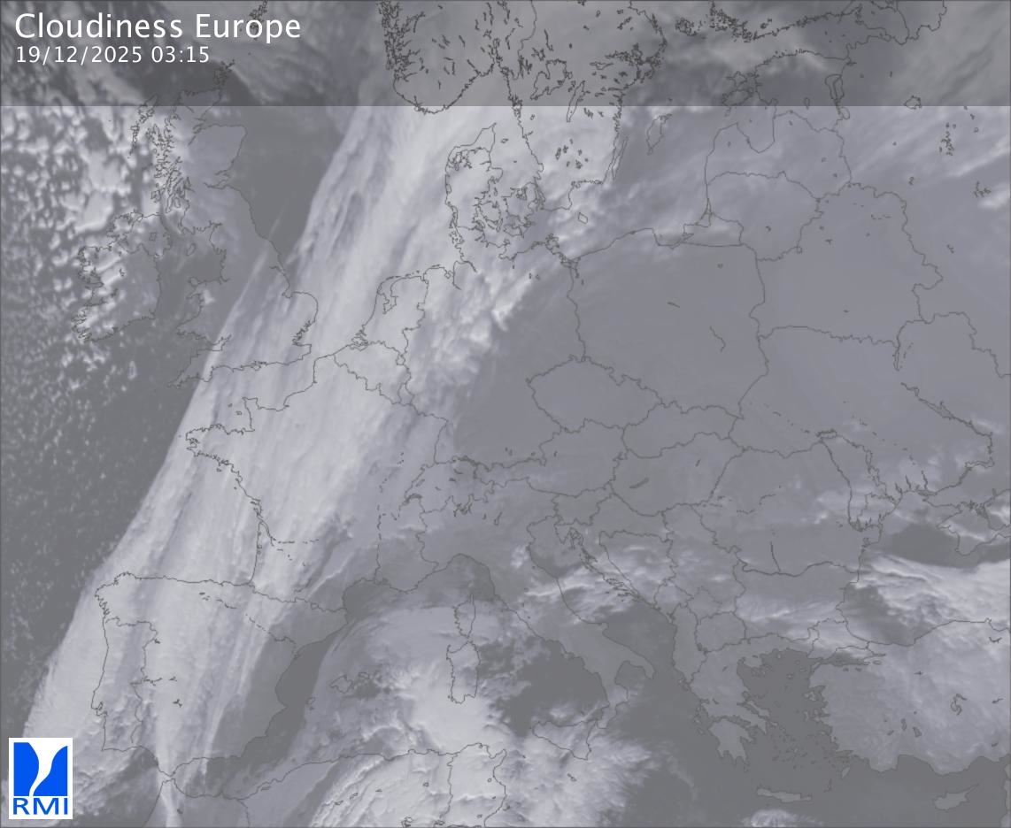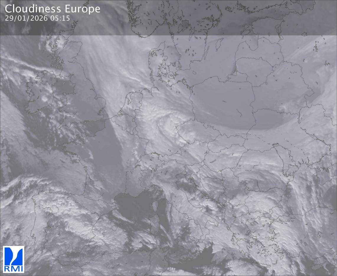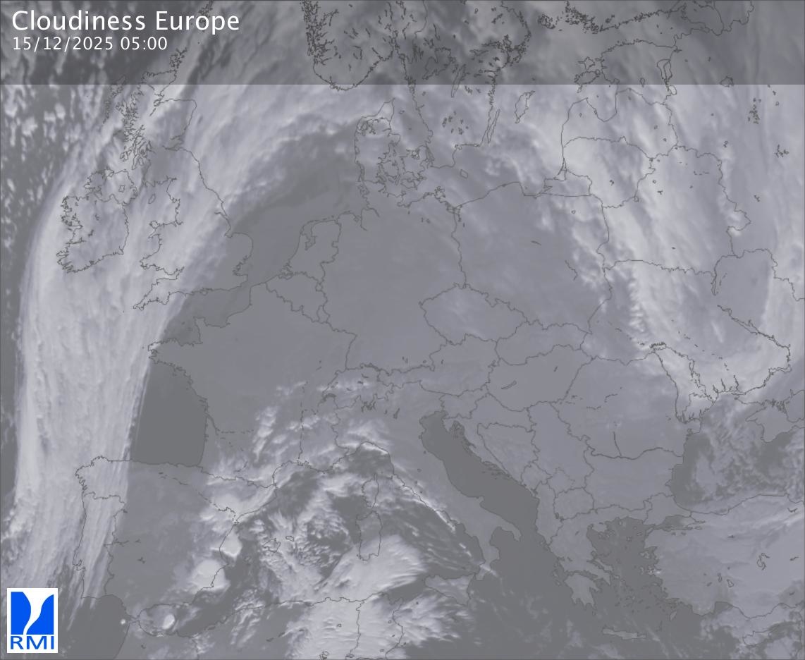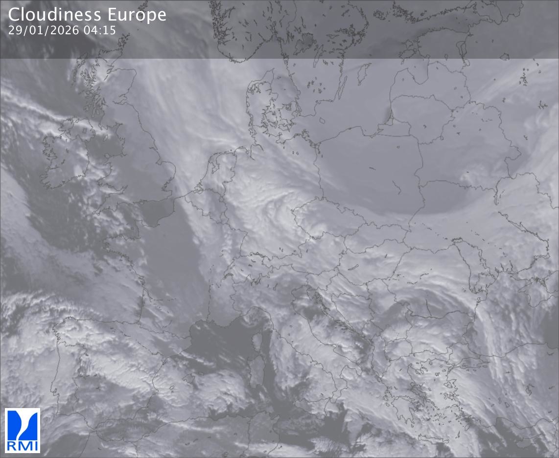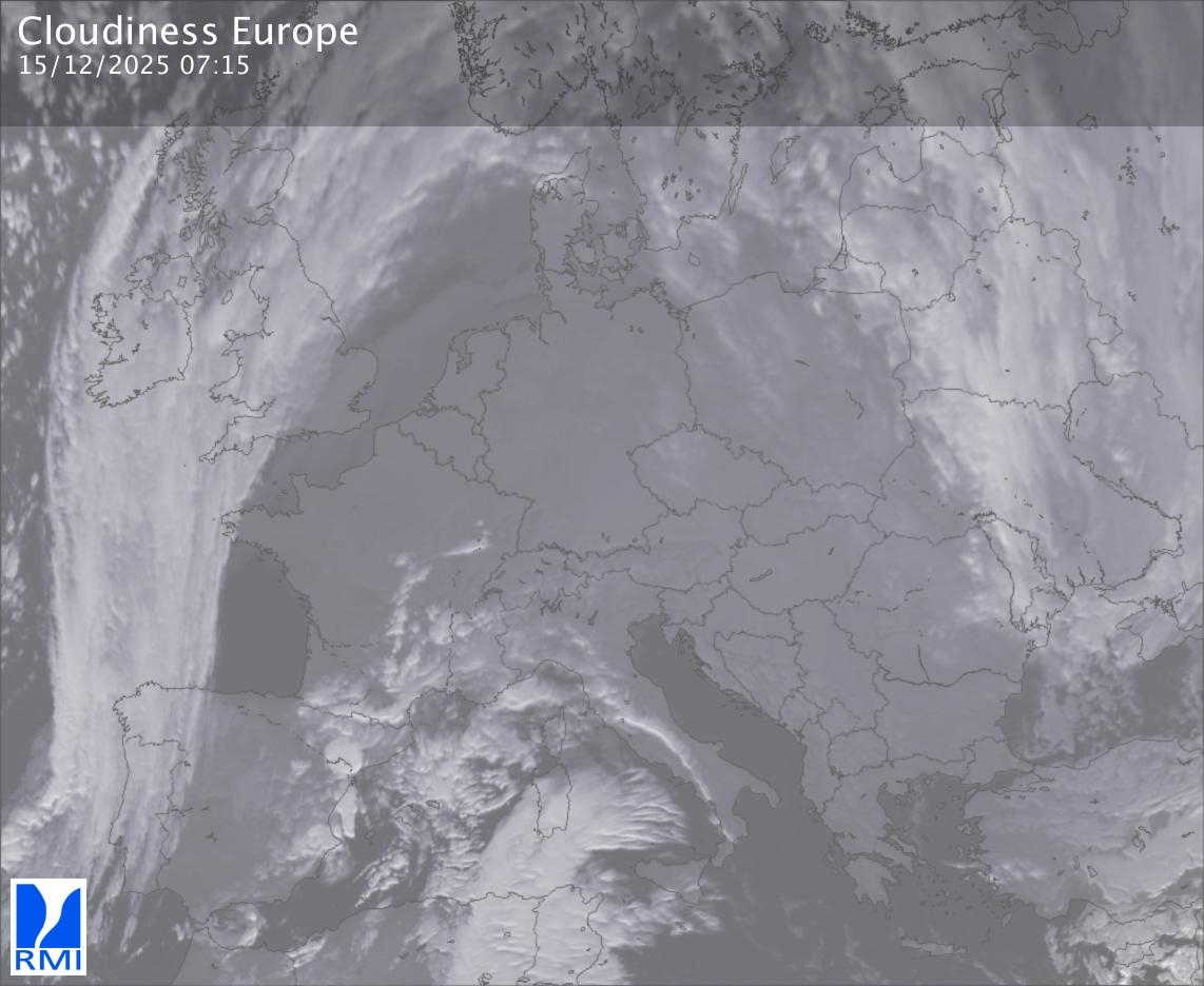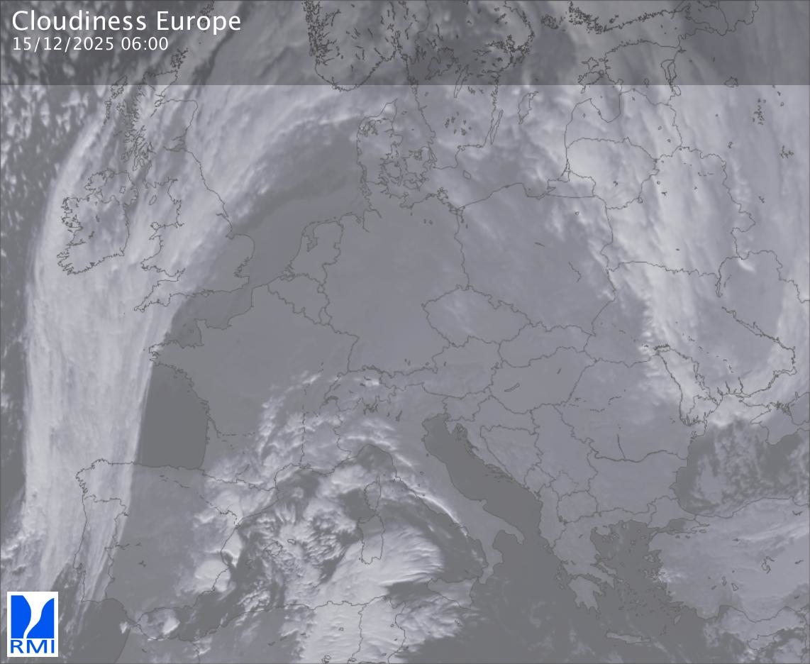 The satellite image of Europe is composed by using both the infrared and the visible light channel from the satellite. Because there are no usable visible light images during the night this composition of channels gives us an image that can be used to observe the clouds by day and by night. The pixelated artifacts are due to the lower resolution of the infrared channel.