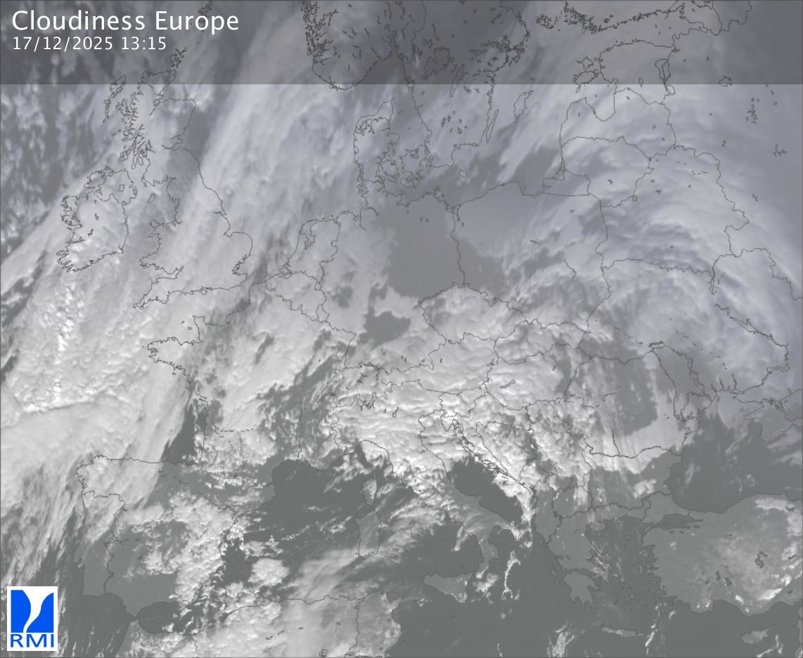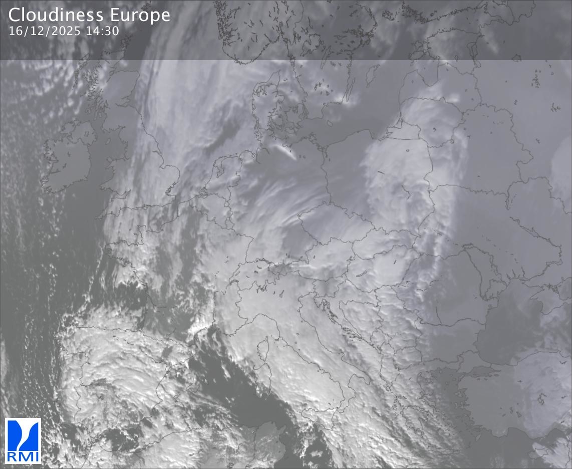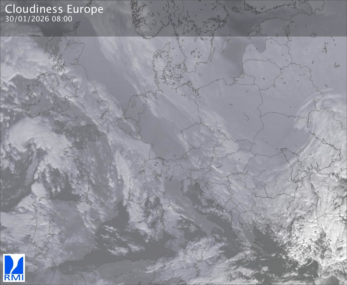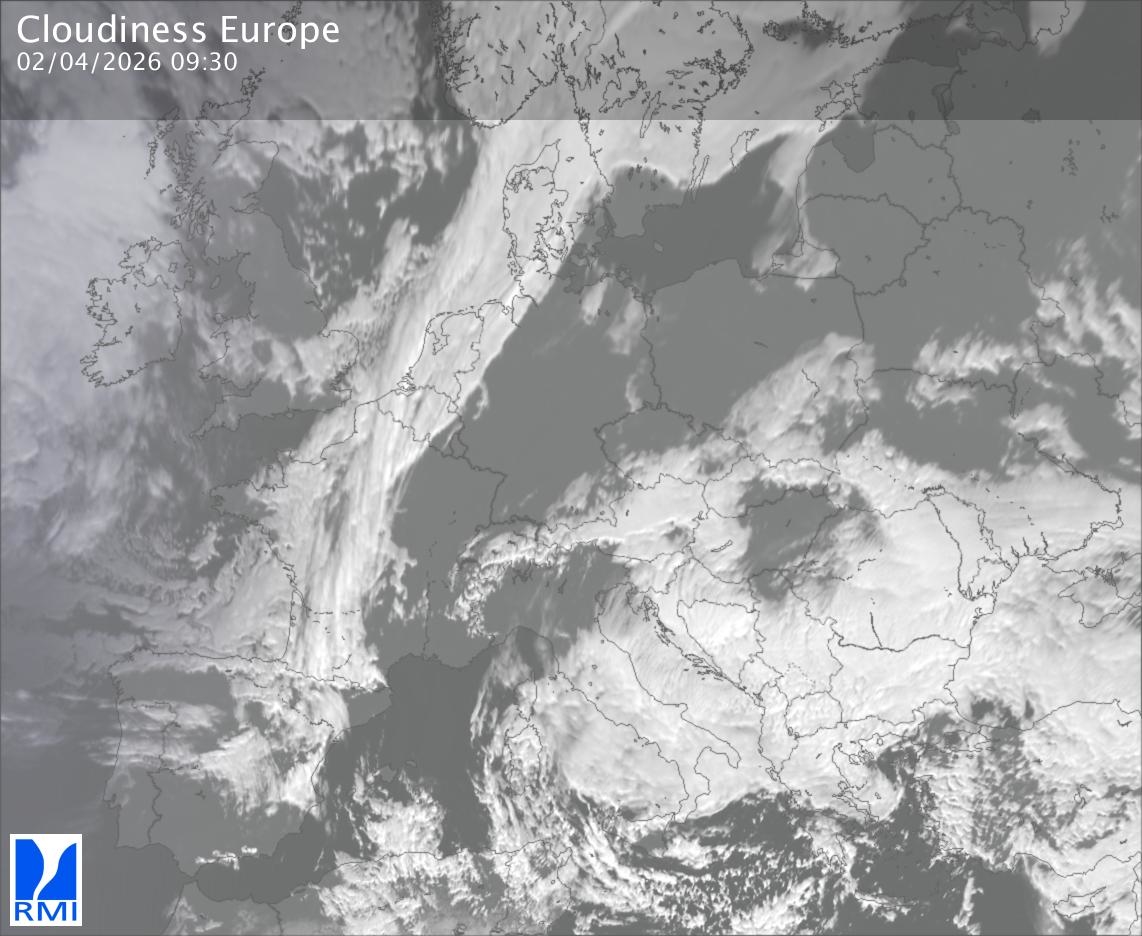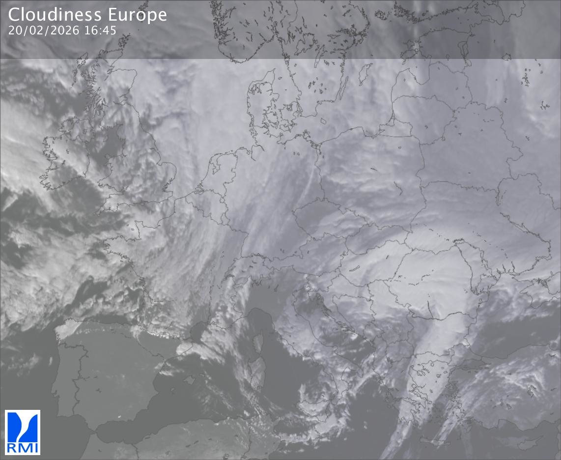 The satellite image of Europe is composed by using both the infrared and the visible light channel from the satellite. Because there are no usable visible light images during the night this composition of channels gives us an image that can be used to observe the clouds by day and by night. The pixelated artifacts are due to the lower resolution of the infrared channel.