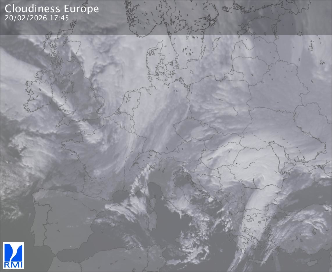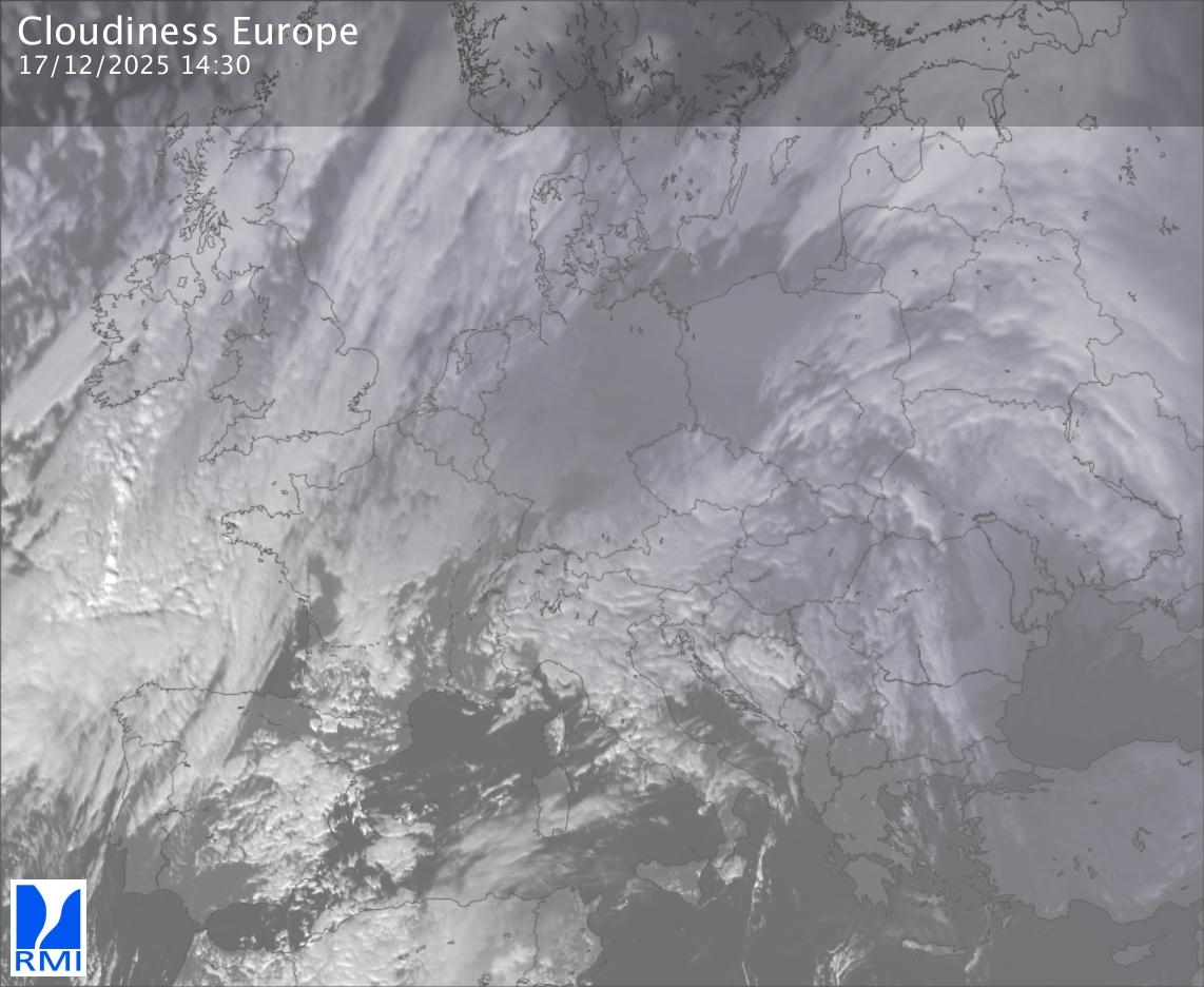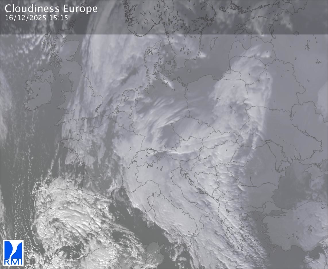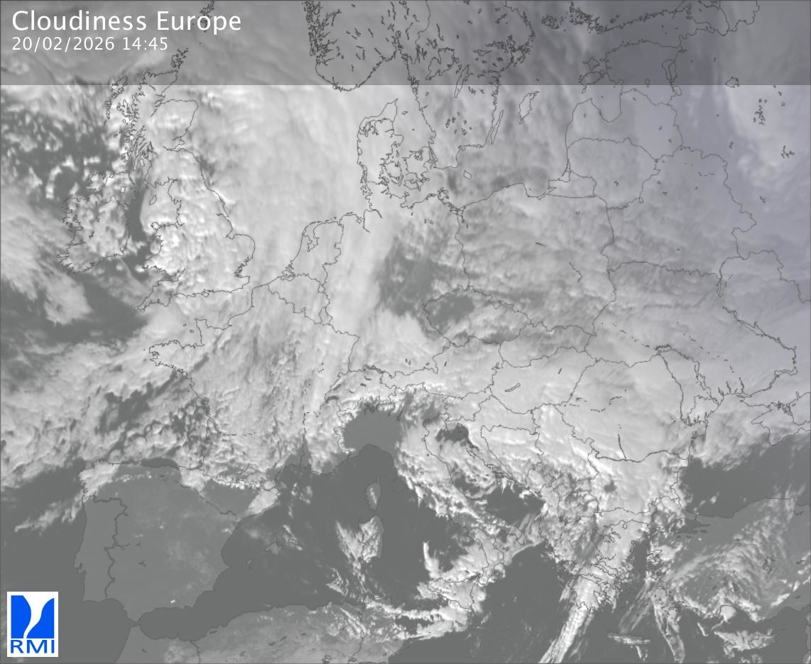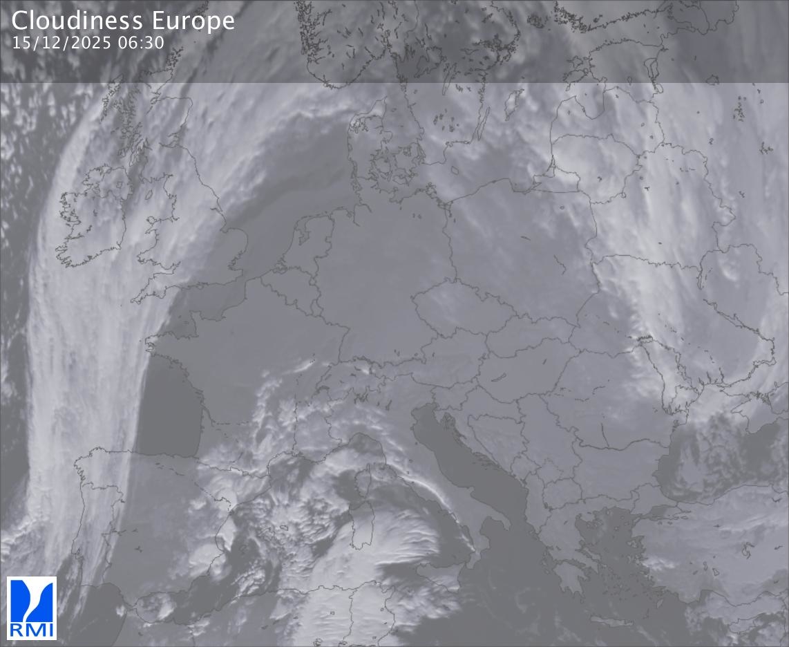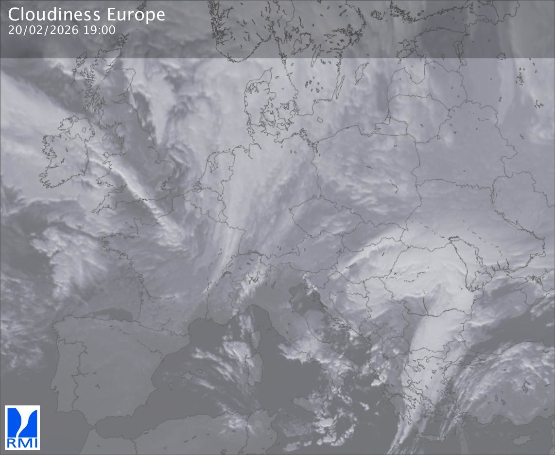 The satellite image of Europe is composed by using both the infrared and the visible light channel from the satellite. Because there are no usable visible light images during the night this composition of channels gives us an image that can be used to observe the clouds by day and by night. The pixelated artifacts are due to the lower resolution of the infrared channel.