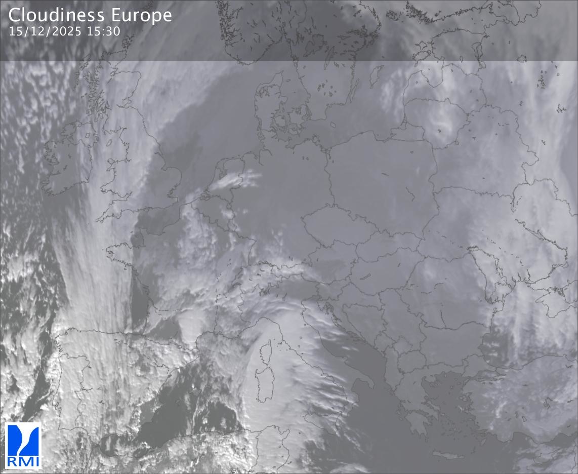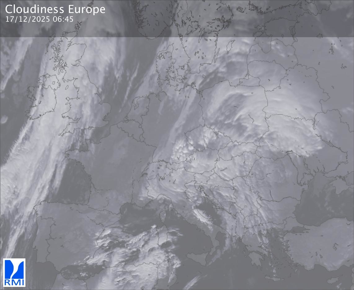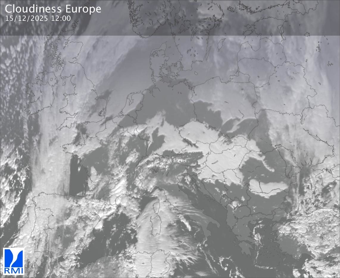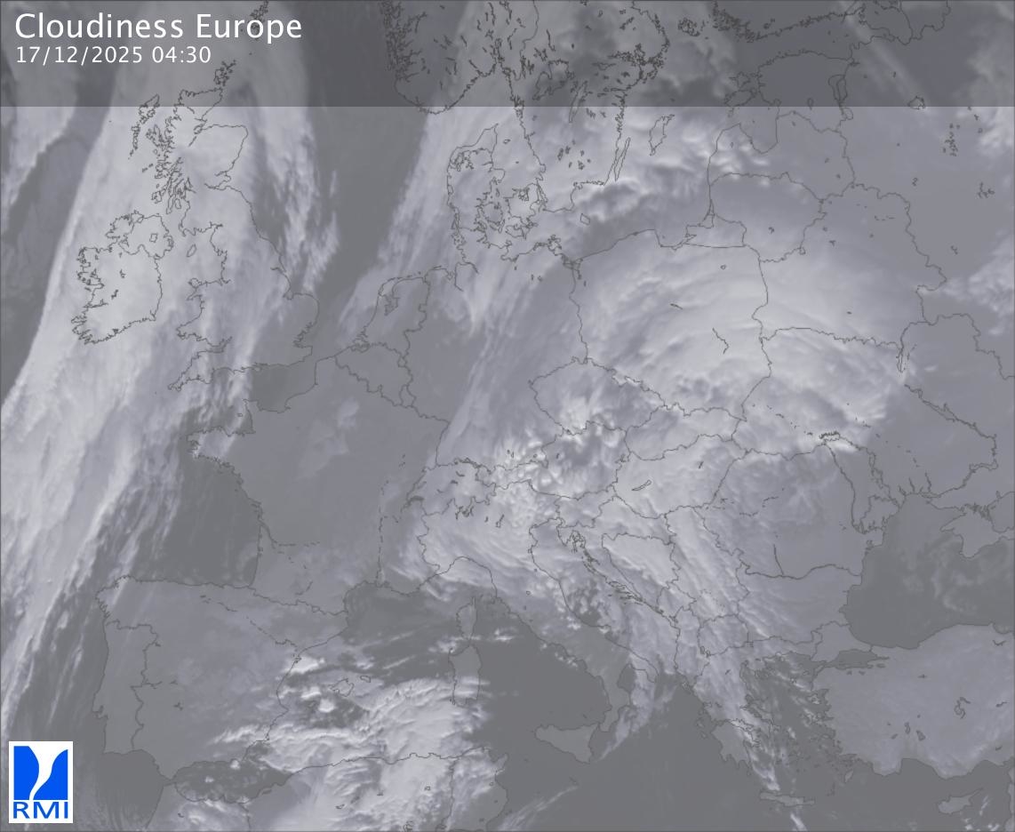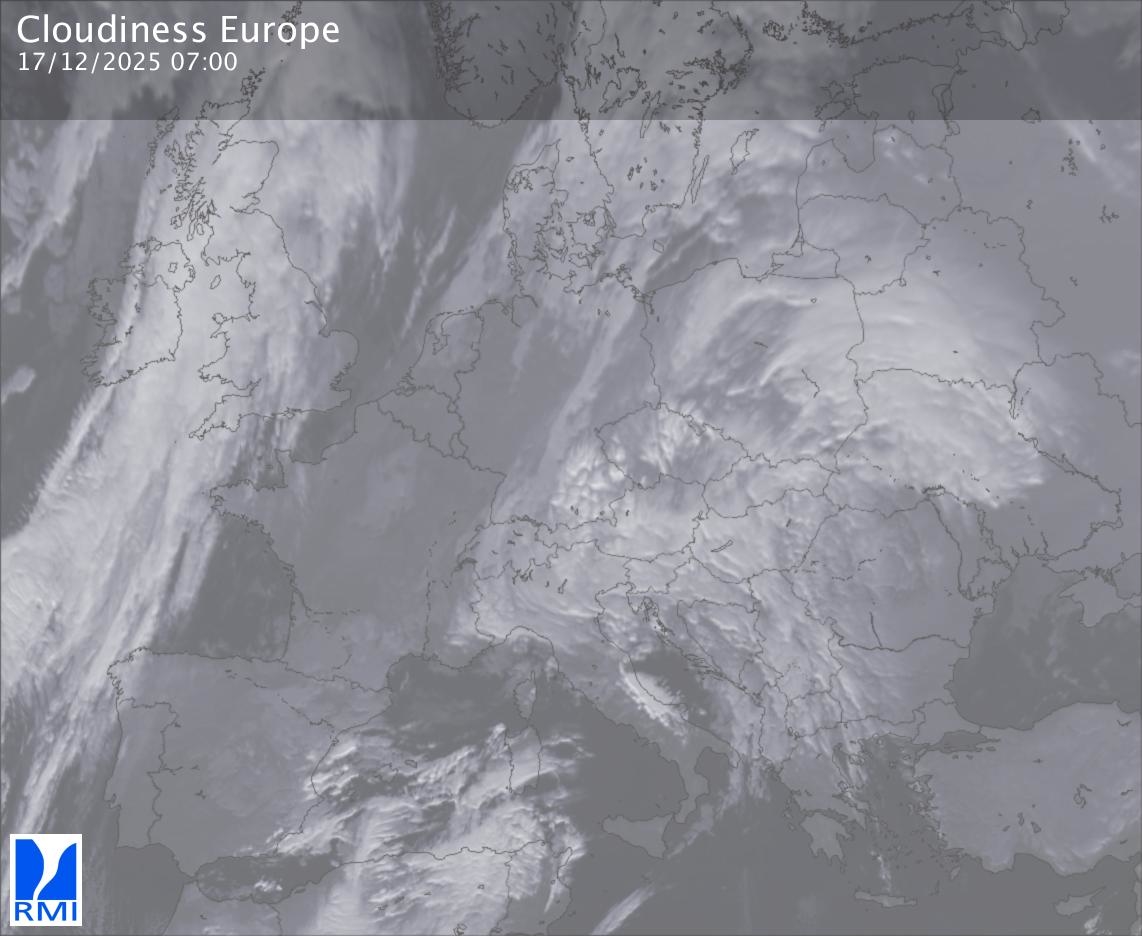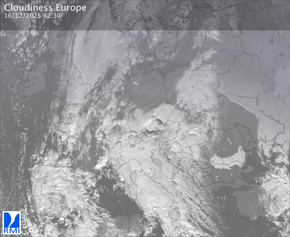 The satellite image of Europe is composed by using both the infrared and the visible light channel from the satellite. Because there are no usable visible light images during the night this composition of channels gives us an image that can be used to observe the clouds by day and by night. The pixelated artifacts are due to the lower resolution of the infrared channel.