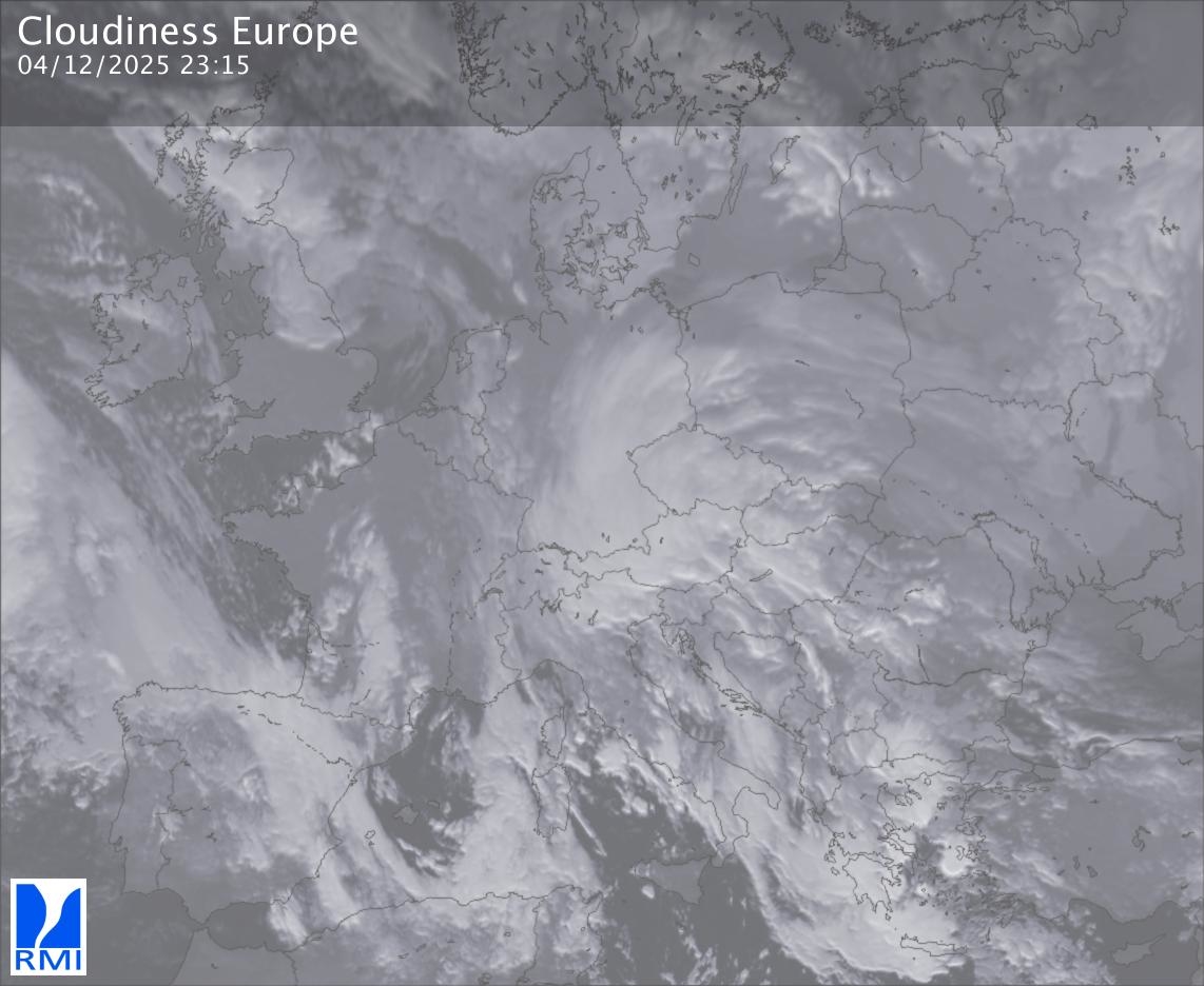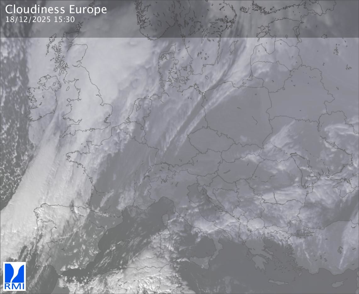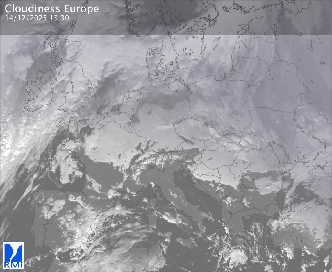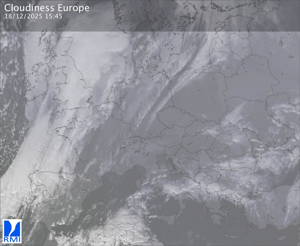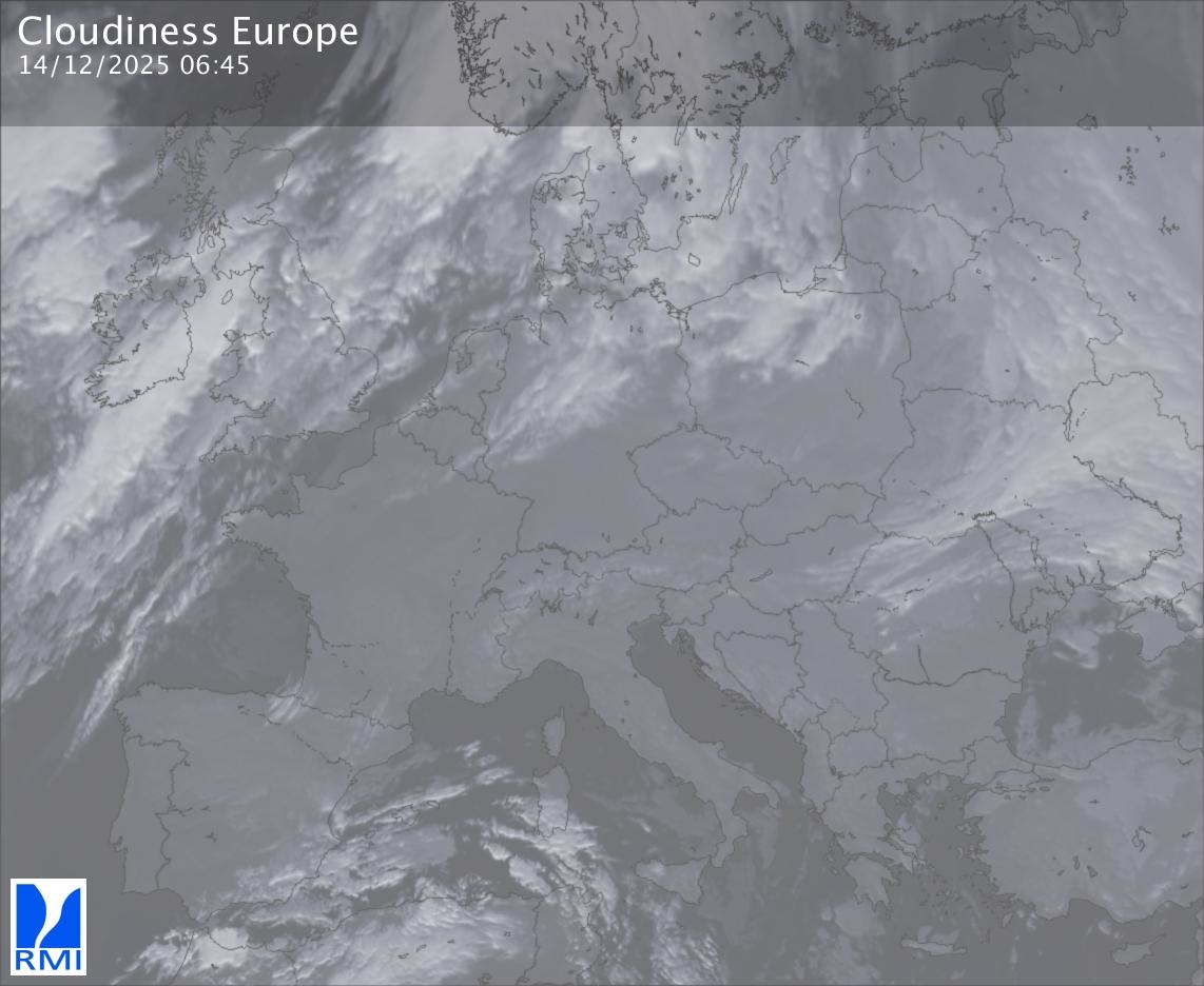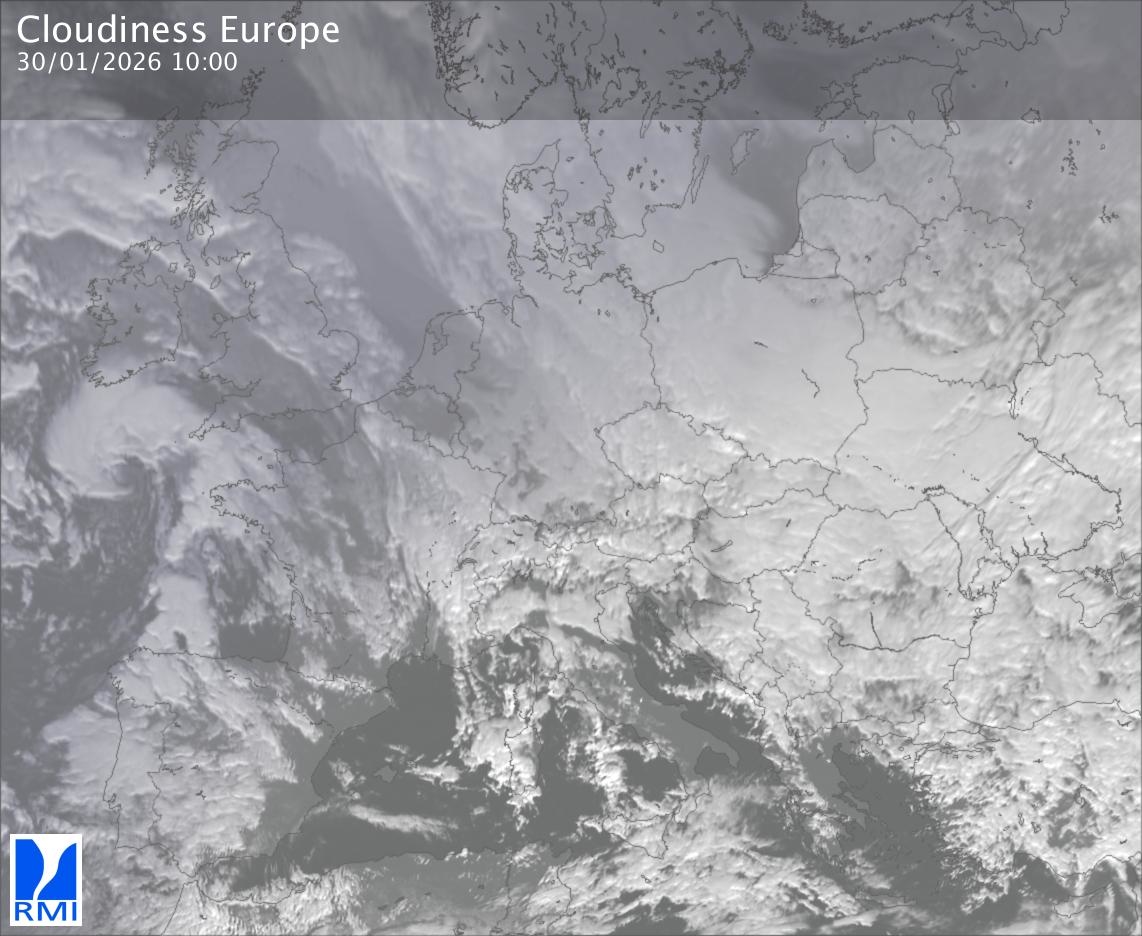 The satellite image of Europe is composed by using both the infrared and the visible light channel from the satellite. Because there are no usable visible light images during the night this composition of channels gives us an image that can be used to observe the clouds by day and by night. The pixelated artifacts are due to the lower resolution of the infrared channel.