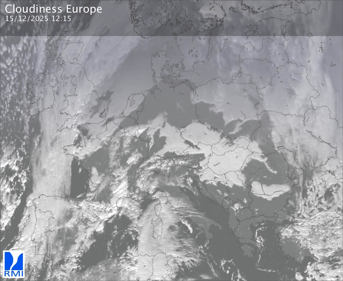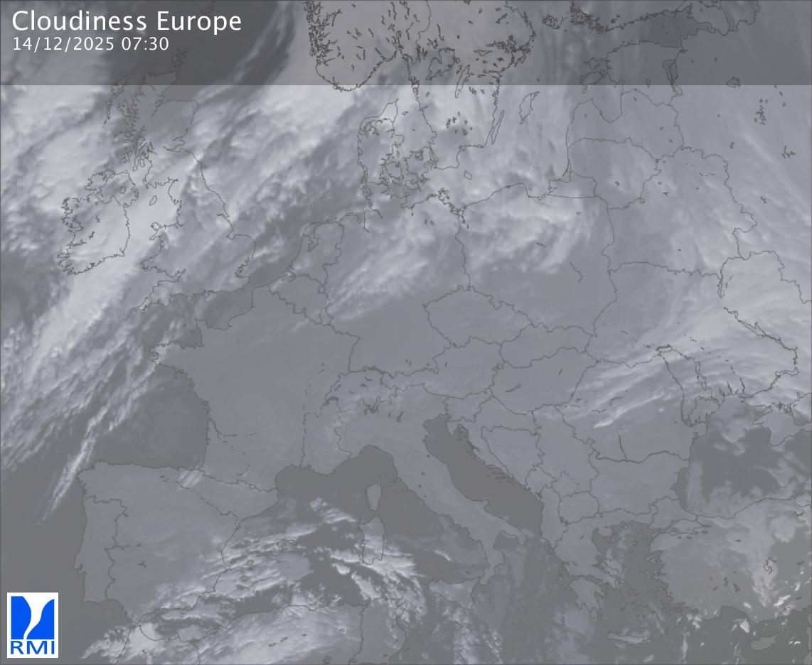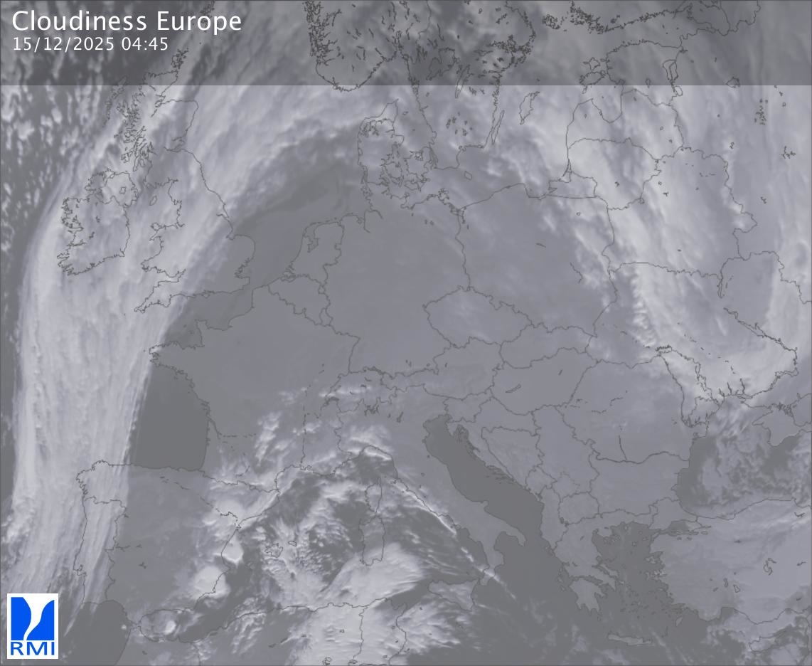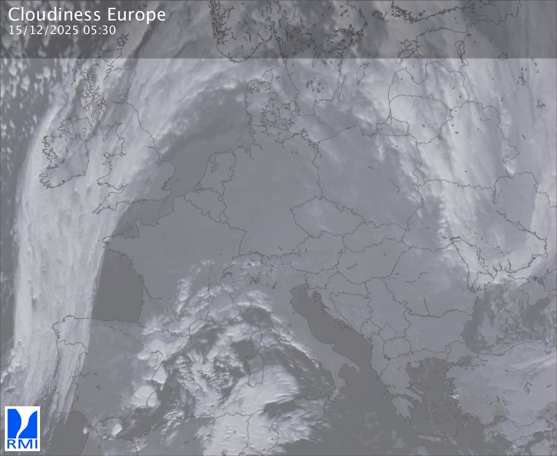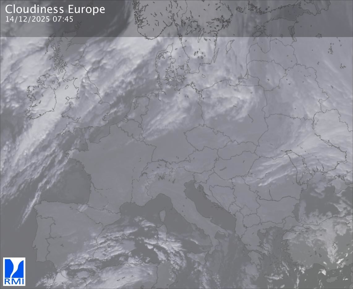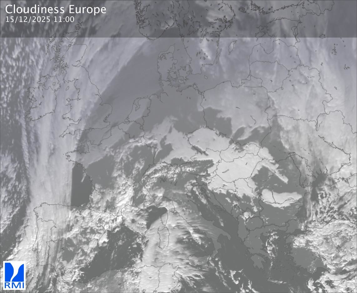 The satellite image of Europe is composed by using both the infrared and the visible light channel from the satellite. Because there are no usable visible light images during the night this composition of channels gives us an image that can be used to observe the clouds by day and by night. The pixelated artifacts are due to the lower resolution of the infrared channel.