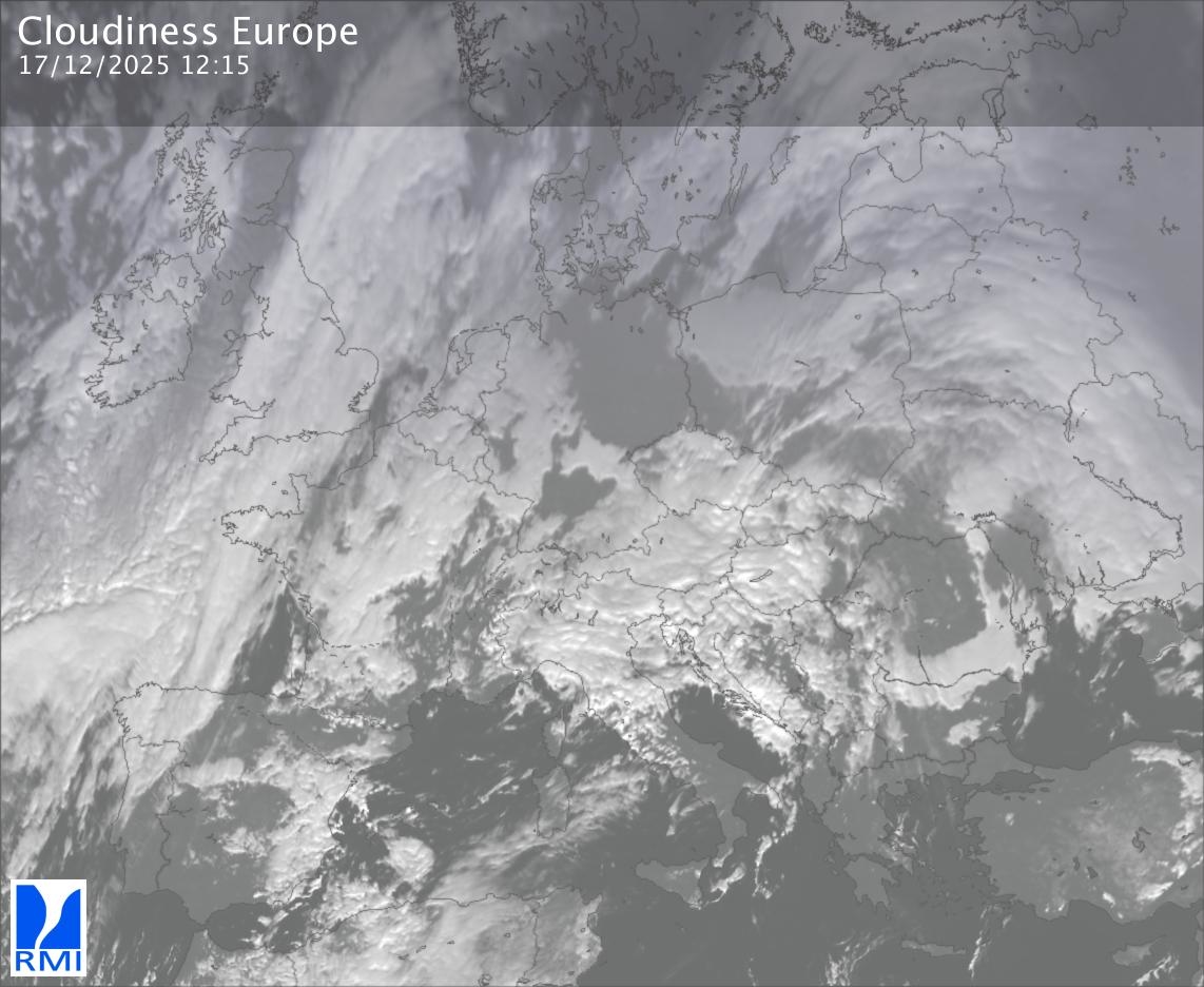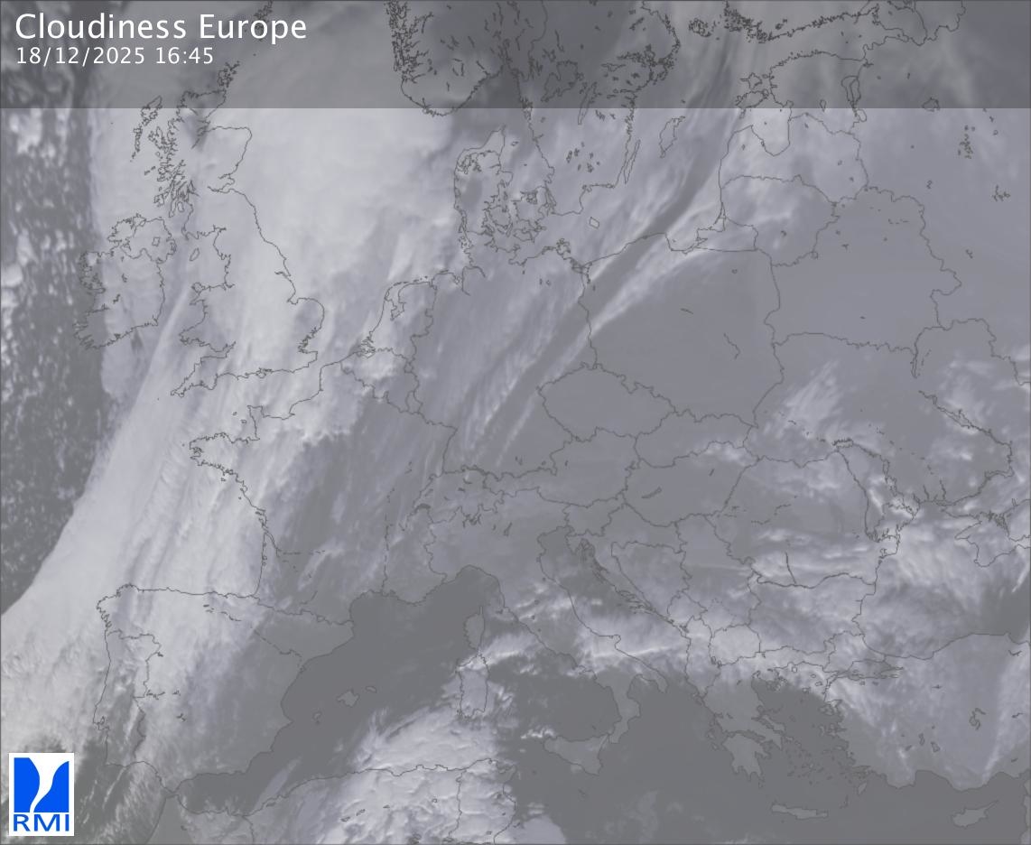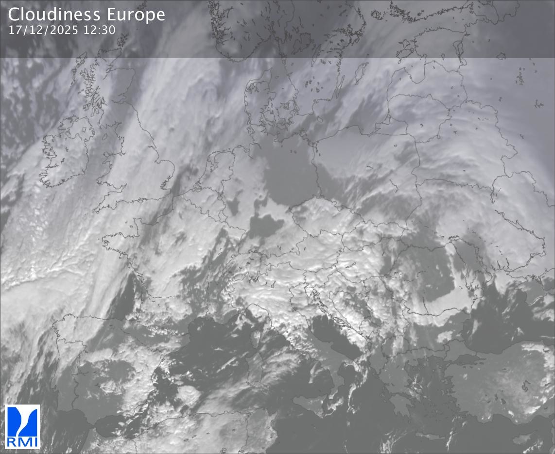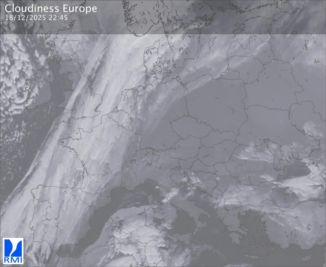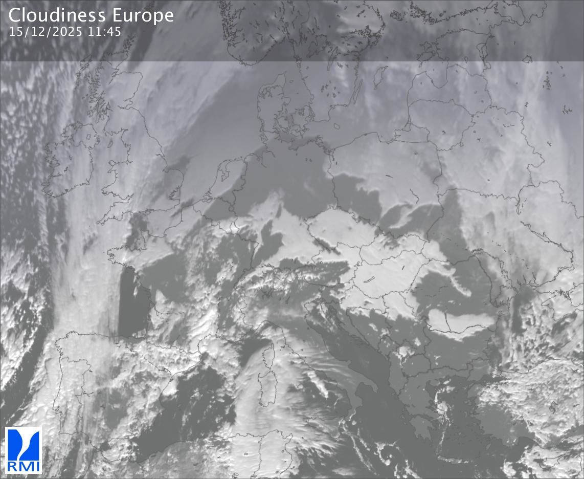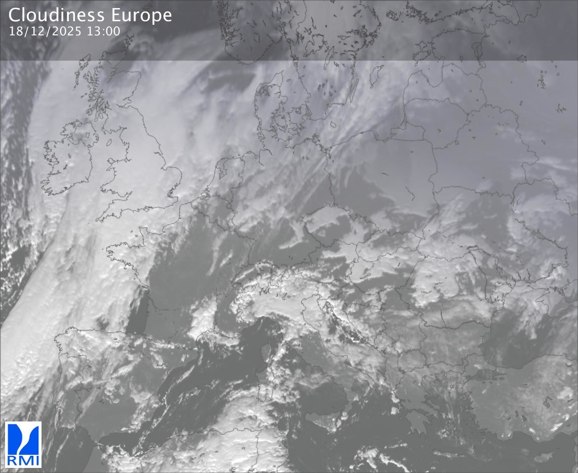 The satellite image of Europe is composed by using both the infrared and the visible light channel from the satellite. Because there are no usable visible light images during the night this composition of channels gives us an image that can be used to observe the clouds by day and by night. The pixelated artifacts are due to the lower resolution of the infrared channel.