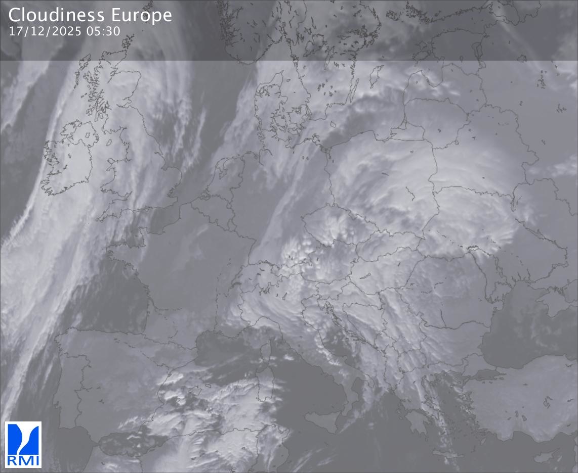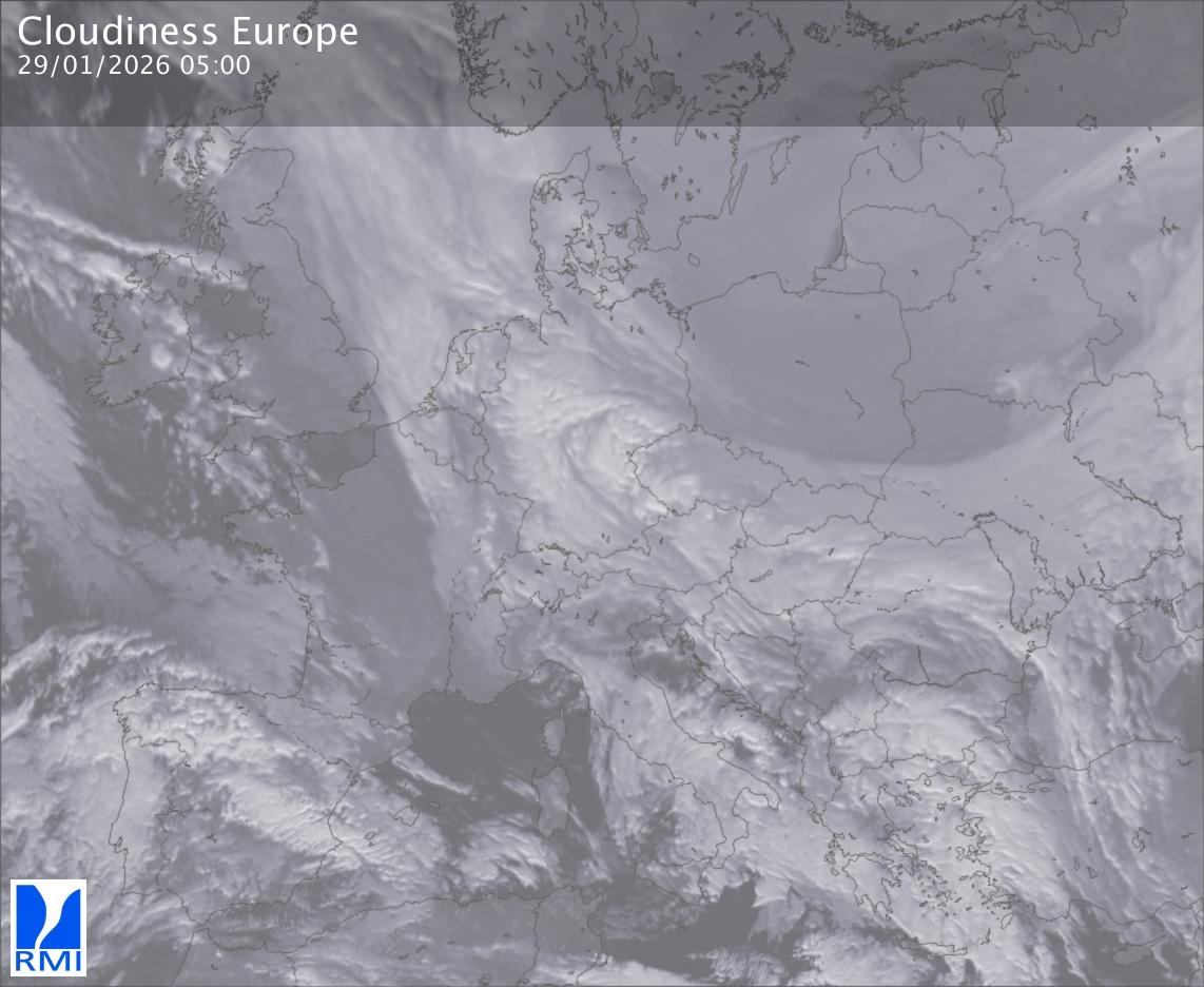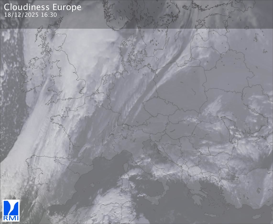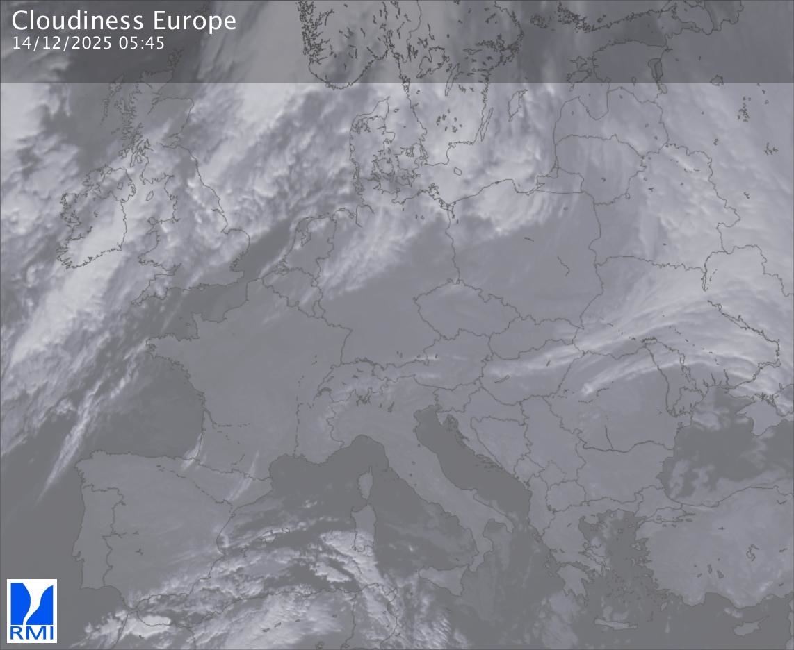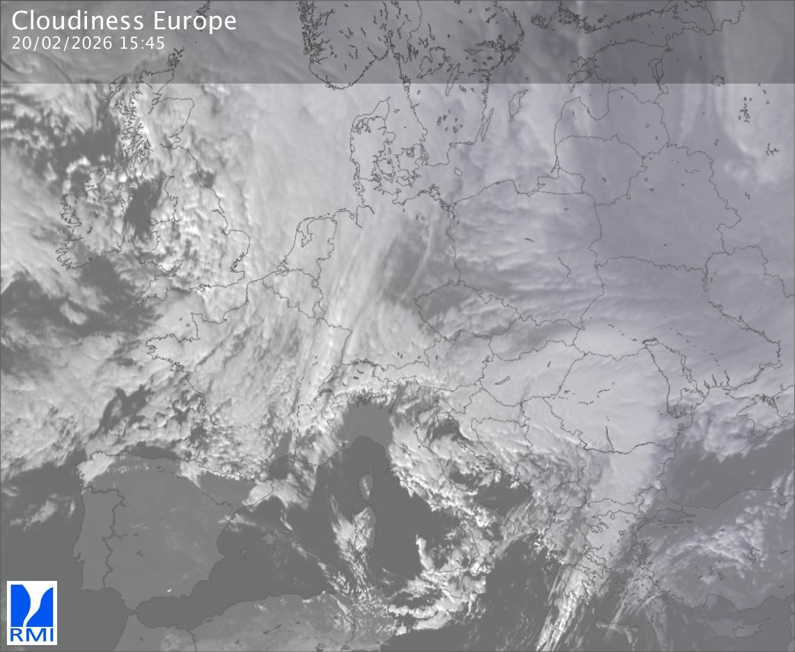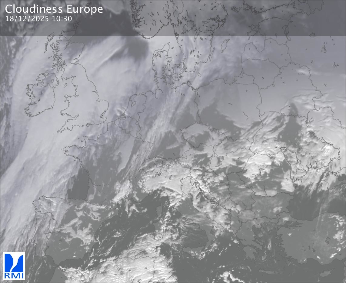 The satellite image of Europe is composed by using both the infrared and the visible light channel from the satellite. Because there are no usable visible light images during the night this composition of channels gives us an image that can be used to observe the clouds by day and by night. The pixelated artifacts are due to the lower resolution of the infrared channel.