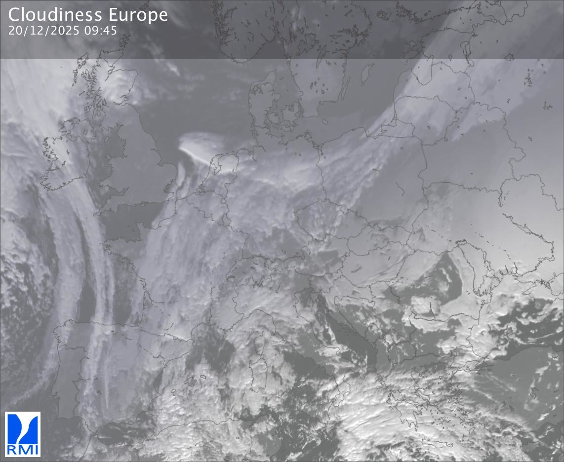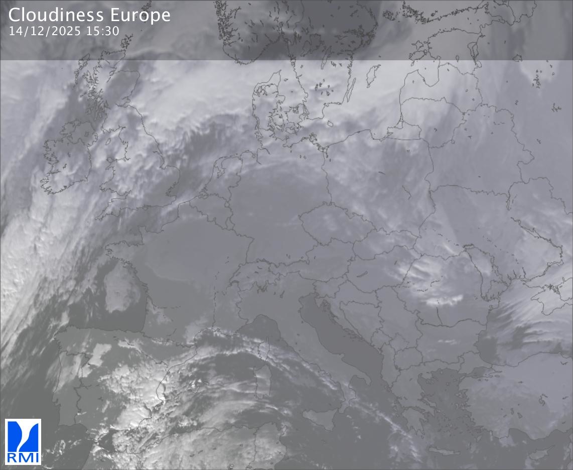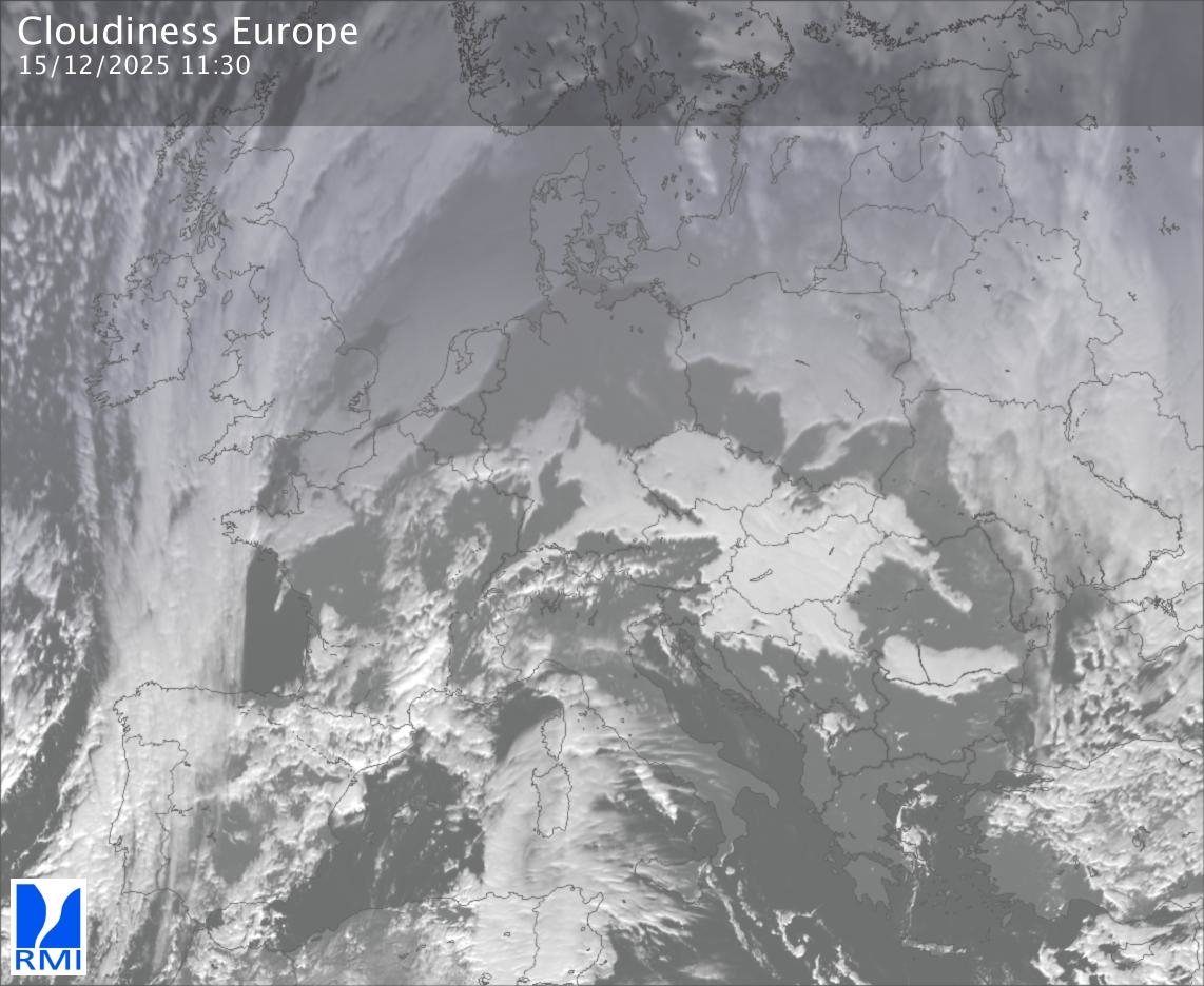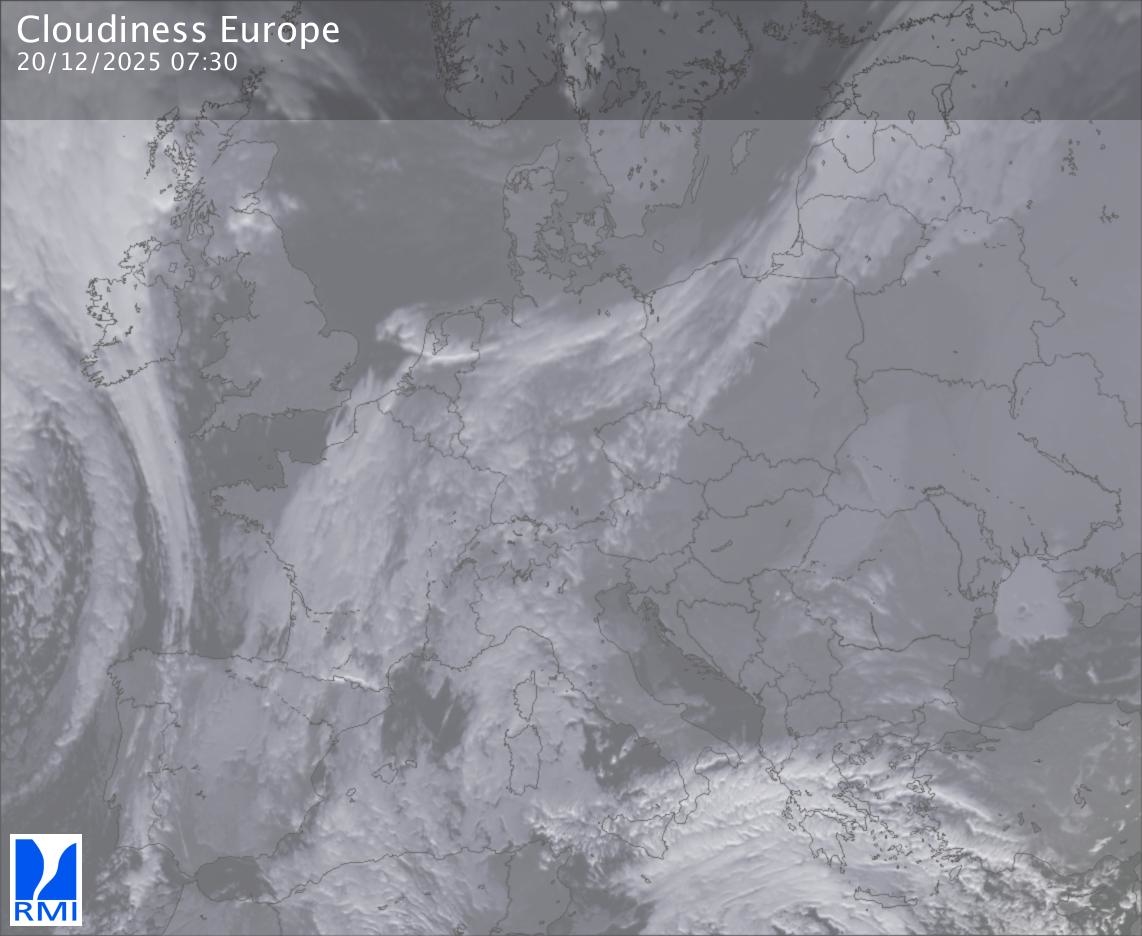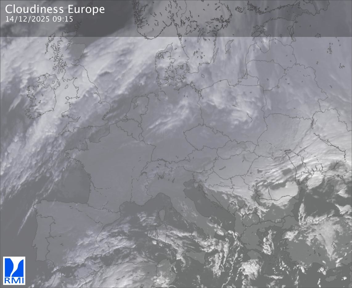 The satellite image of Europe is composed by using both the infrared and the visible light channel from the satellite. Because there are no usable visible light images during the night this composition of channels gives us an image that can be used to observe the clouds by day and by night. The pixelated artifacts are due to the lower resolution of the infrared channel.