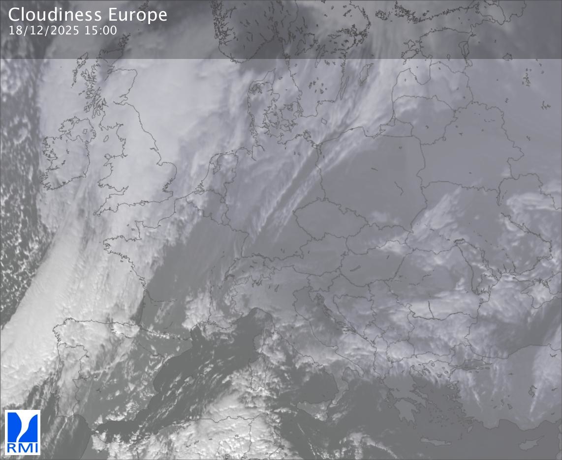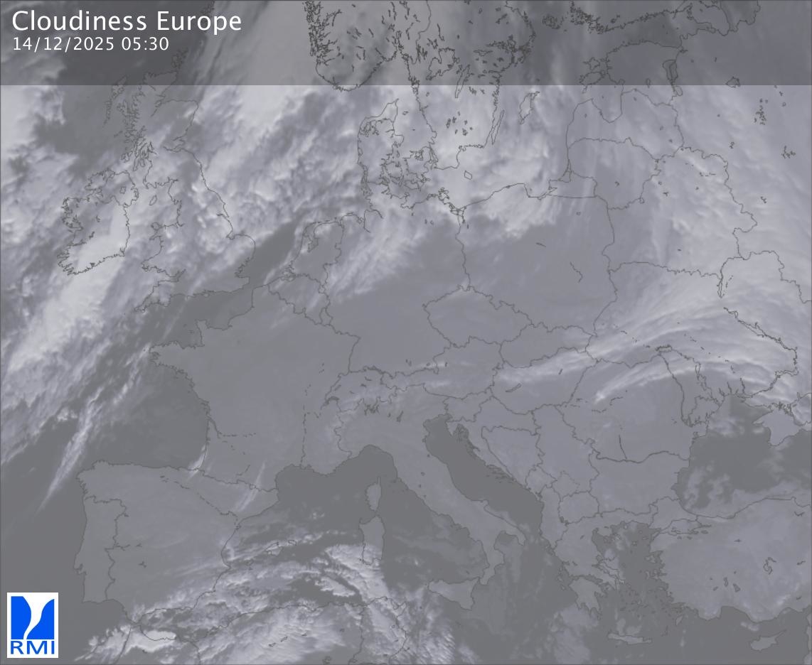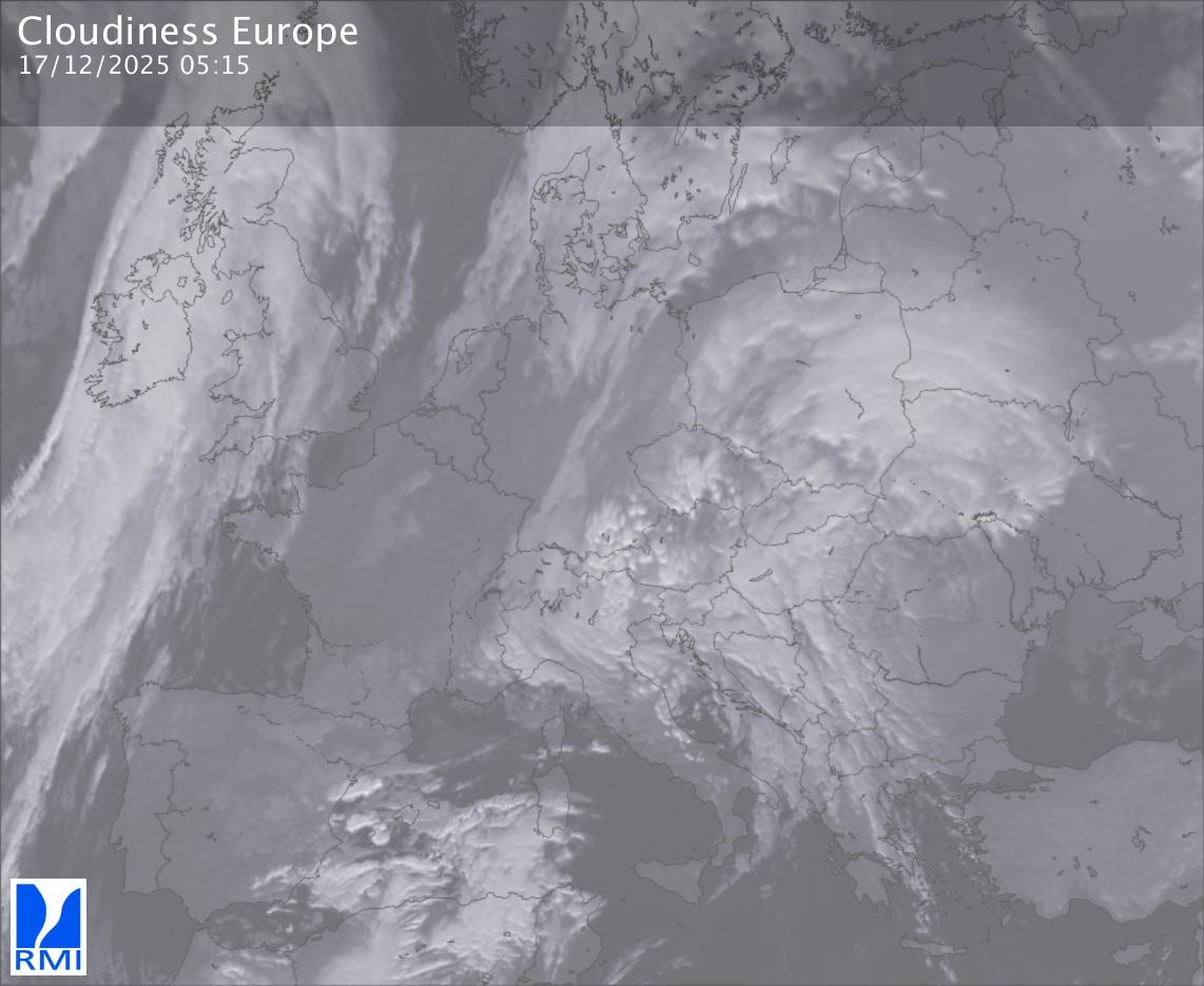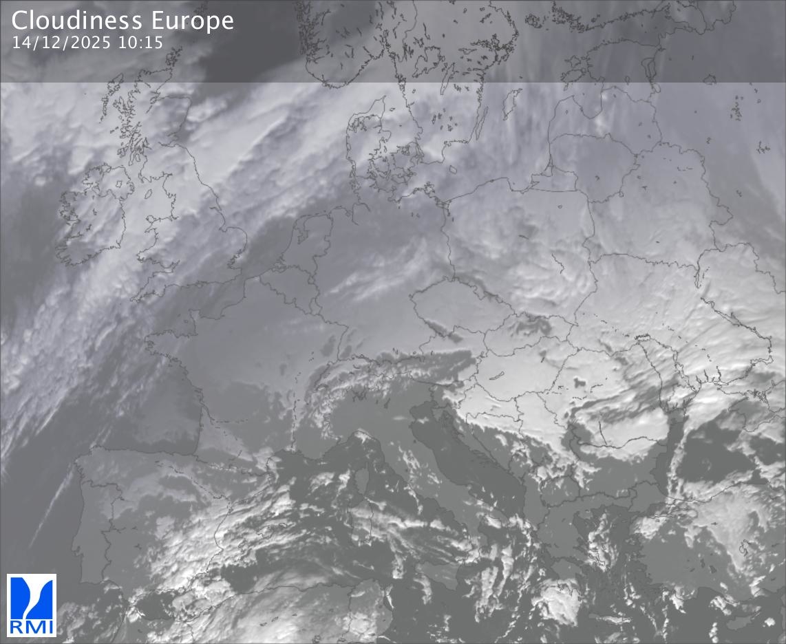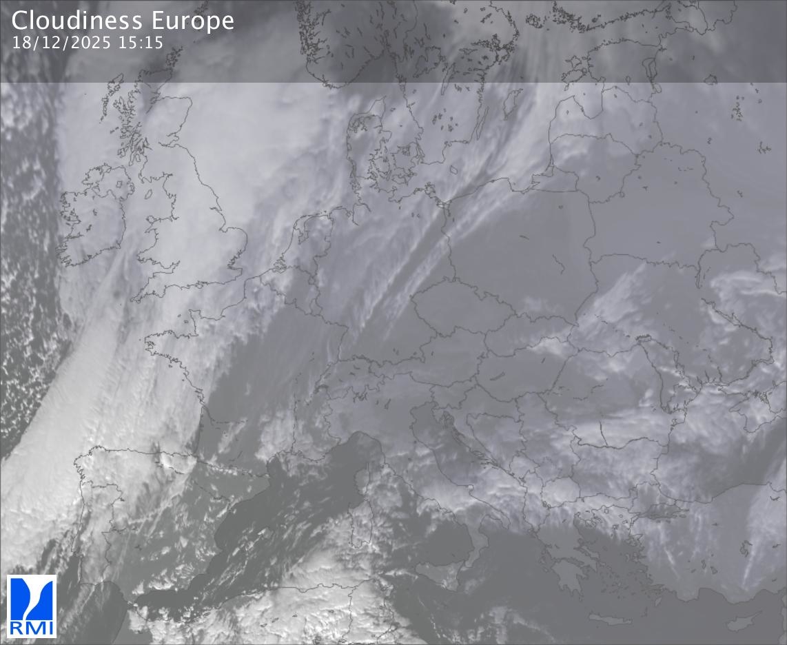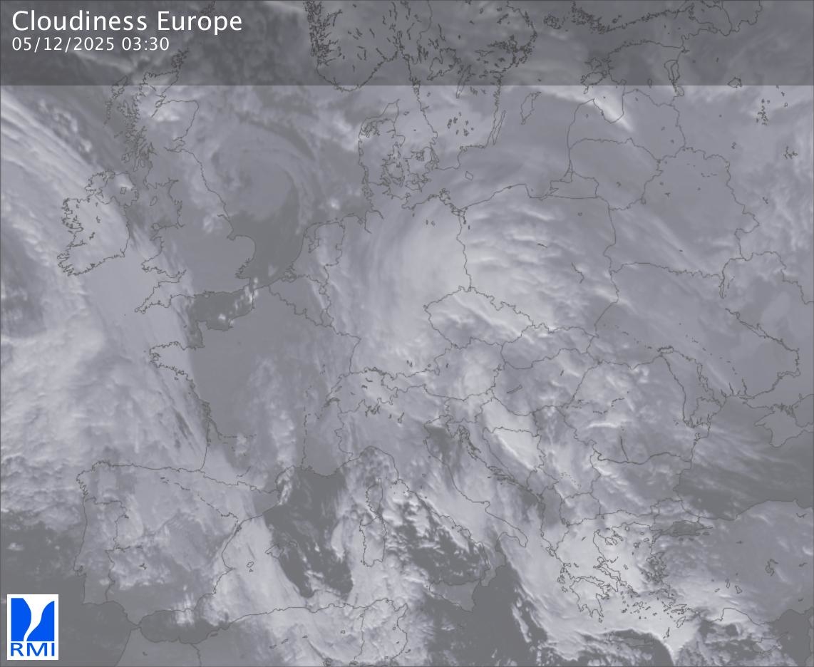 The satellite image of Europe is composed by using both the infrared and the visible light channel from the satellite. Because there are no usable visible light images during the night this composition of channels gives us an image that can be used to observe the clouds by day and by night. The pixelated artifacts are due to the lower resolution of the infrared channel.
