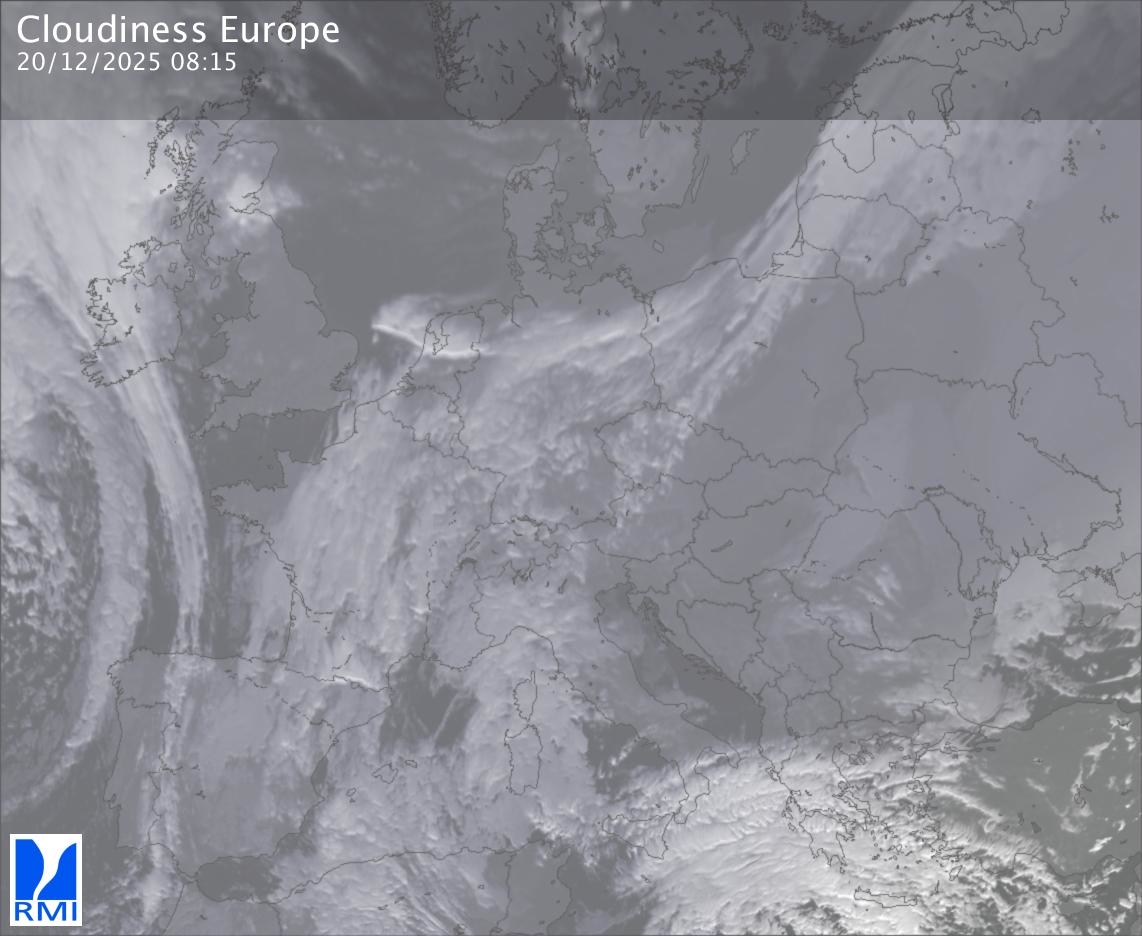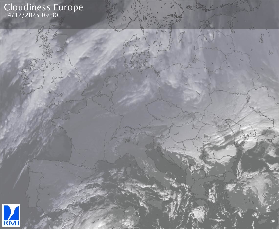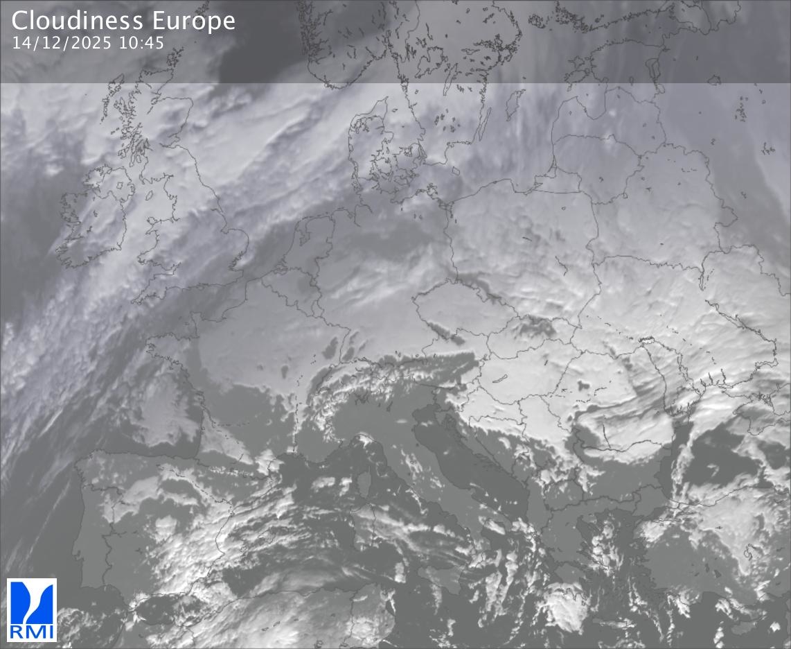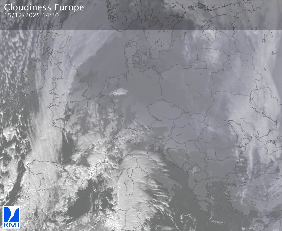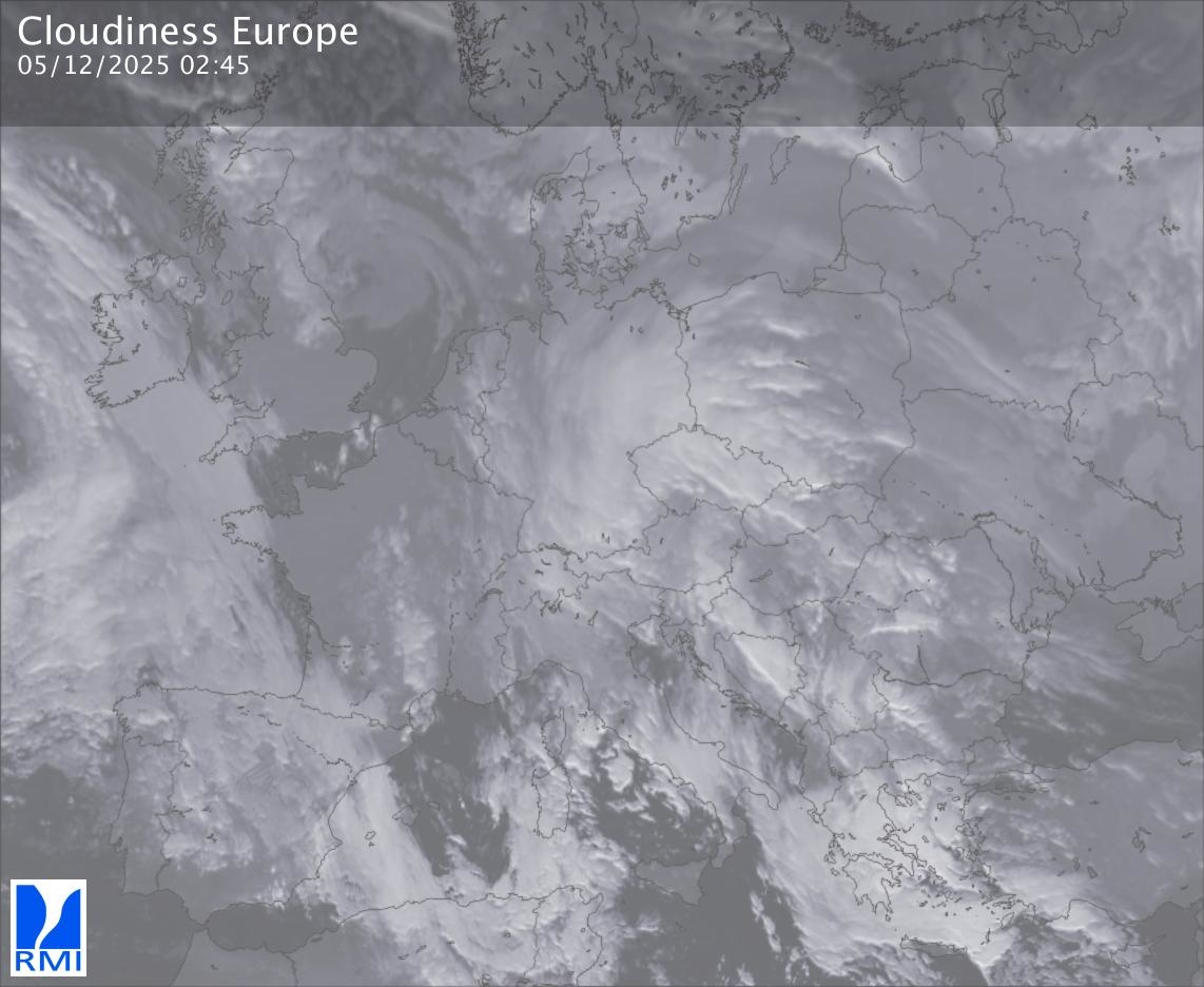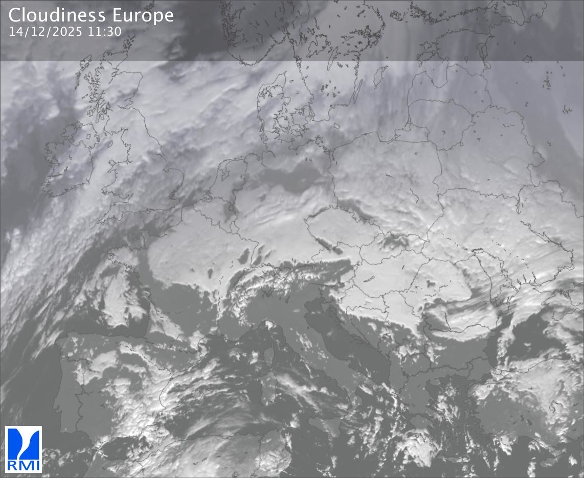 The satellite image of Europe is composed by using both the infrared and the visible light channel from the satellite. Because there are no usable visible light images during the night this composition of channels gives us an image that can be used to observe the clouds by day and by night. The pixelated artifacts are due to the lower resolution of the infrared channel.