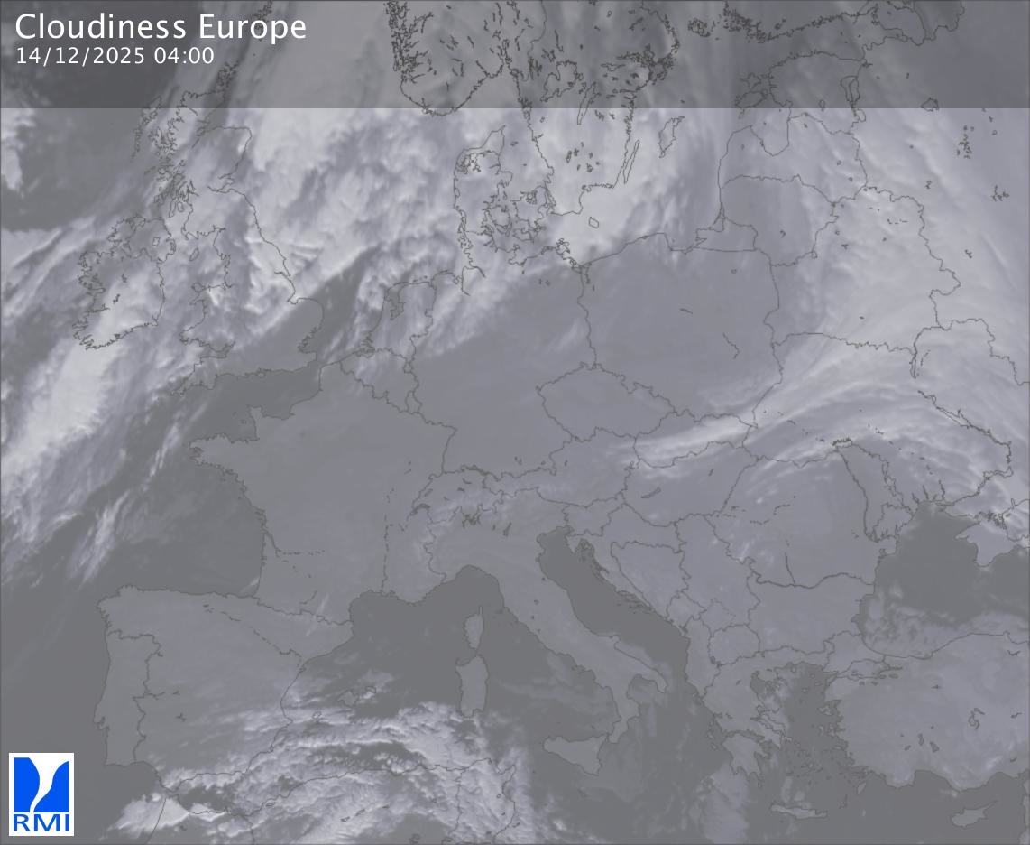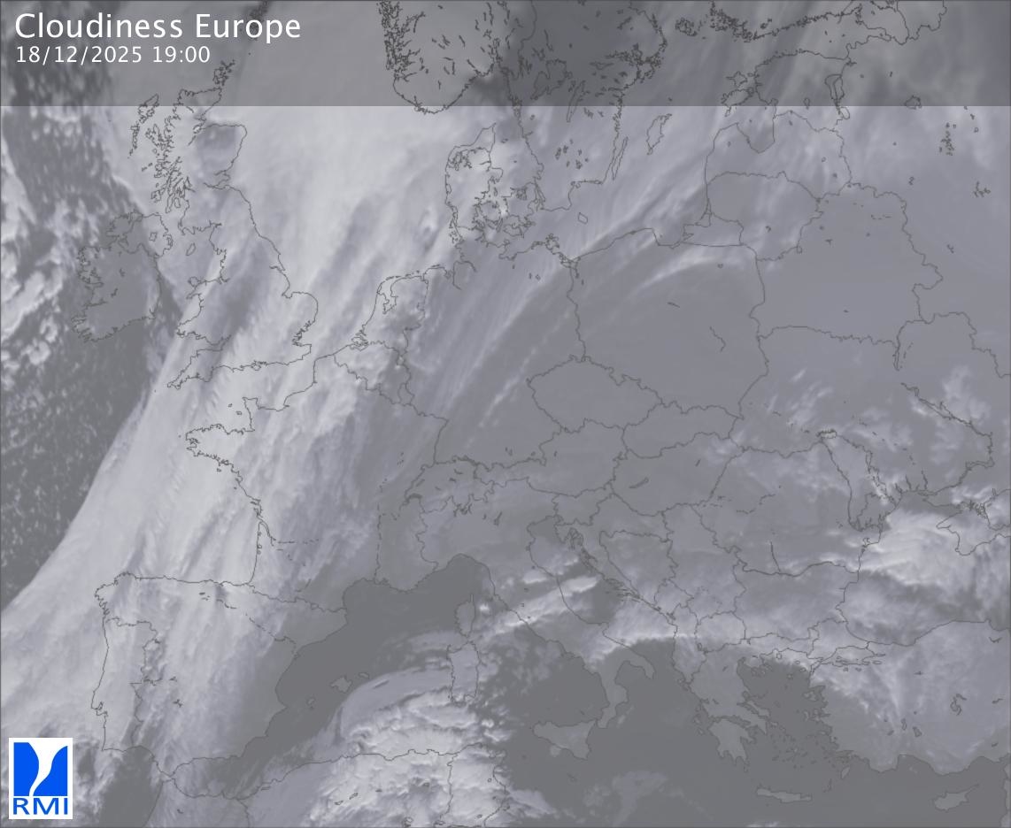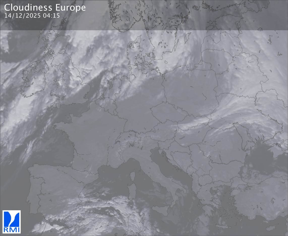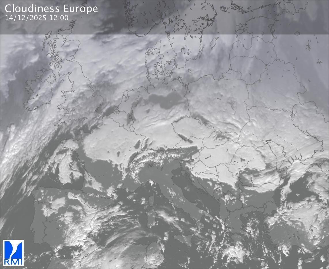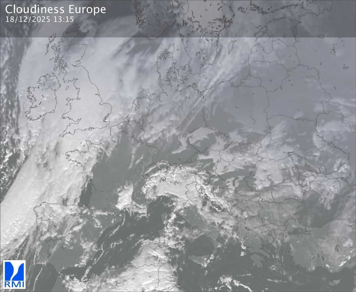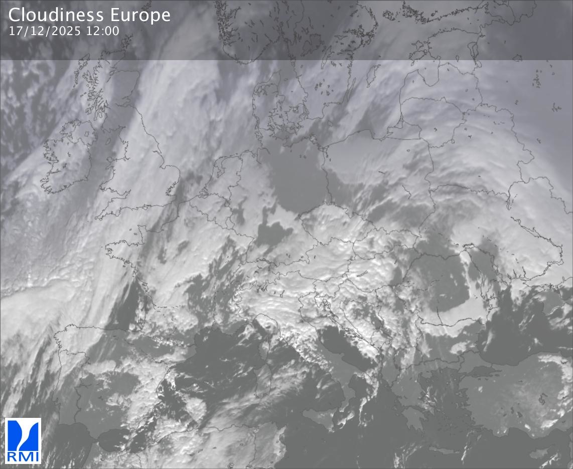 The satellite image of Europe is composed by using both the infrared and the visible light channel from the satellite. Because there are no usable visible light images during the night this composition of channels gives us an image that can be used to observe the clouds by day and by night. The pixelated artifacts are due to the lower resolution of the infrared channel.