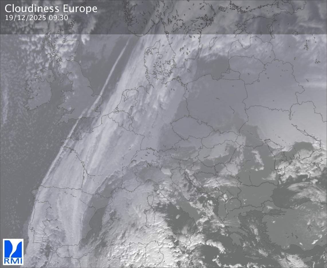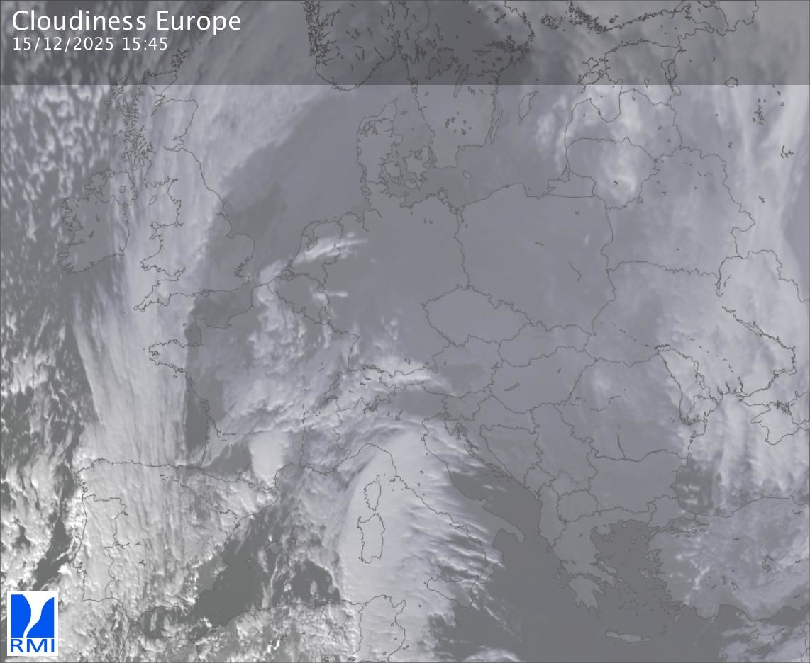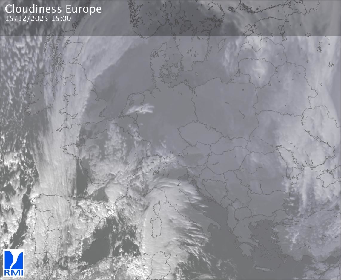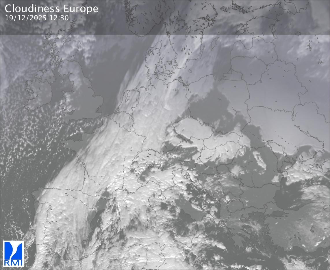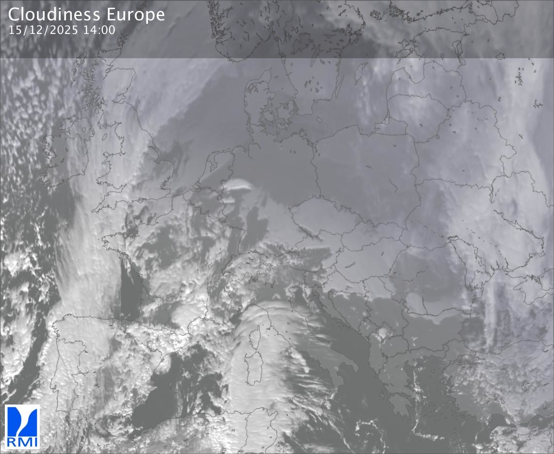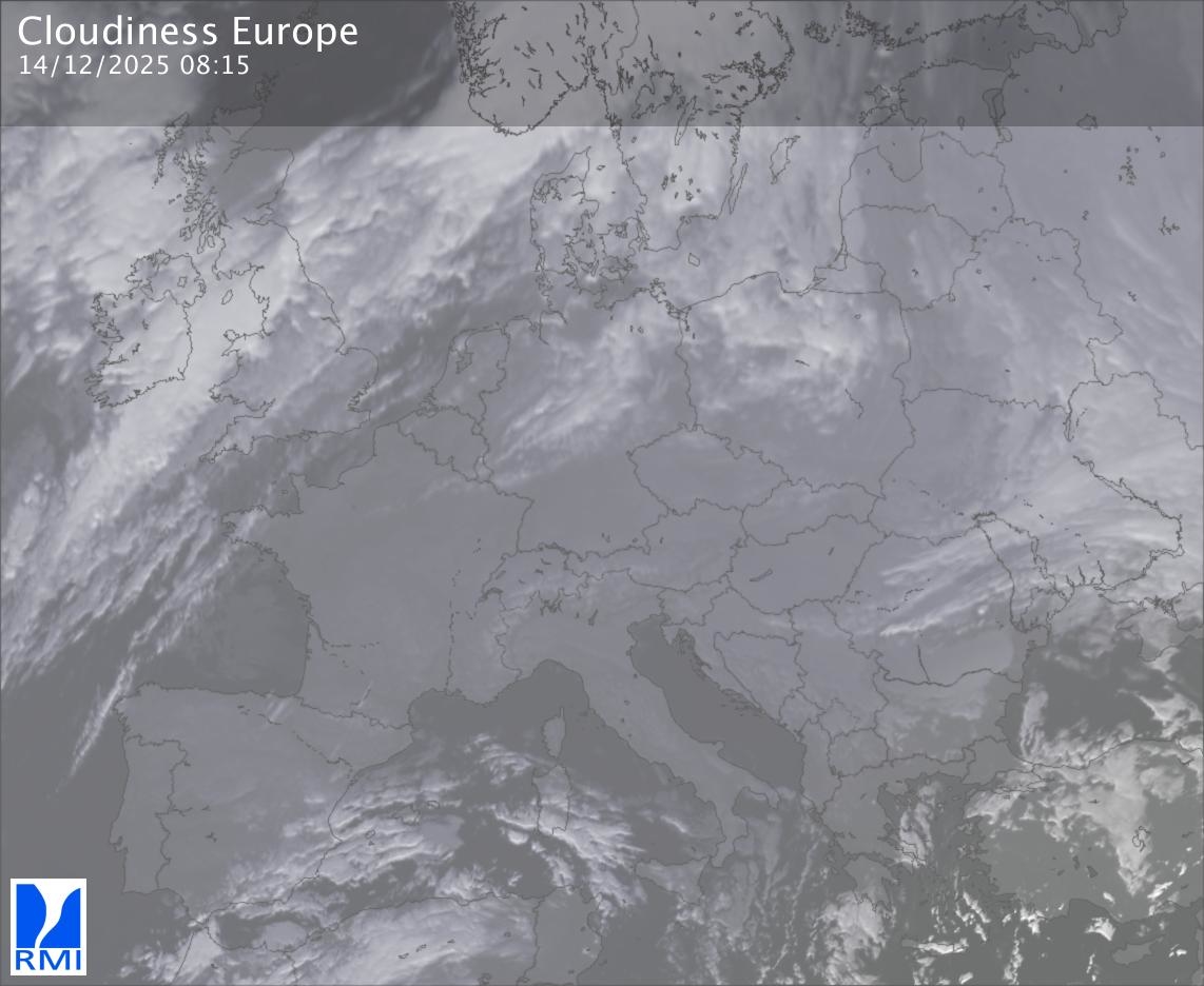 The satellite image of Europe is composed by using both the infrared and the visible light channel from the satellite. Because there are no usable visible light images during the night this composition of channels gives us an image that can be used to observe the clouds by day and by night. The pixelated artifacts are due to the lower resolution of the infrared channel.