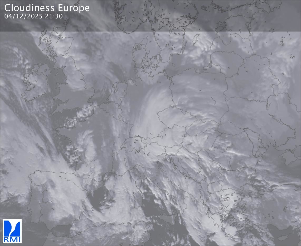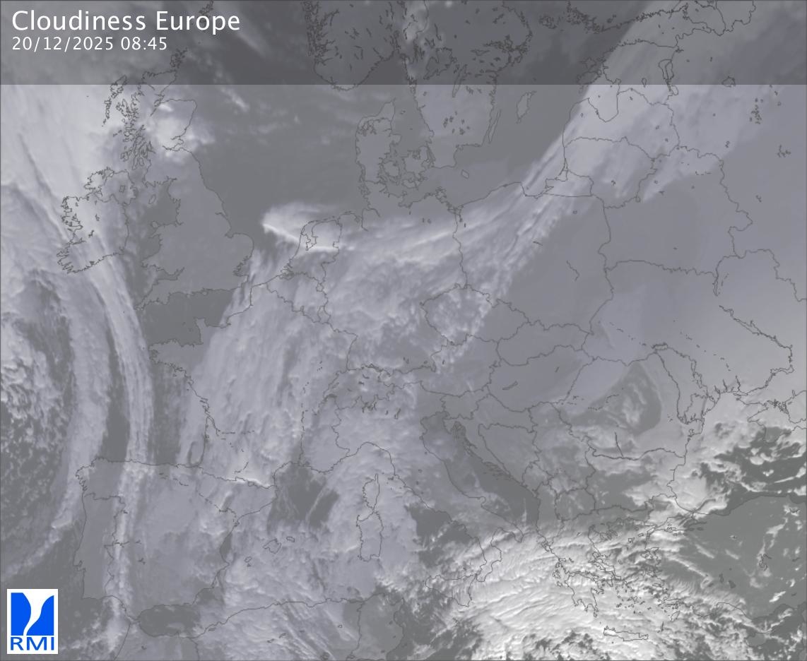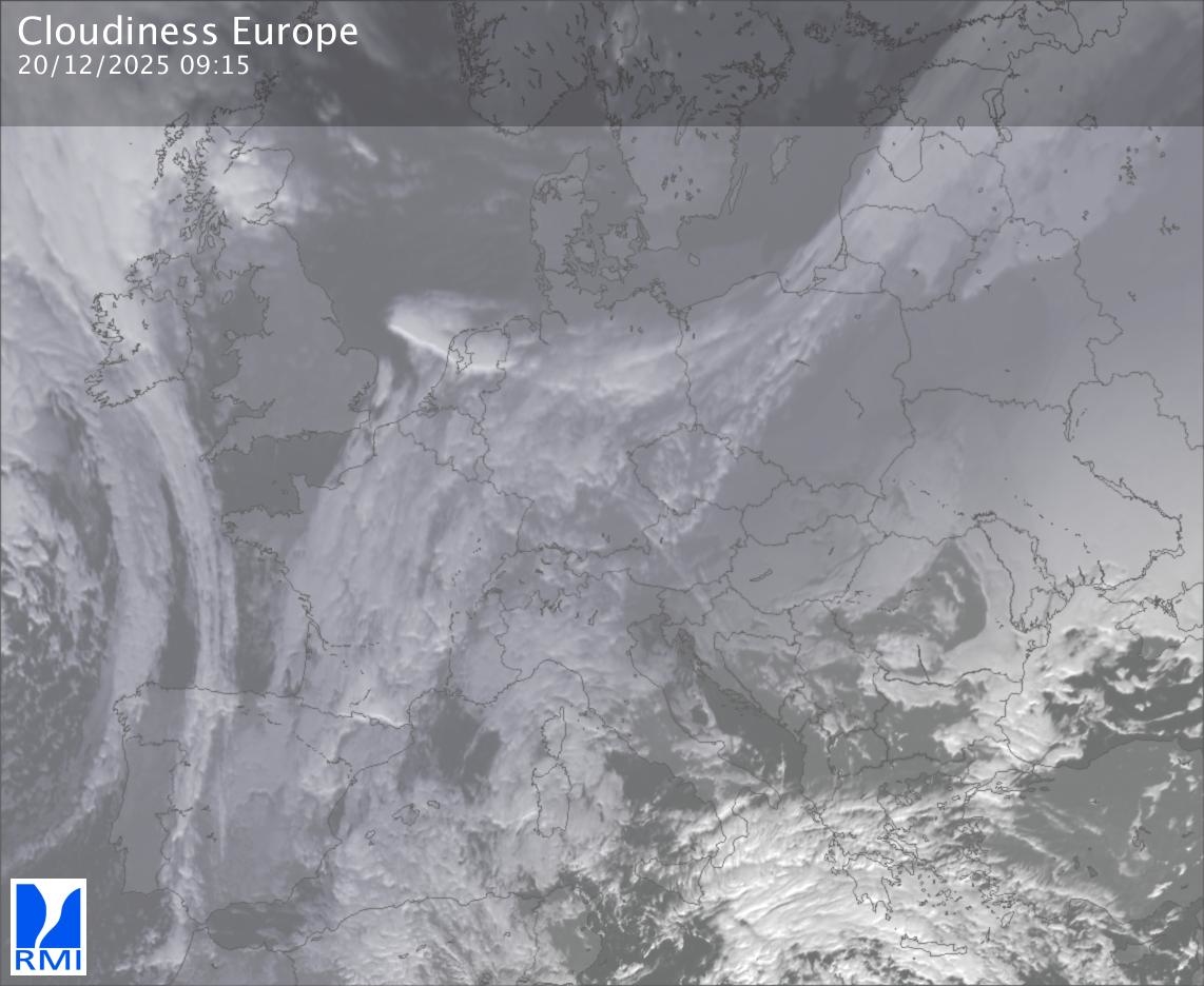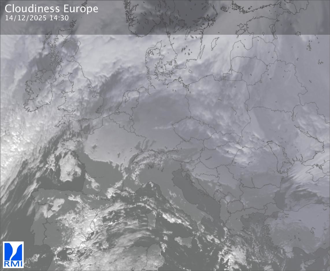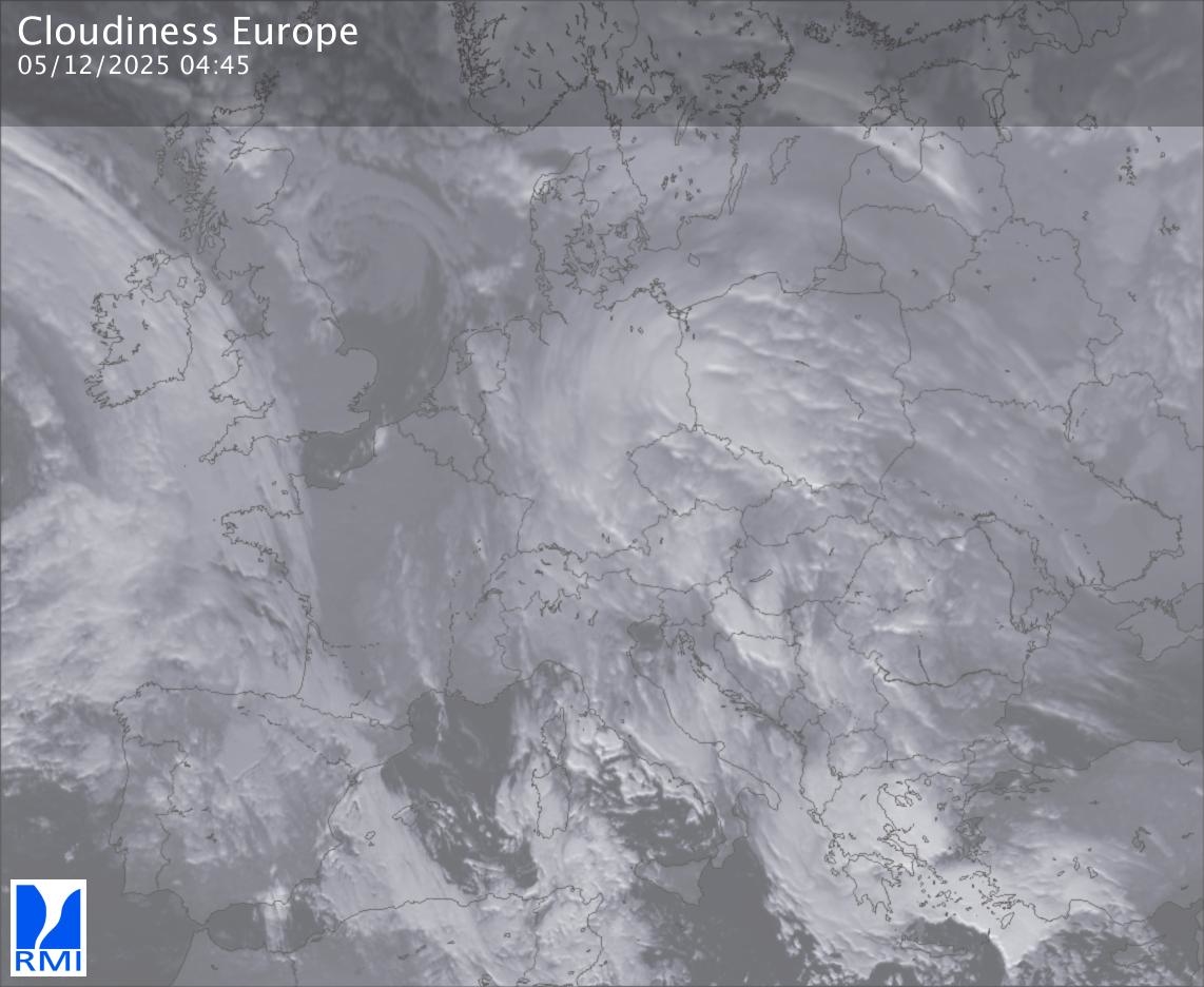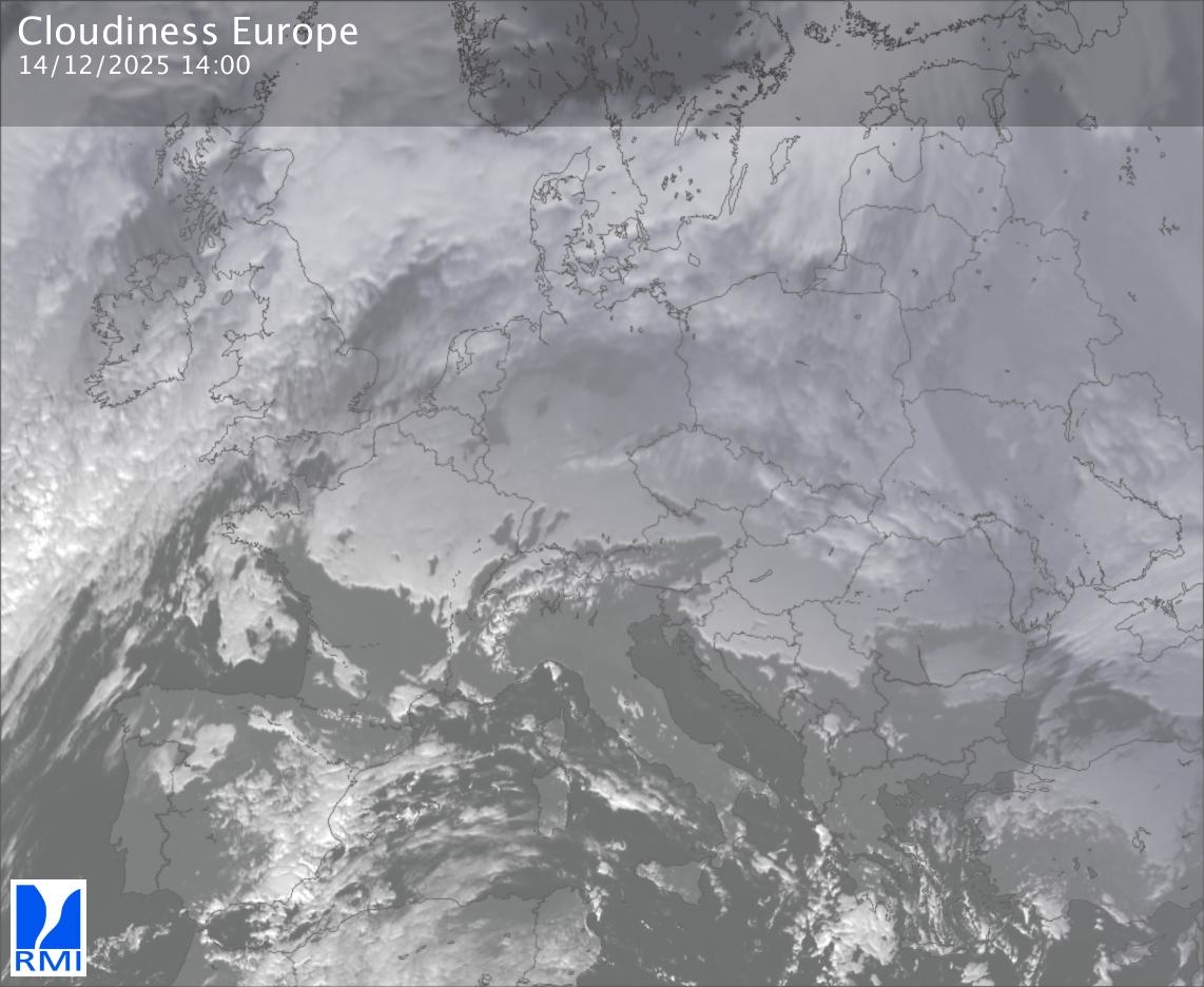 The satellite image of Europe is composed by using both the infrared and the visible light channel from the satellite. Because there are no usable visible light images during the night this composition of channels gives us an image that can be used to observe the clouds by day and by night. The pixelated artifacts are due to the lower resolution of the infrared channel.