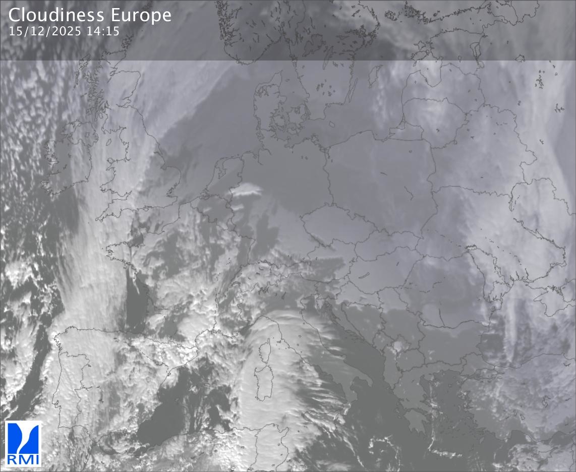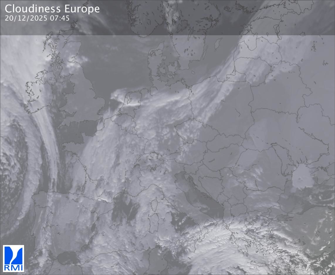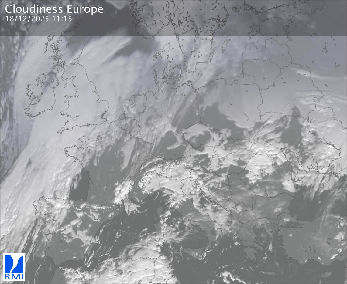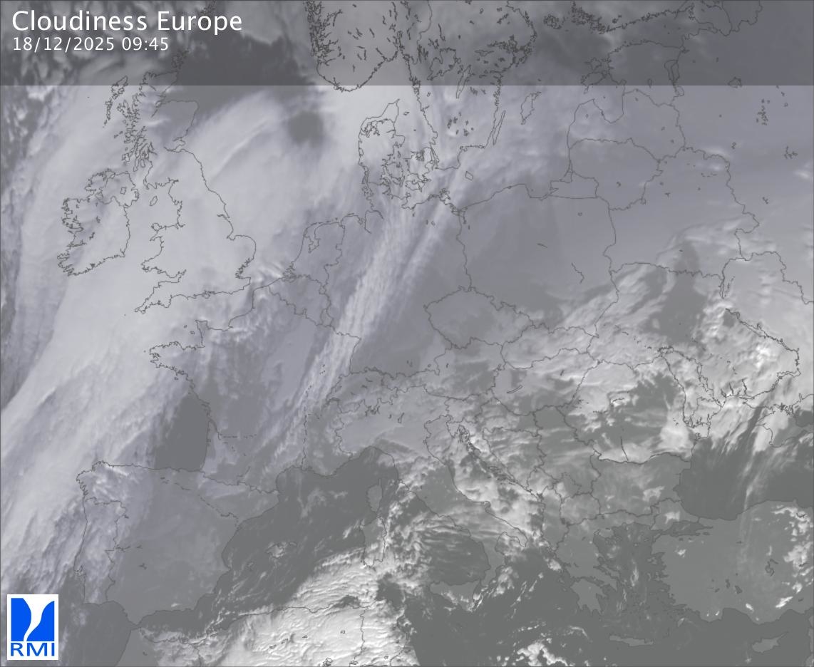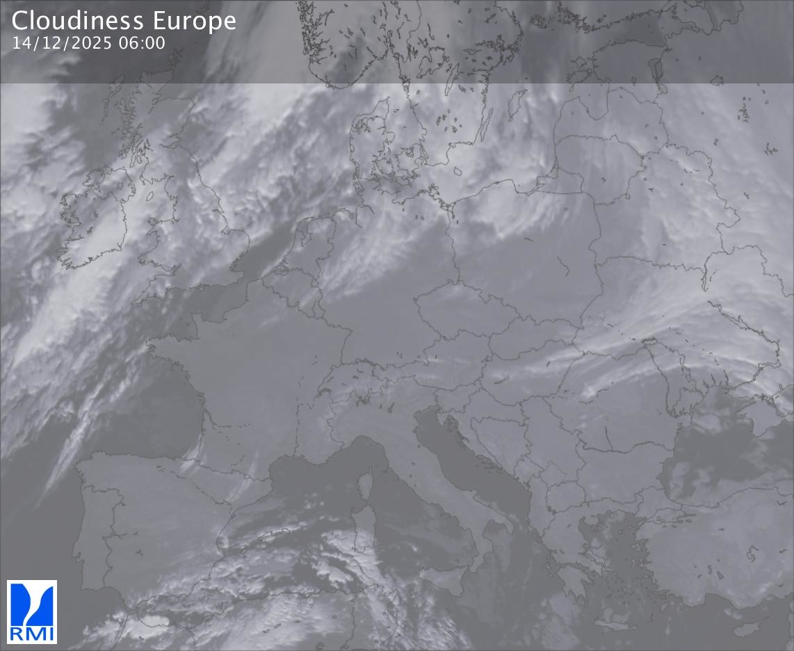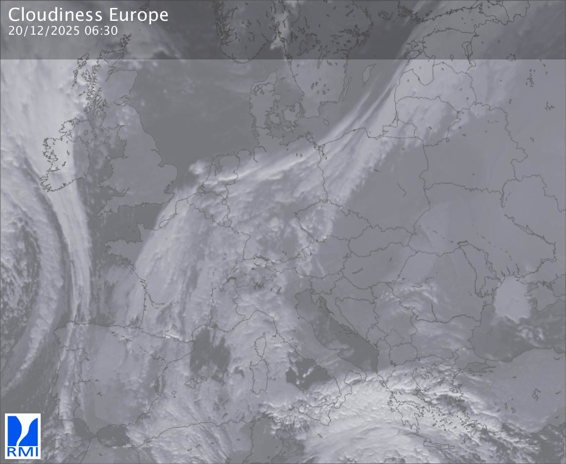 The satellite image of Europe is composed by using both the infrared and the visible light channel from the satellite. Because there are no usable visible light images during the night this composition of channels gives us an image that can be used to observe the clouds by day and by night. The pixelated artifacts are due to the lower resolution of the infrared channel.