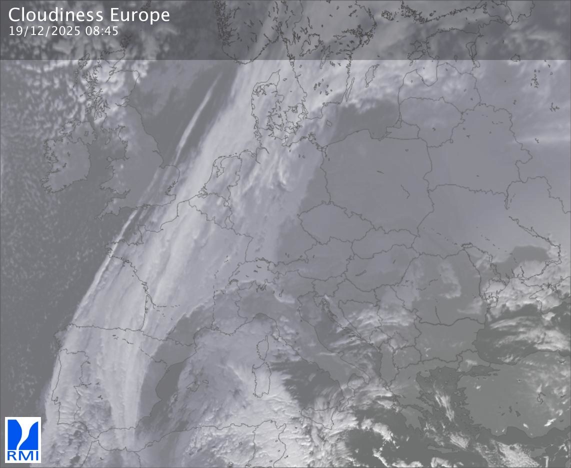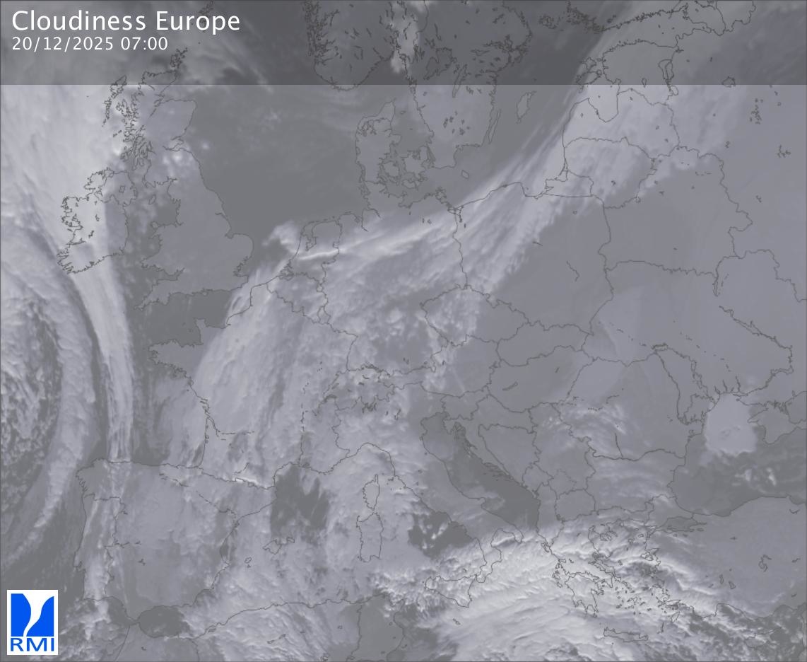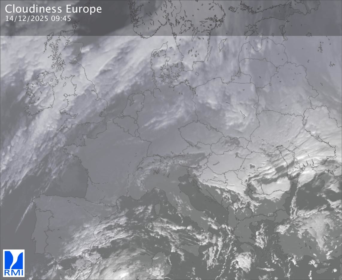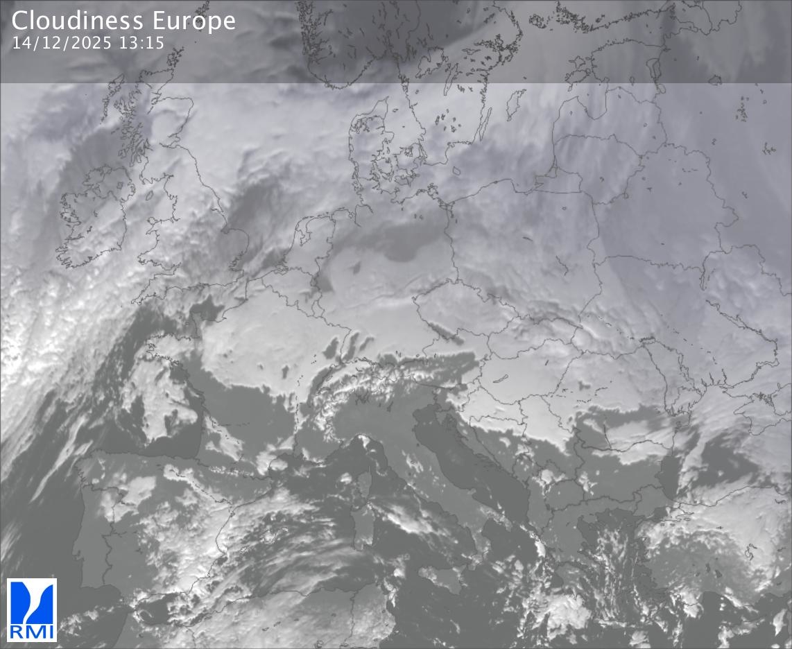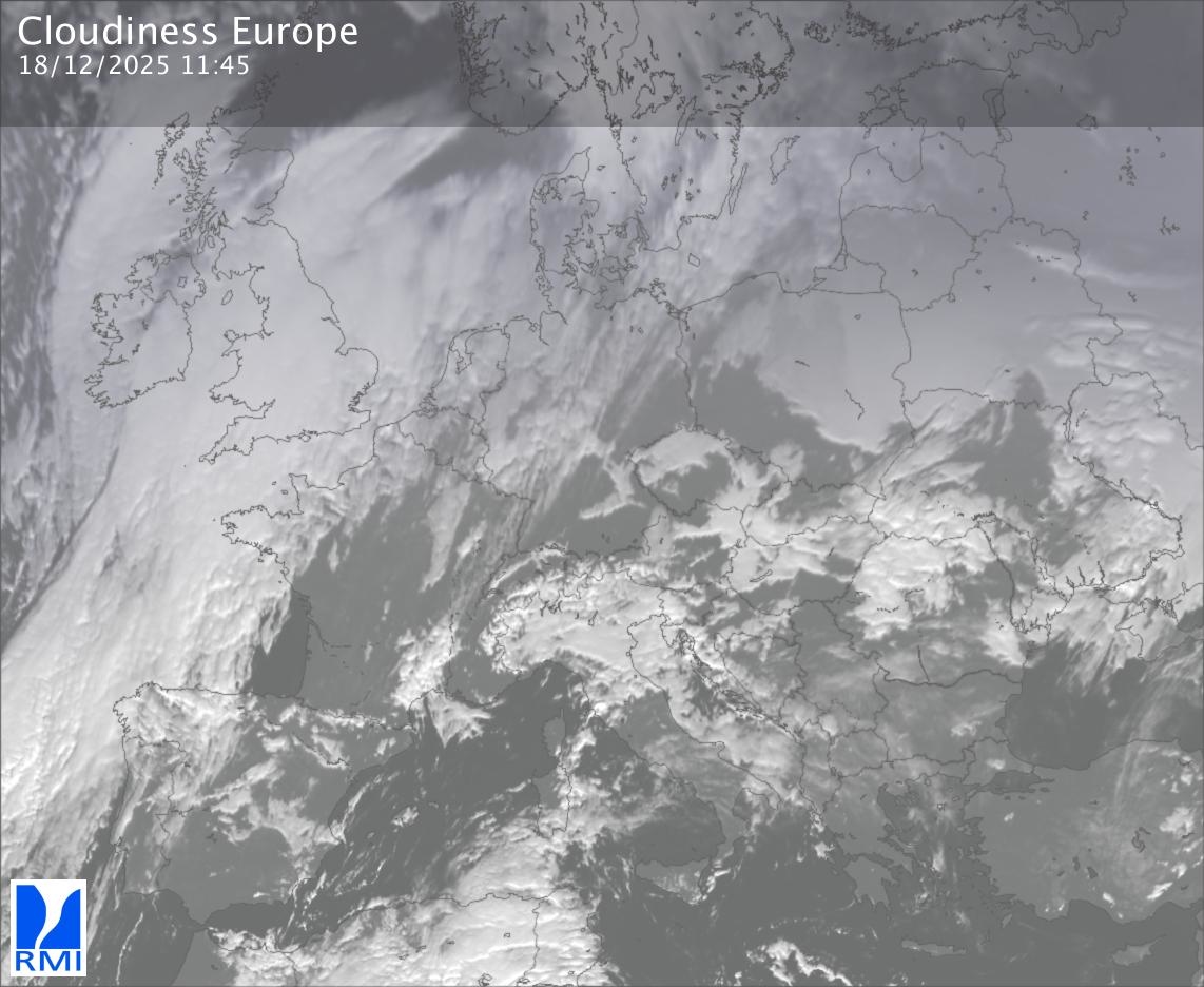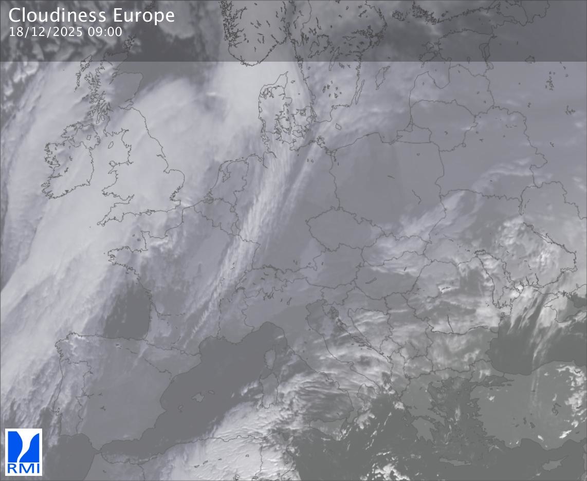 The satellite image of Europe is composed by using both the infrared and the visible light channel from the satellite. Because there are no usable visible light images during the night this composition of channels gives us an image that can be used to observe the clouds by day and by night. The pixelated artifacts are due to the lower resolution of the infrared channel.