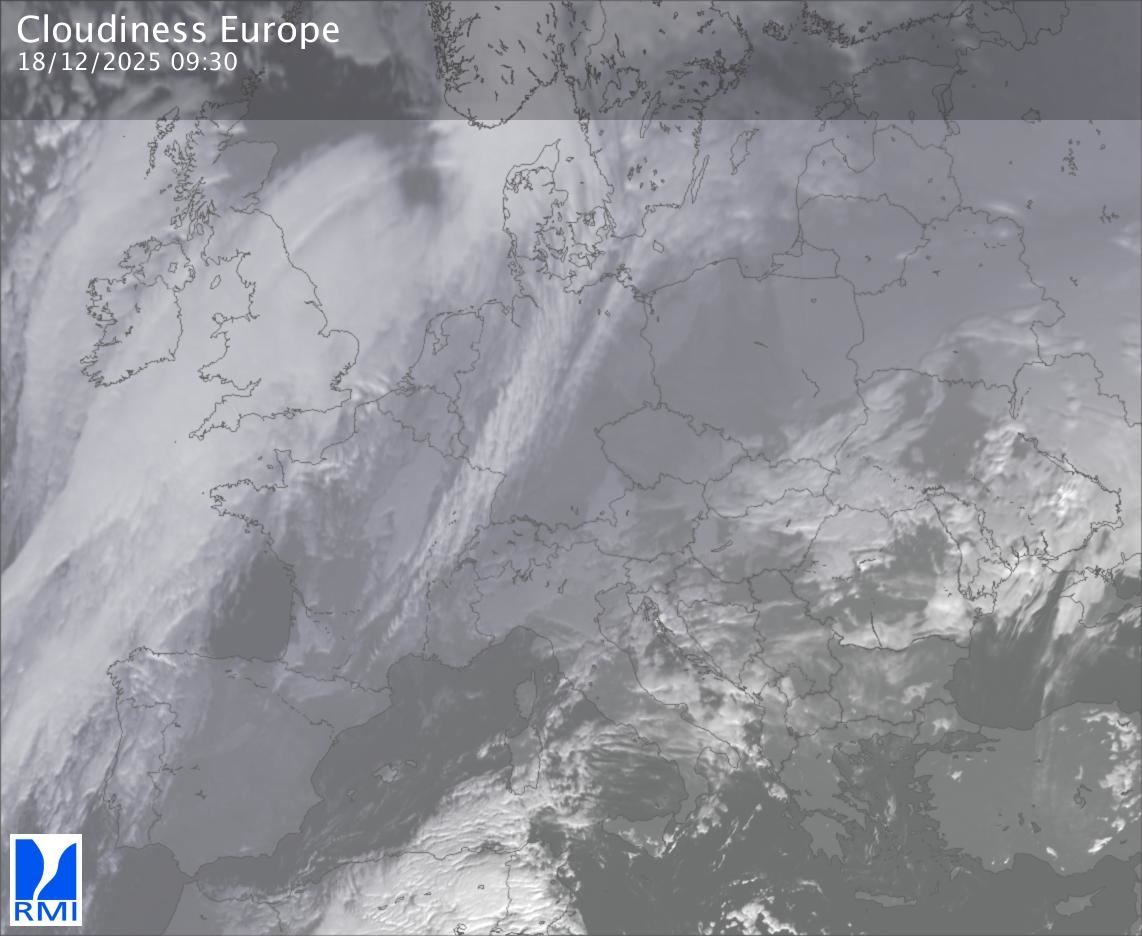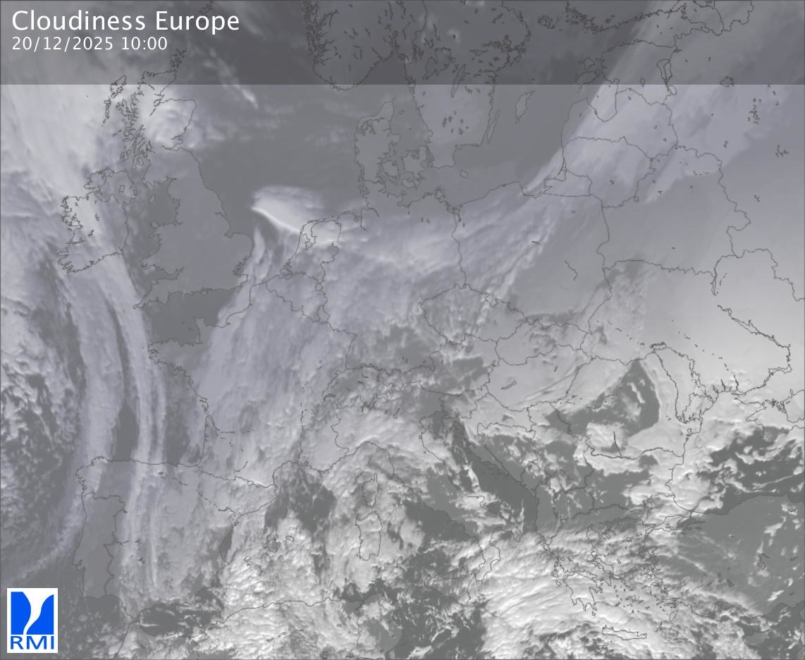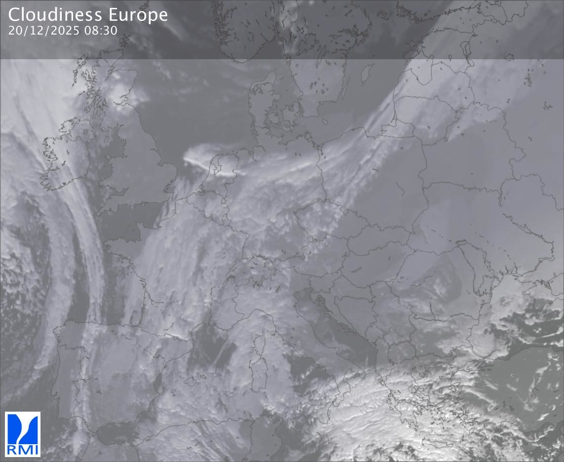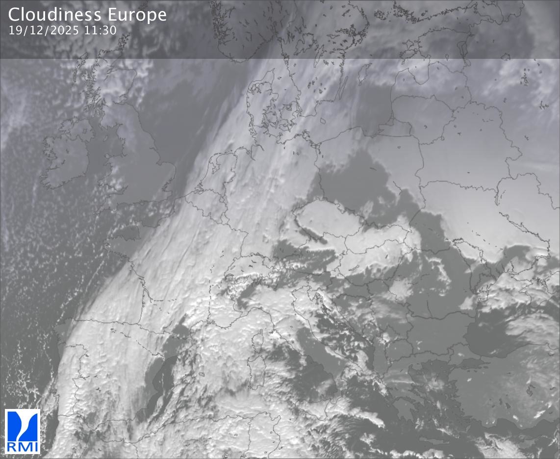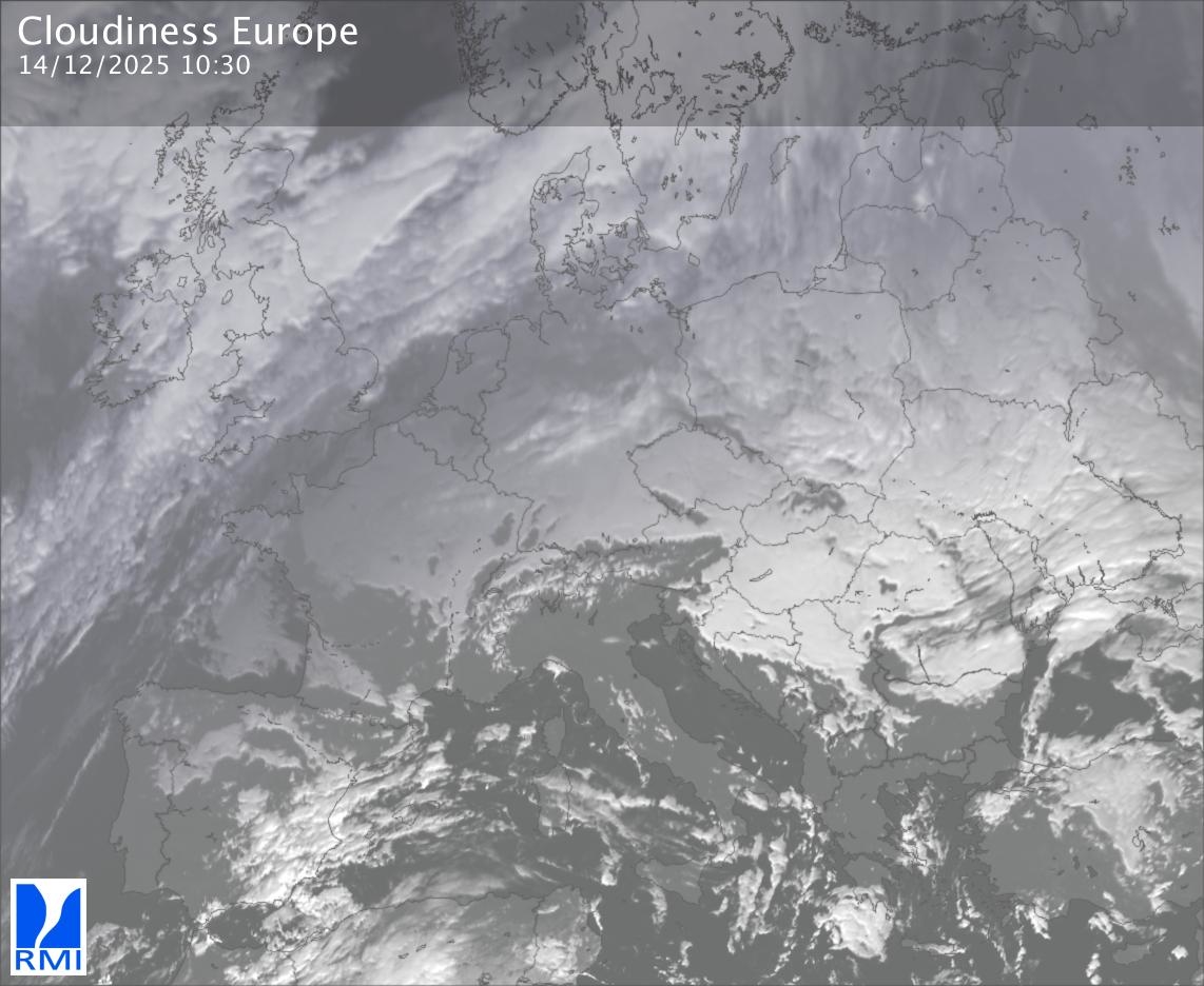 The satellite image of Europe is composed by using both the infrared and the visible light channel from the satellite. Because there are no usable visible light images during the night this composition of channels gives us an image that can be used to observe the clouds by day and by night. The pixelated artifacts are due to the lower resolution of the infrared channel.