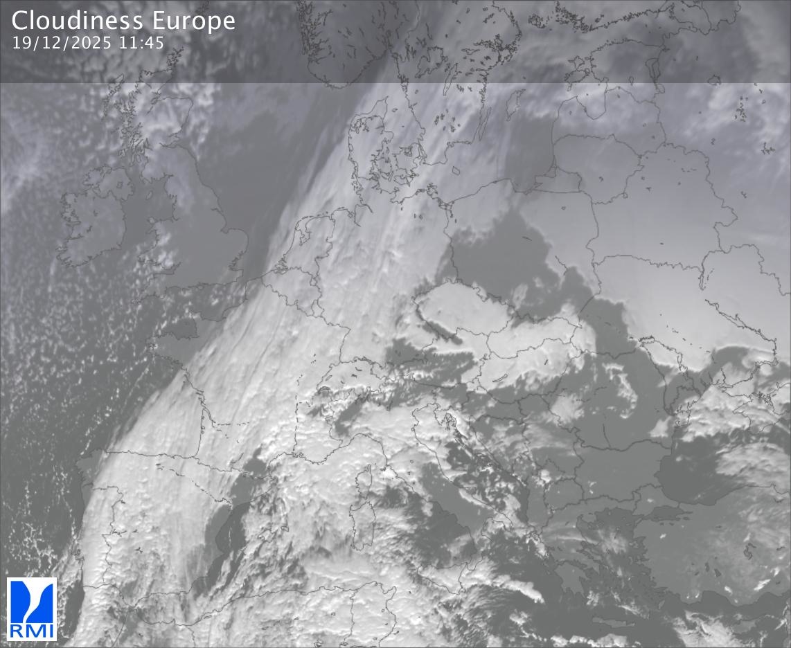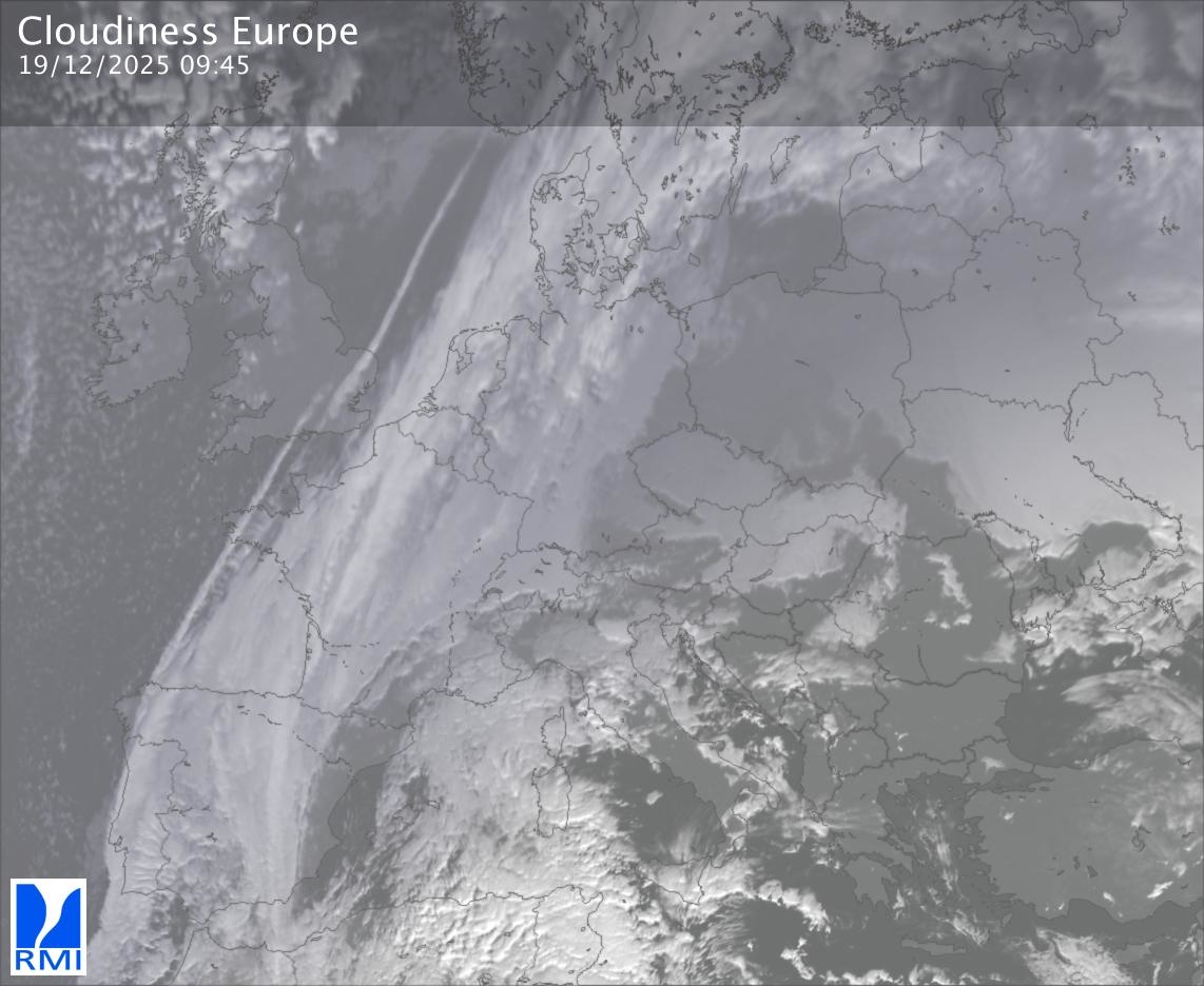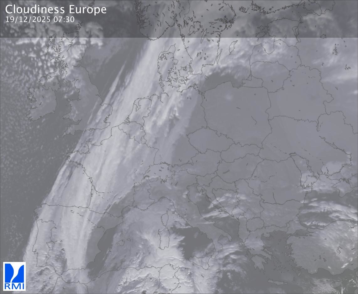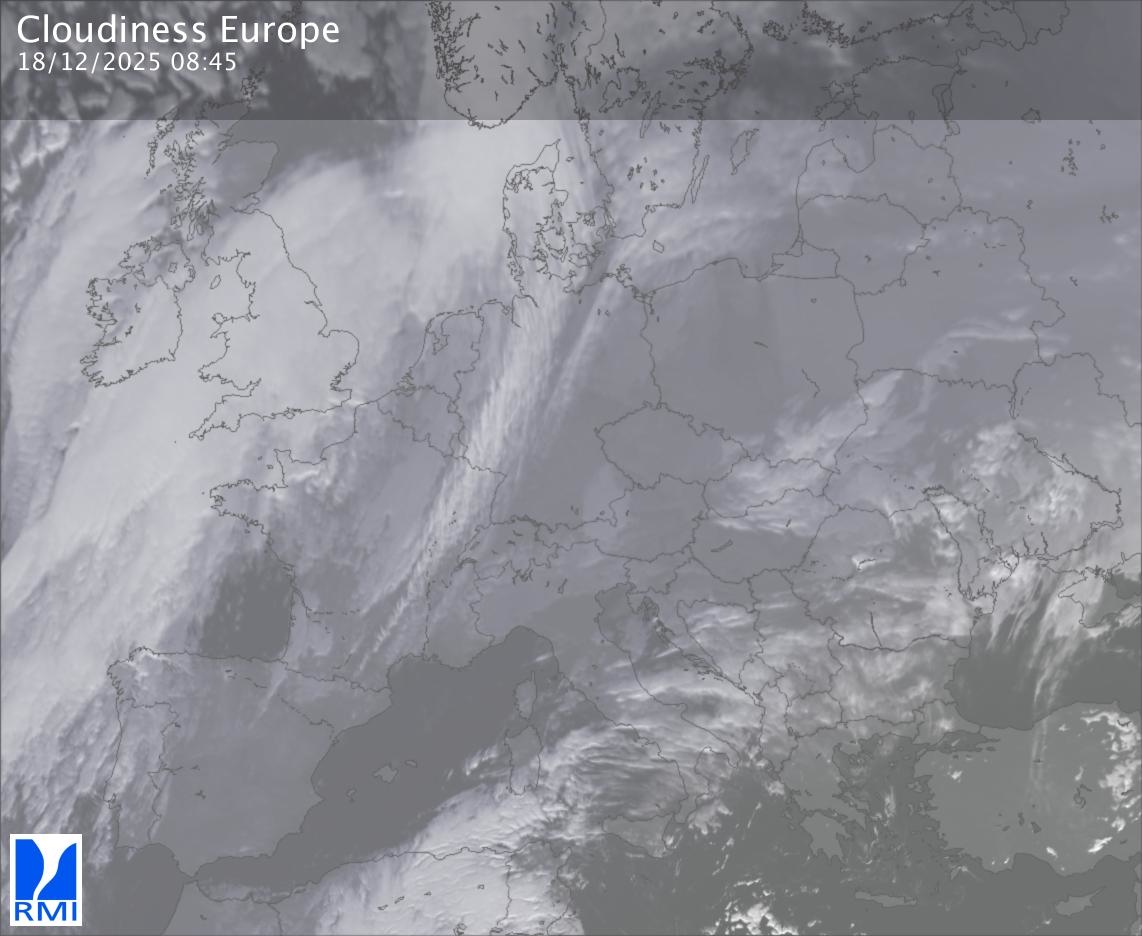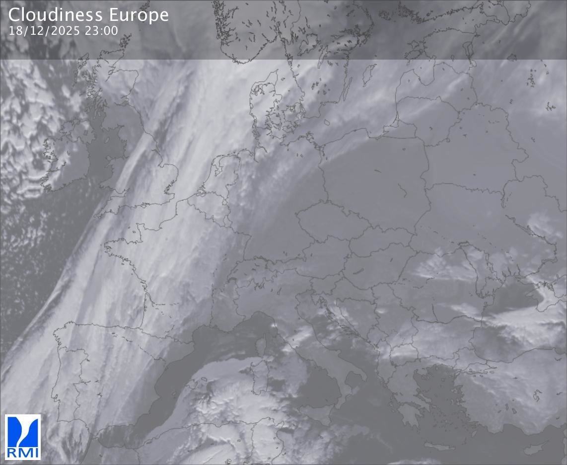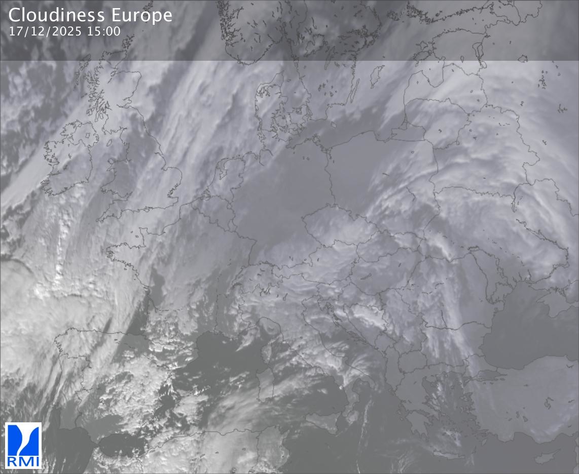 The satellite image of Europe is composed by using both the infrared and the visible light channel from the satellite. Because there are no usable visible light images during the night this composition of channels gives us an image that can be used to observe the clouds by day and by night. The pixelated artifacts are due to the lower resolution of the infrared channel.
