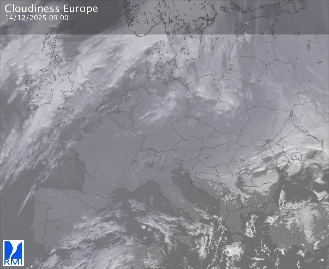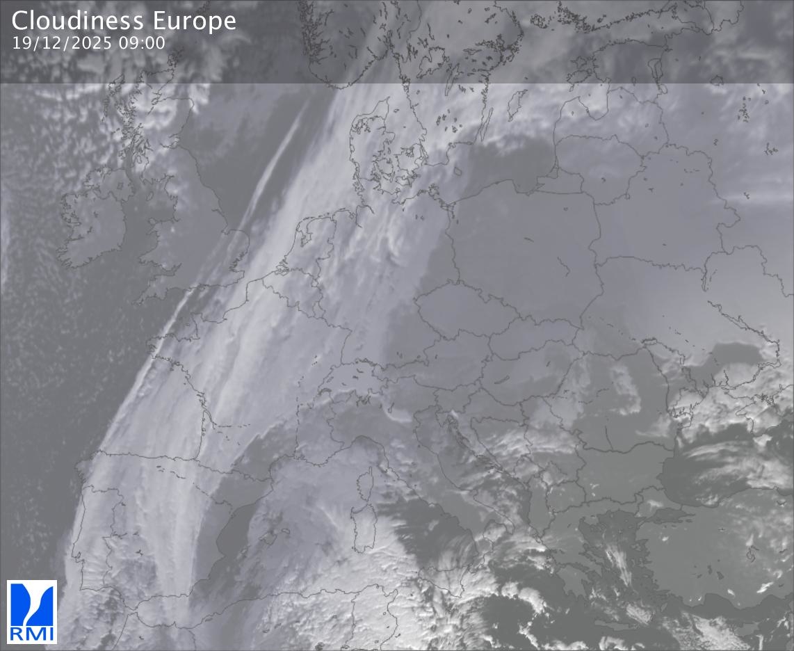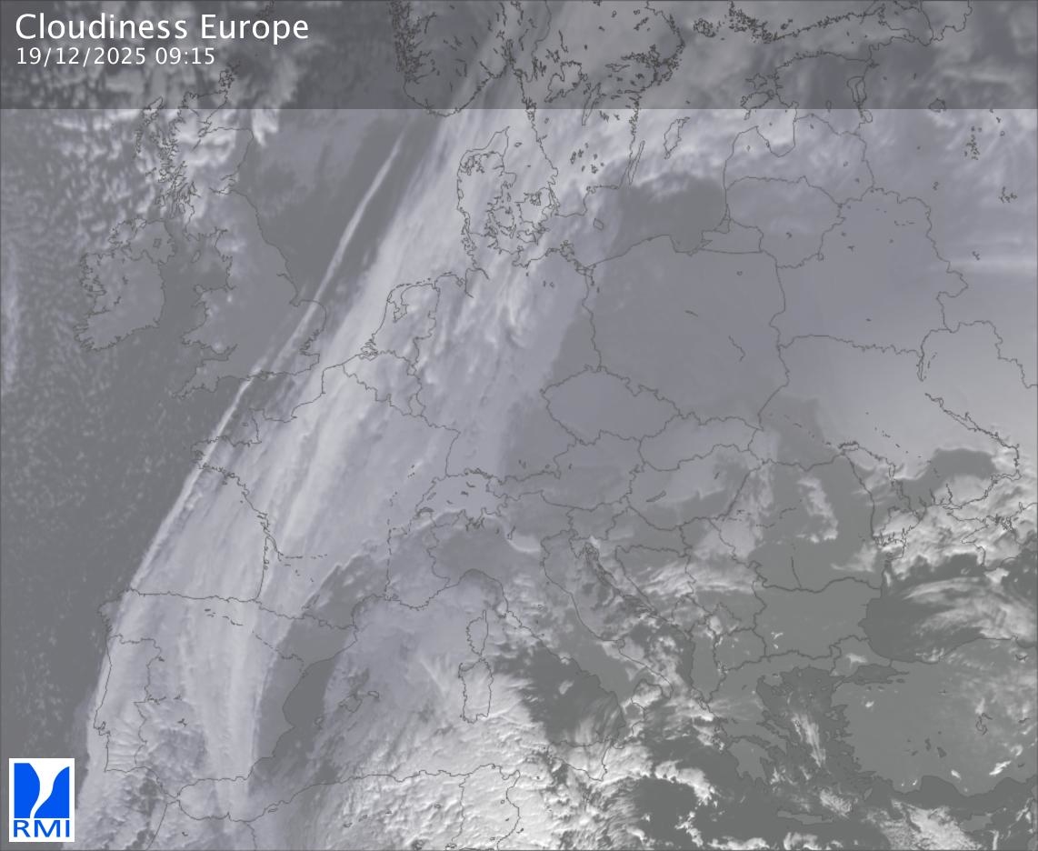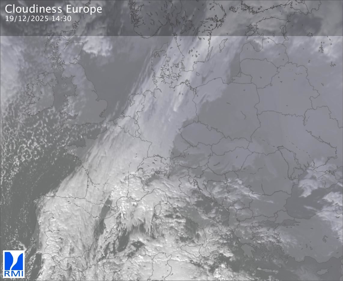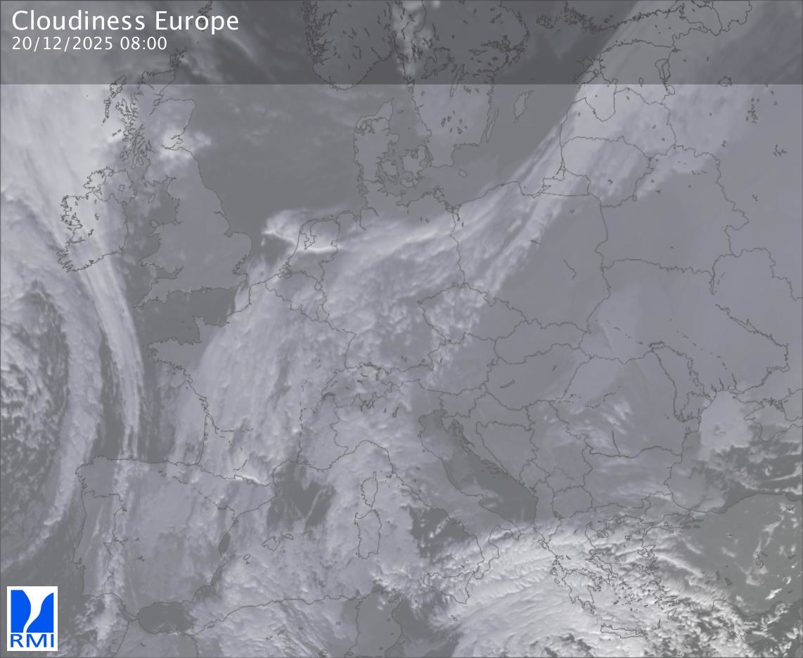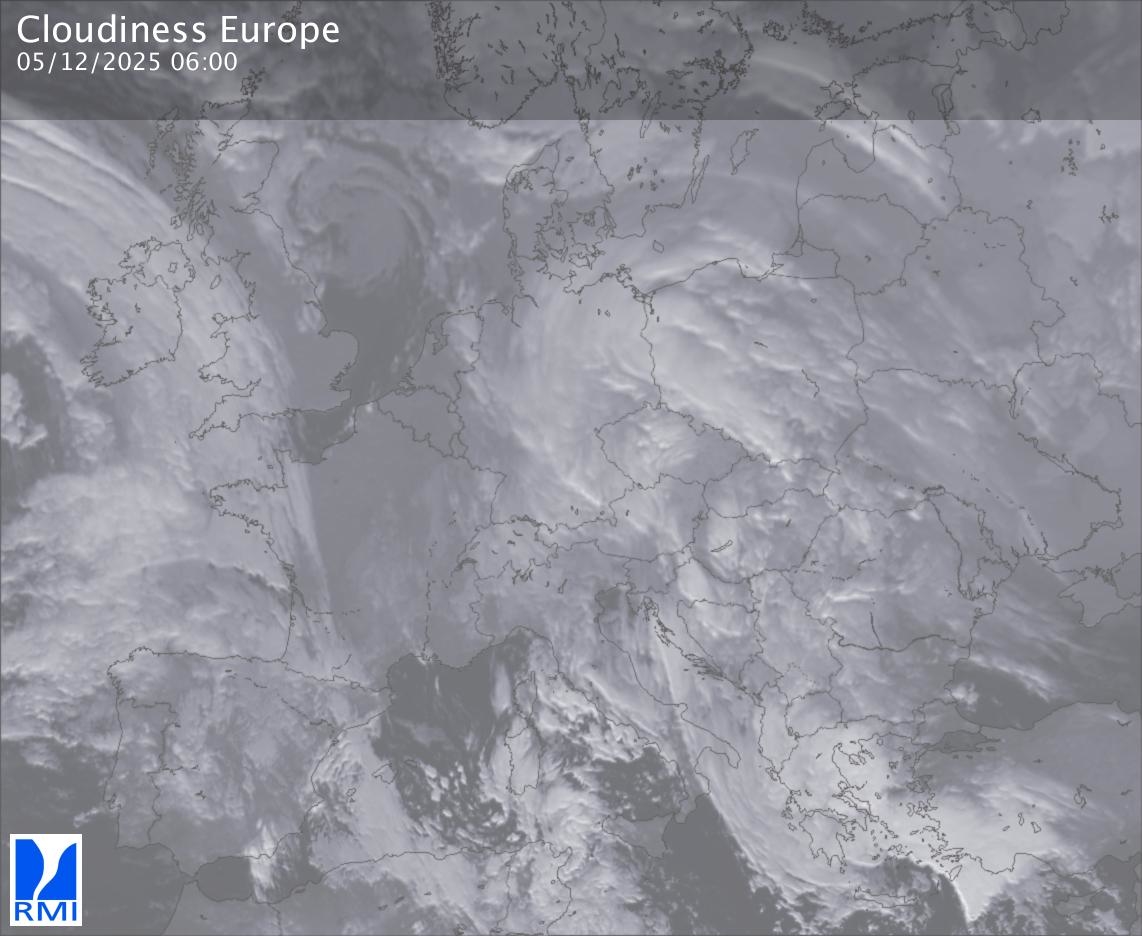 The satellite image of Europe is composed by using both the infrared and the visible light channel from the satellite. Because there are no usable visible light images during the night this composition of channels gives us an image that can be used to observe the clouds by day and by night. The pixelated artifacts are due to the lower resolution of the infrared channel.