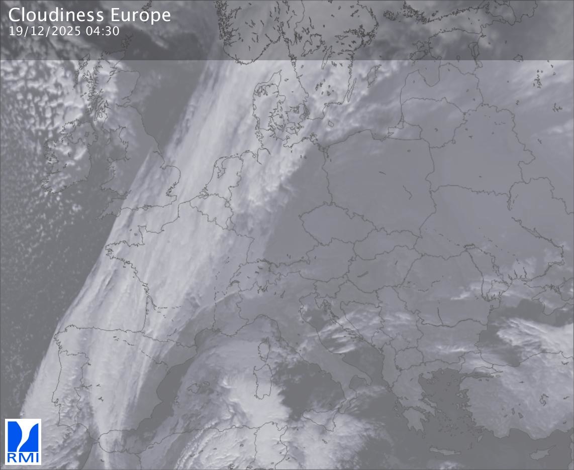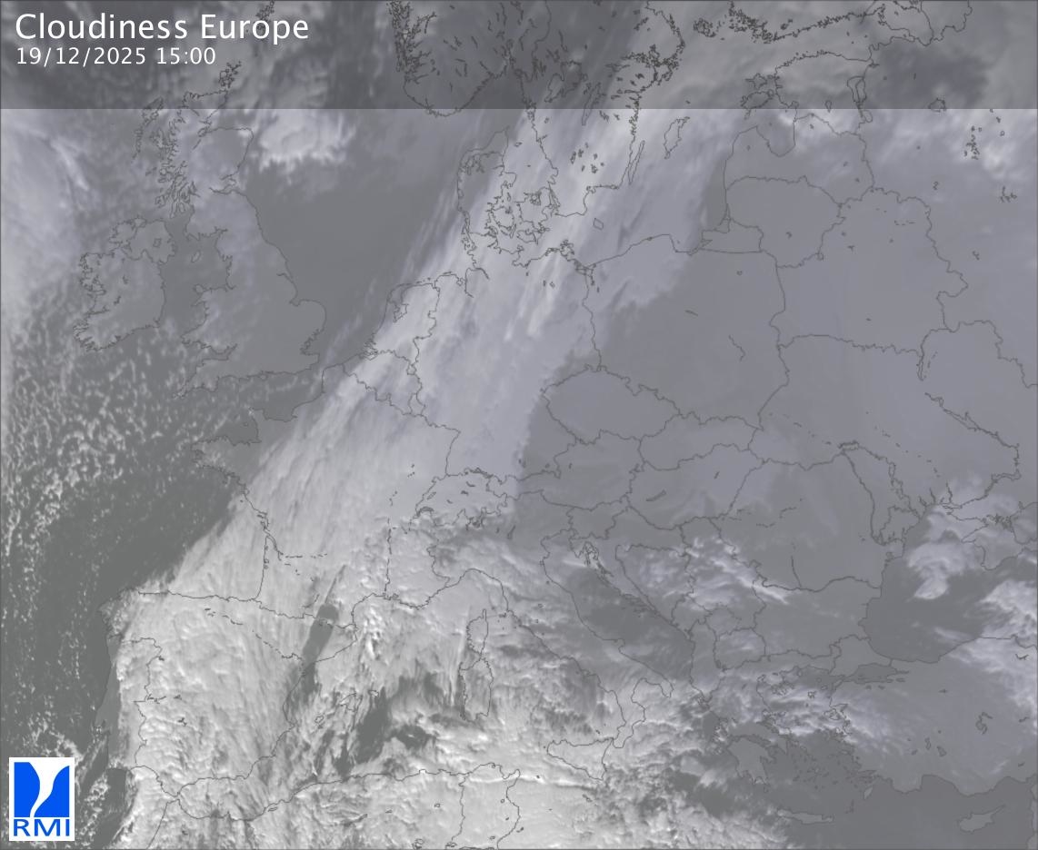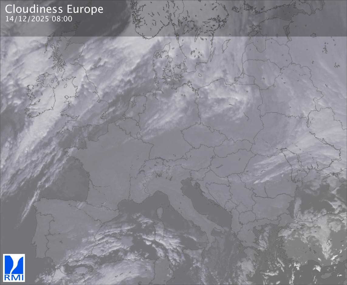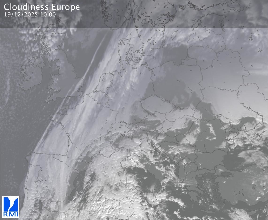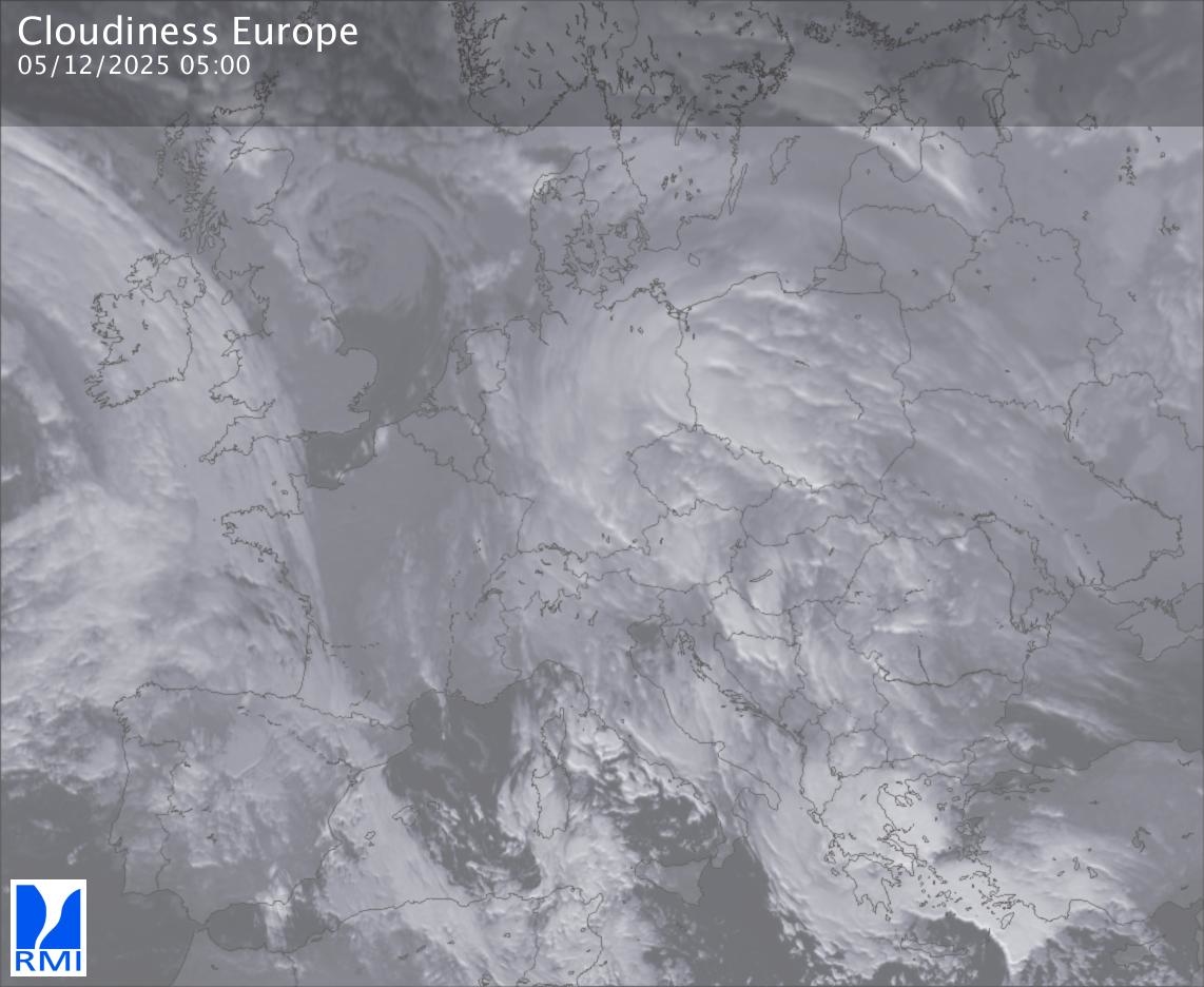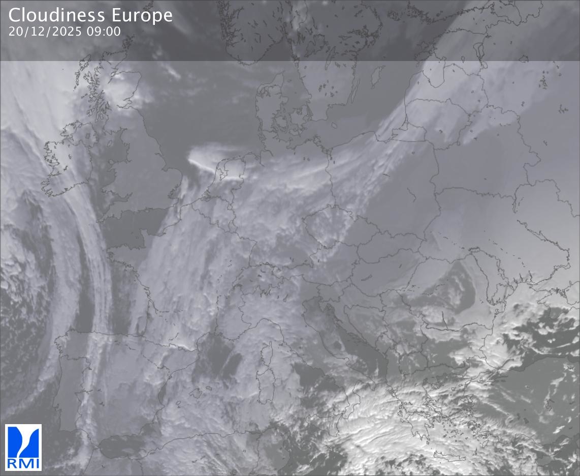 The satellite image of Europe is composed by using both the infrared and the visible light channel from the satellite. Because there are no usable visible light images during the night this composition of channels gives us an image that can be used to observe the clouds by day and by night. The pixelated artifacts are due to the lower resolution of the infrared channel.