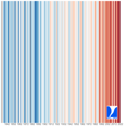Il s'agit des bandes de réchauffement ou les barres climatiques pour Uccle. Chaque bande verticale correspond à une année, de 1833 à 2022. La couleur de chaque ligne correspond à l'évolution de la température annuelle moyenne à Uccle par rapport à la température moyenne de la période 1850-1900. Ainsi, le bleu correspond aux années relativement froides et le rouge aux années relativement chaudes. Depuis le début des mesures en 1833, la température moyenne annuelle à Uccle a varié de 7°C (1879) à 12,2°C (2020 et 2022). Le réchauffement est également clairement visible à Uccle : les barres climatiques de droite montrent beaucoup plus d'années rouges et donc plus chaudes.