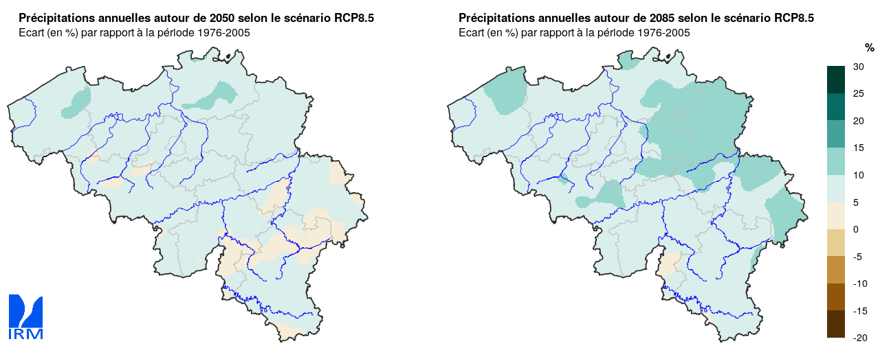 Evolutions des précipitations moyennes prévues en Belgique pour les périodes futures 2036-2065 (figure de gauche) et 2071-2100 (figure de droite) par rapport à la période de 1976 à 2005.