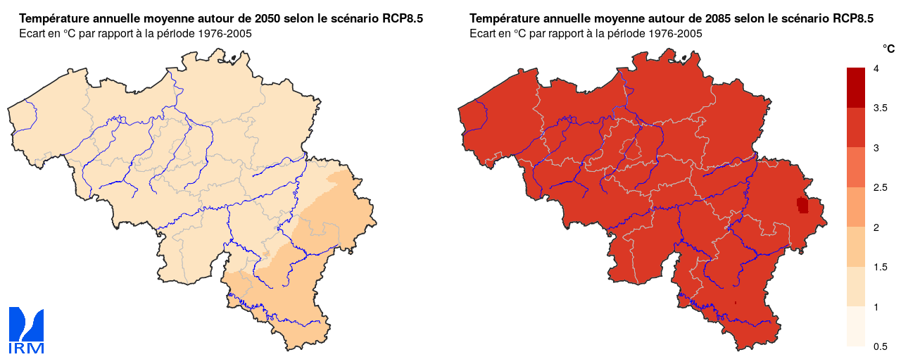 Selon le scénario, le changement pour la Belgique se situe entre 0,7 et 5 ° C d'ici la fin du siècle. En général, une augmentation plus importante est attendue en hiver par rapport à l'été.