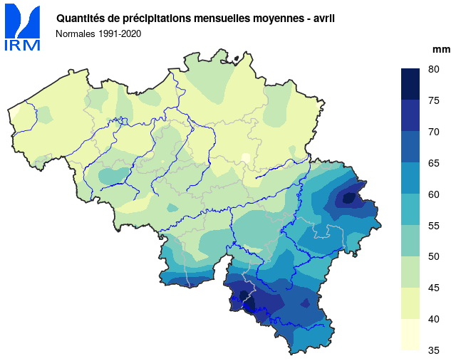 Au niveau saisonnier, en moyenne sur le pays, les quantités de précipitations sont les plus abondantes en hiver et les plus faibles au printemps. Le mois de décembre est le plus pluvieux (100 mm en moyenne) tandis que le mois d’avril est le plus sec (50 mm en moyenne). D'avril à septembre, les précipitations sont maximales dans les Hautes Fagnes, tandis que d'octobre à mars, elles sont maximales dans la zone Libramont-Carlsbourg-Bouillon. Les quantités mensuelles de précipitations en région côtière sont généralement parmi les plus faibles du pays, excepté en automne où l'on observe un gradient négatif de la côté vers l'intérieur du pays lié à la température plus élevée de la mer en cette saison. Les quantités de précipitations sont également faibles dans la partie nord de la Hesbaye (région de Saint-Trond), excepté d'avril à août. Elles y sont même minimales de septembre à décembre.