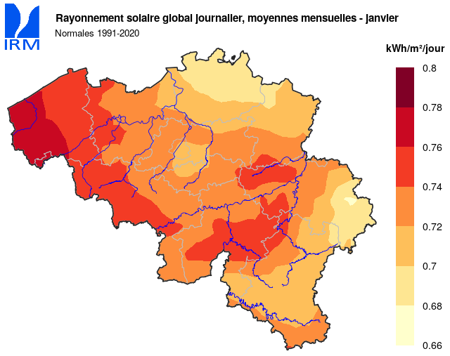 Les normales mensuelles varient d'un facteur 10 entre 545 Wh/m² en décembre et 5270 Wh/m² en juin, en moyenne sur la Belgique.