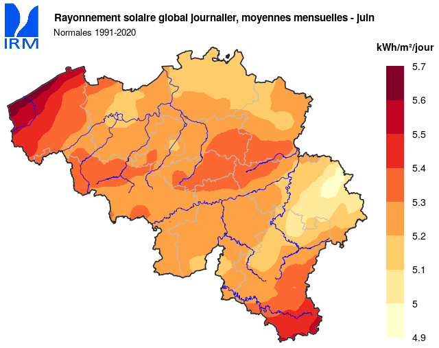 Les normales mensuelles varient d'un facteur 10 entre 545 Wh/m² en décembre et 5270 Wh/m² en juin, en moyenne sur la Belgique.
