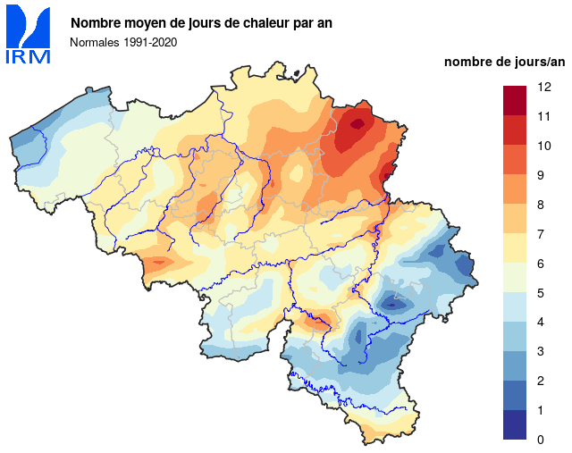 Les répartitions spatiales du nombre de jours de printemps, d'été et de chaleur présentent de grandes similitudes : valeurs maximales en Campine, valeurs minimales dans les Hautes Fagnes ainsi que pour certains sommets de l'Ardenne, et gradient positif de la côte vers l'intérieur du pays en basse et moyenne Belgique. Les normales du nombre de jours de gel, de gel sévère et d'hiver semblent peu influencées par la proximité de la mer et présentent une distribution relativement uniforme en basse et moyenne Belgique. Les variations sont par contre importantes en haute Belgique, avec des valeurs maximales dans les Hautes Fagnes.