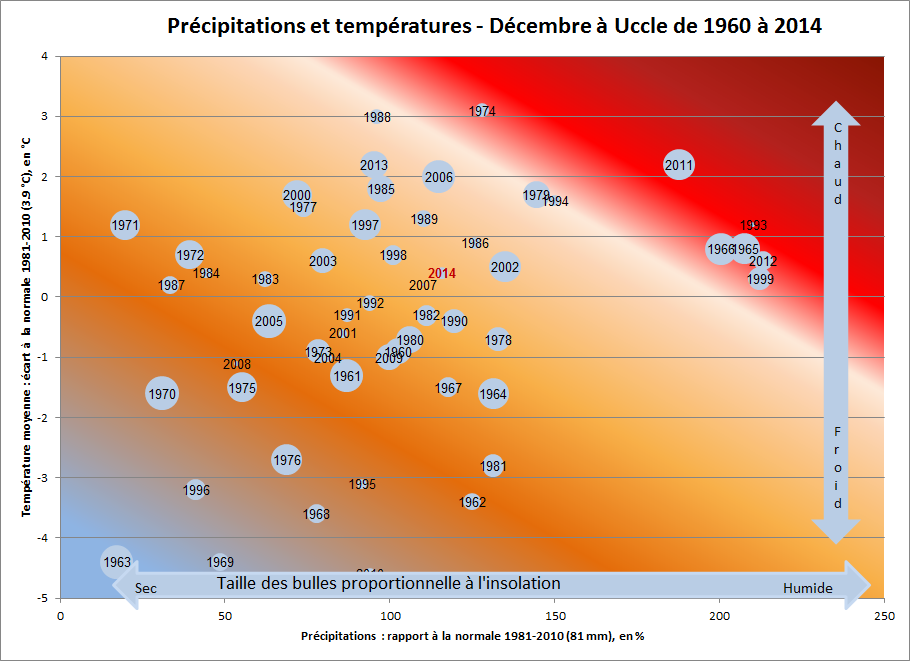 Remarque : à partir du bilan climatologique mensuel de janvier 2011, les normales et les valeurs record (+ et -) données dans le tableau ci-dessous sont calculées pour tous les paramètres sur la période 1981–2010. Cette période de 30 ans est la nouvelle période de référence choisie pour le calcul des normales (moyennes sur la période) à Uccle.